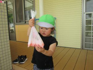 タライの水をカップに入れて「ジュースをどうぞ」と水のジュース屋さんが始まりました。
