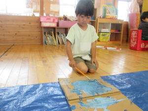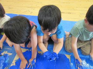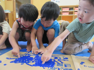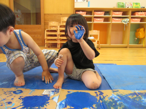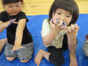 絵の具はどんな感触だったかな?色々な感触あそびを楽しんでほしい。