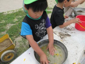 戸外で拾った花を水と一緒にタライに入れ、花の色を水の中に出して色水を作ろうとする姿がありました。