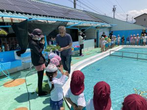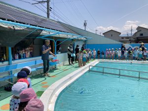 園長先生からのお話を聞いた後、プールにお酒、お塩を入れて、お清めをしました。