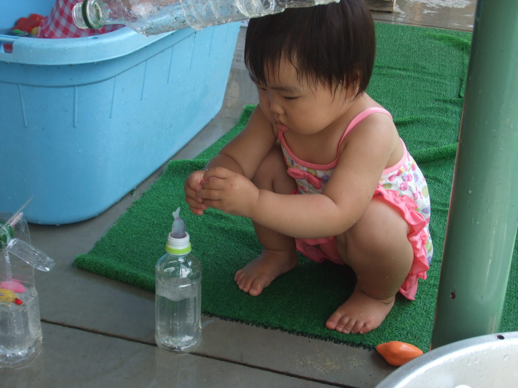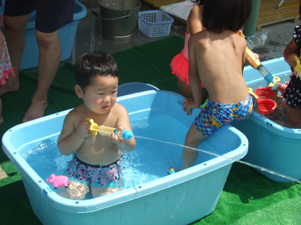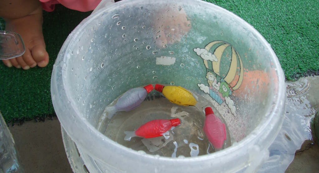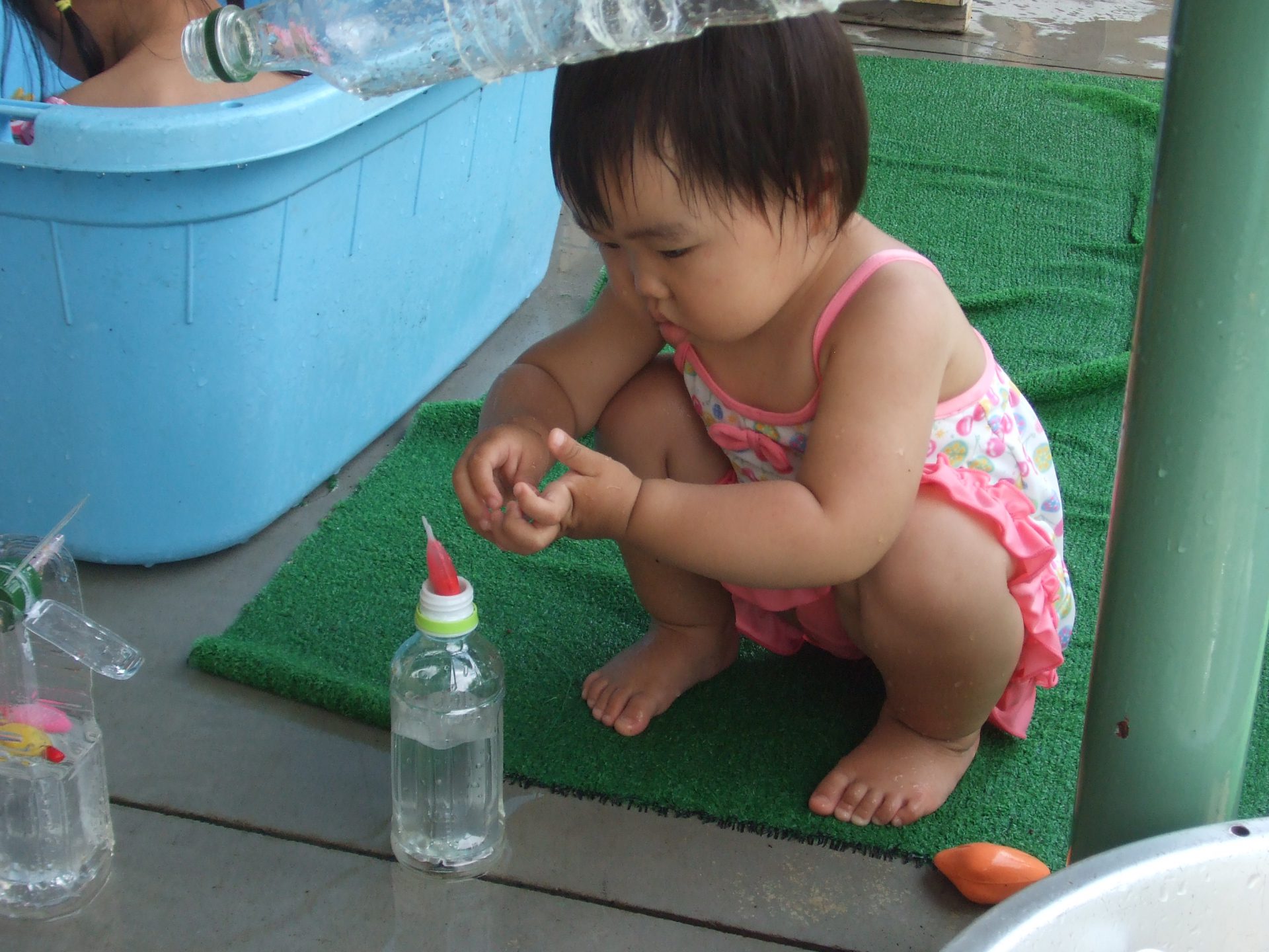 水鉄砲で大はしゃぎの2歳児の横では、1歳児の女の子が金魚で遊んでいました。