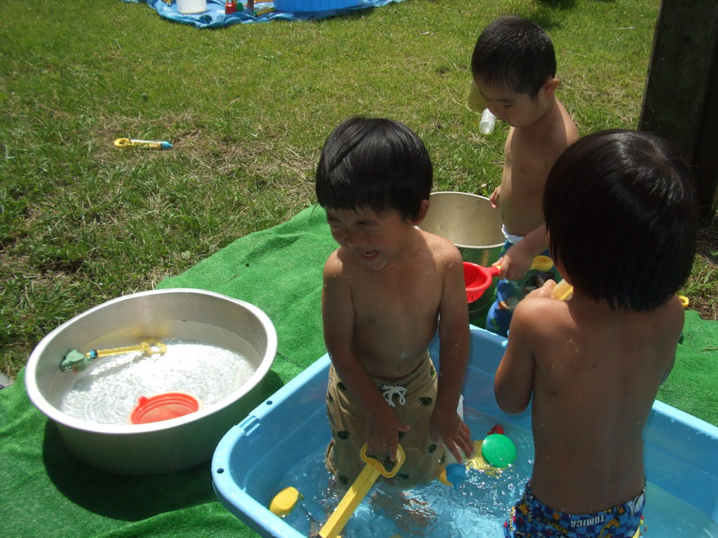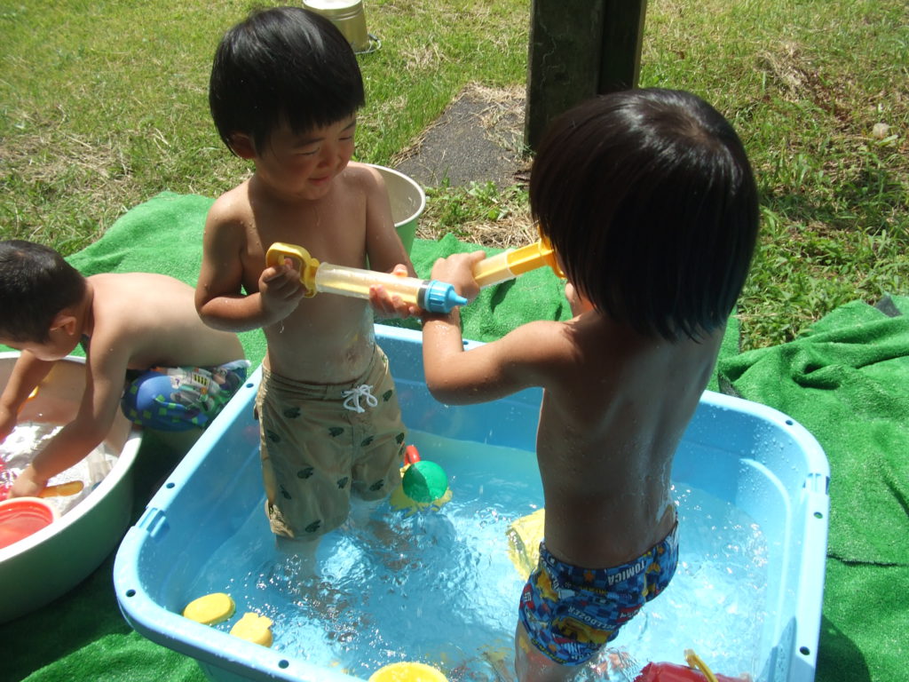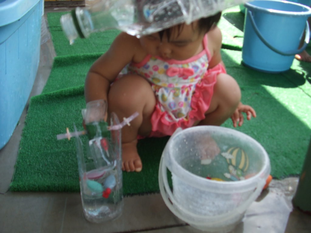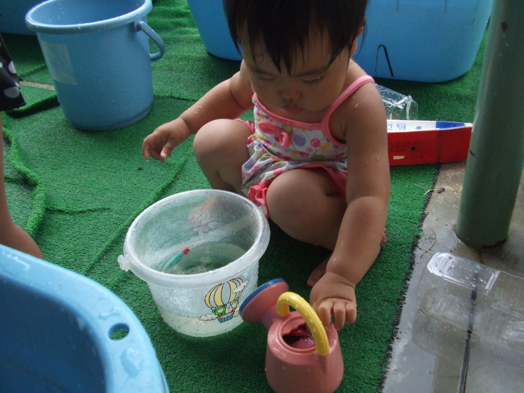 水鉄砲で大はしゃぎの2歳児の横では、1歳児の女の子が金魚で遊んでいました。