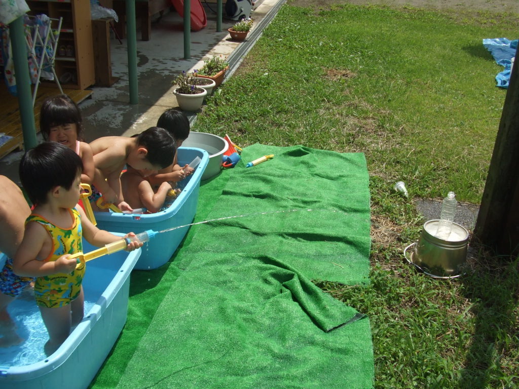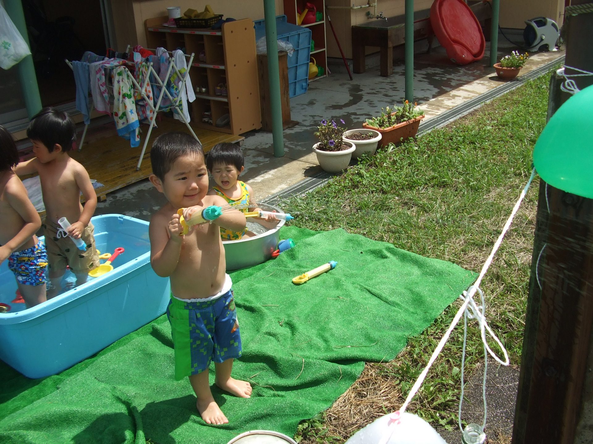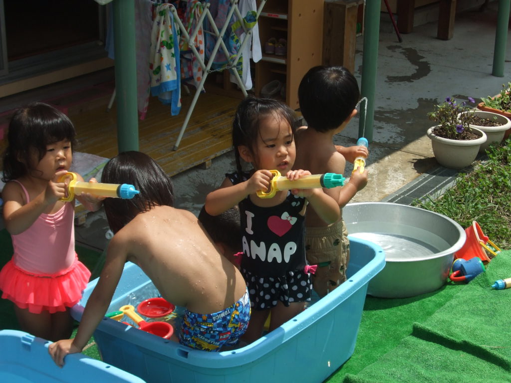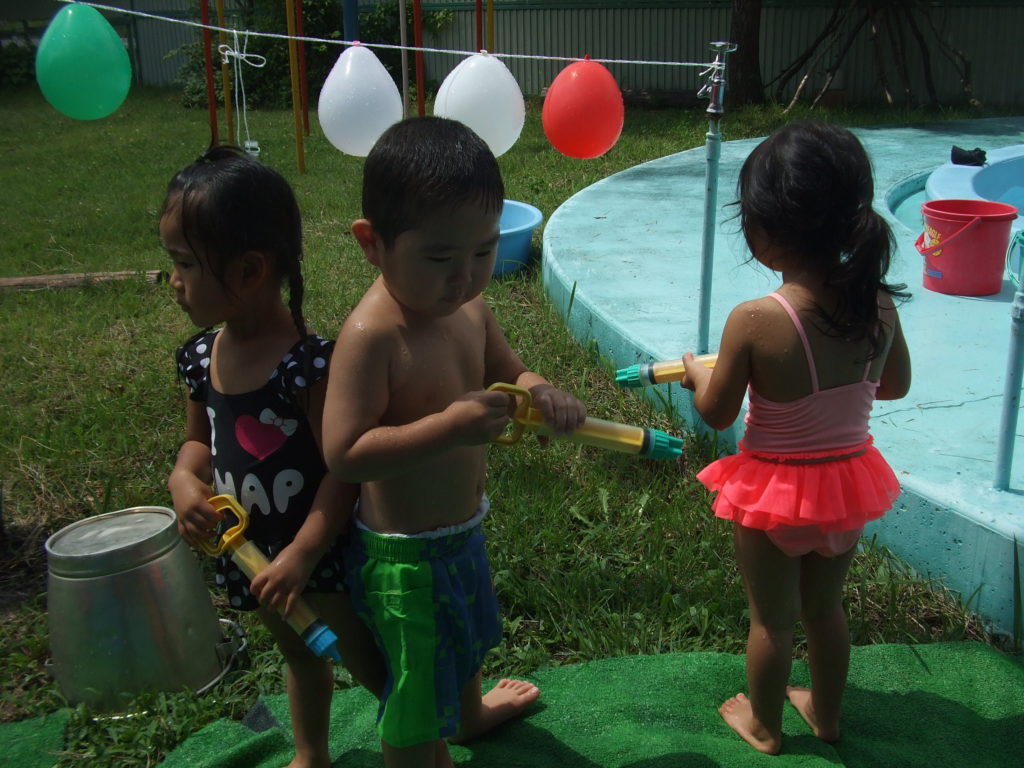 毎日のプール遊びの中で、水鉄砲を楽しんでいた子ども達。水を遠くまで飛ばせるようになってきたので、的を作って遊ぶことにしました。