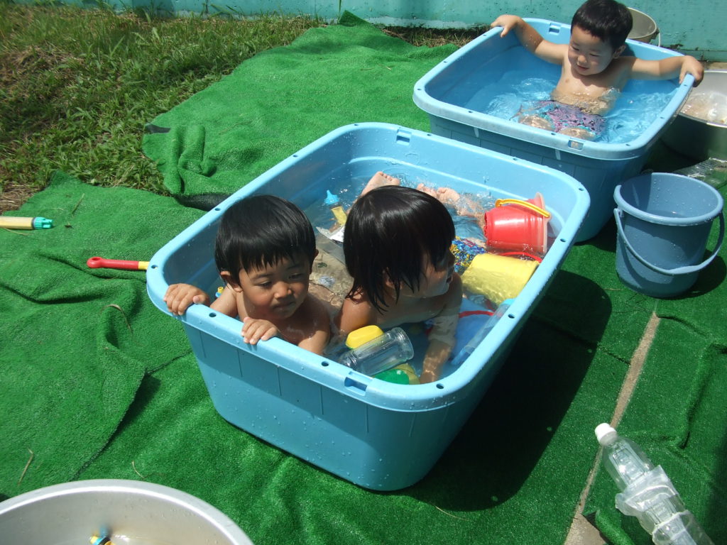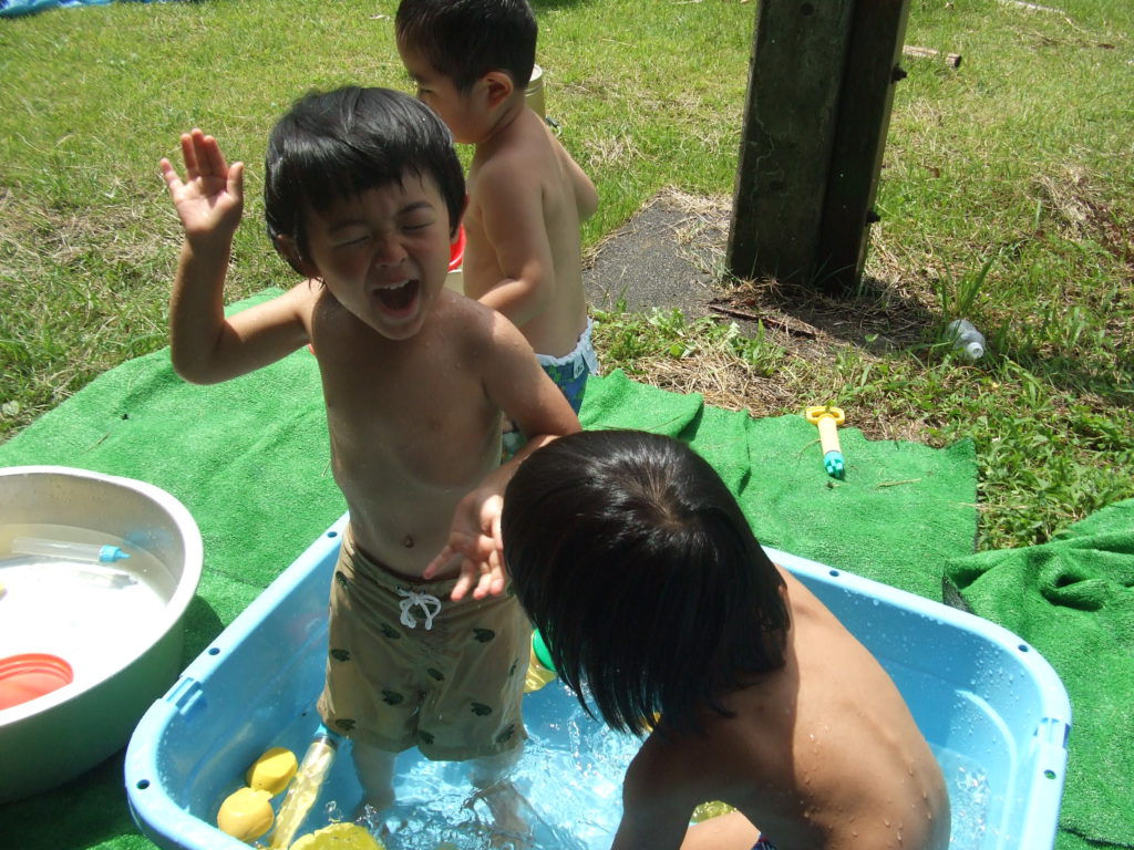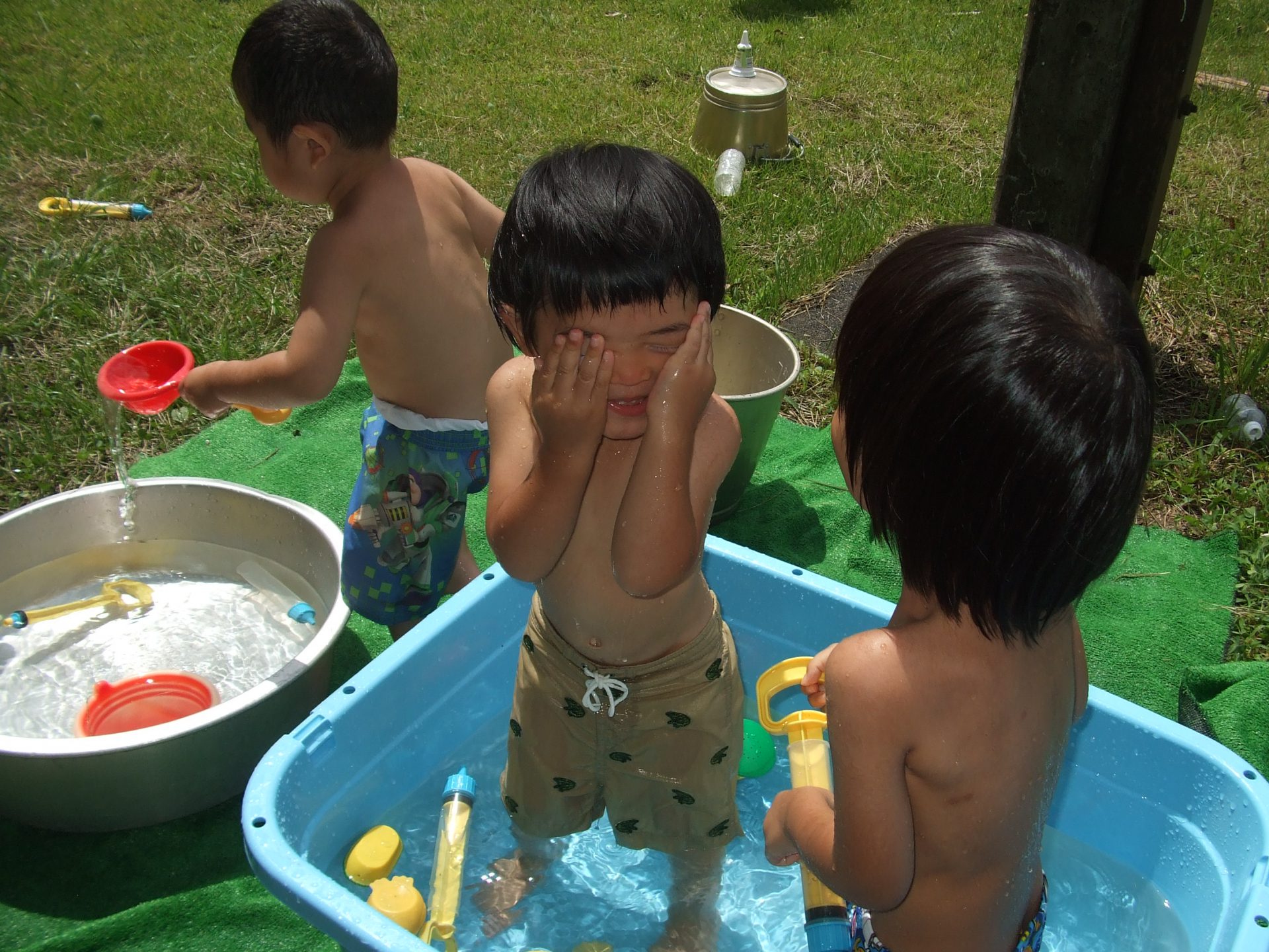 手を叩いて大笑い!!楽しい遊びの中では顔に水がかかってもへっちゃらです。