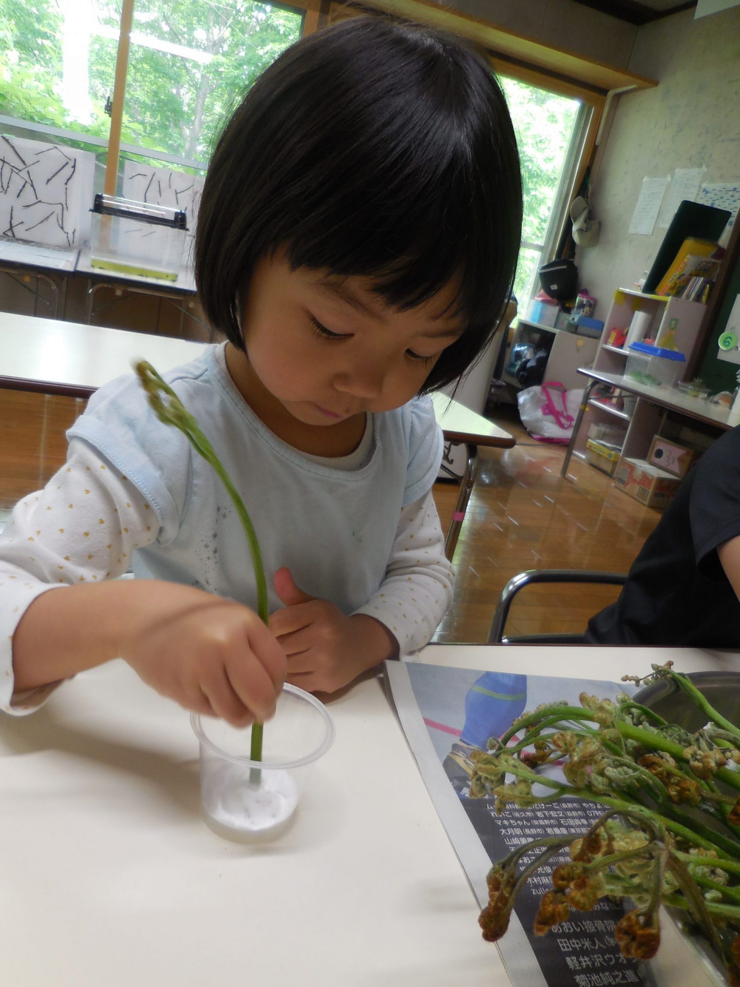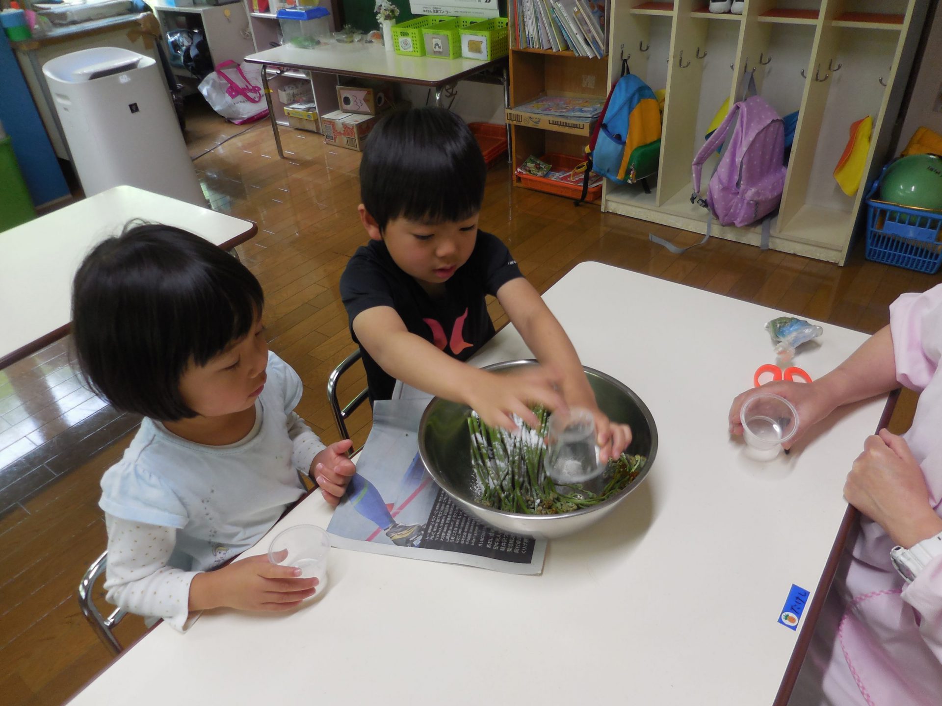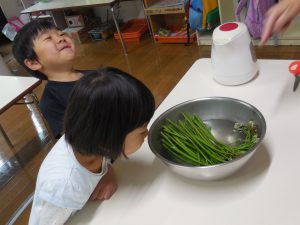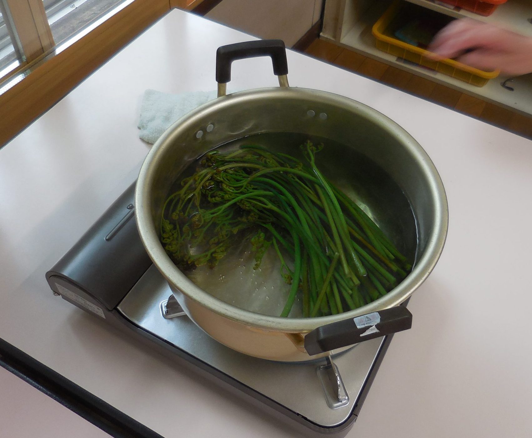 熱湯をかけ灰汁抜きする所を、とても興味深く見ていた。「くさい!」「なんか緑色になってきた」などと言いながら嗅覚や視覚で、色々なことを感じていた。
