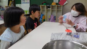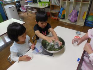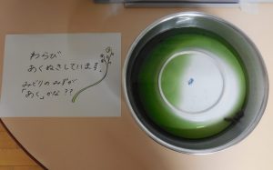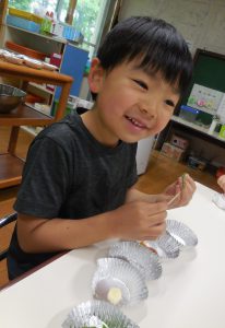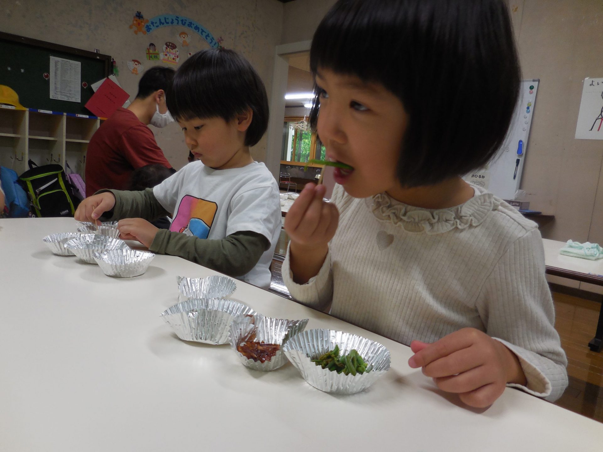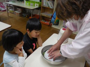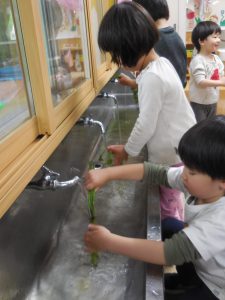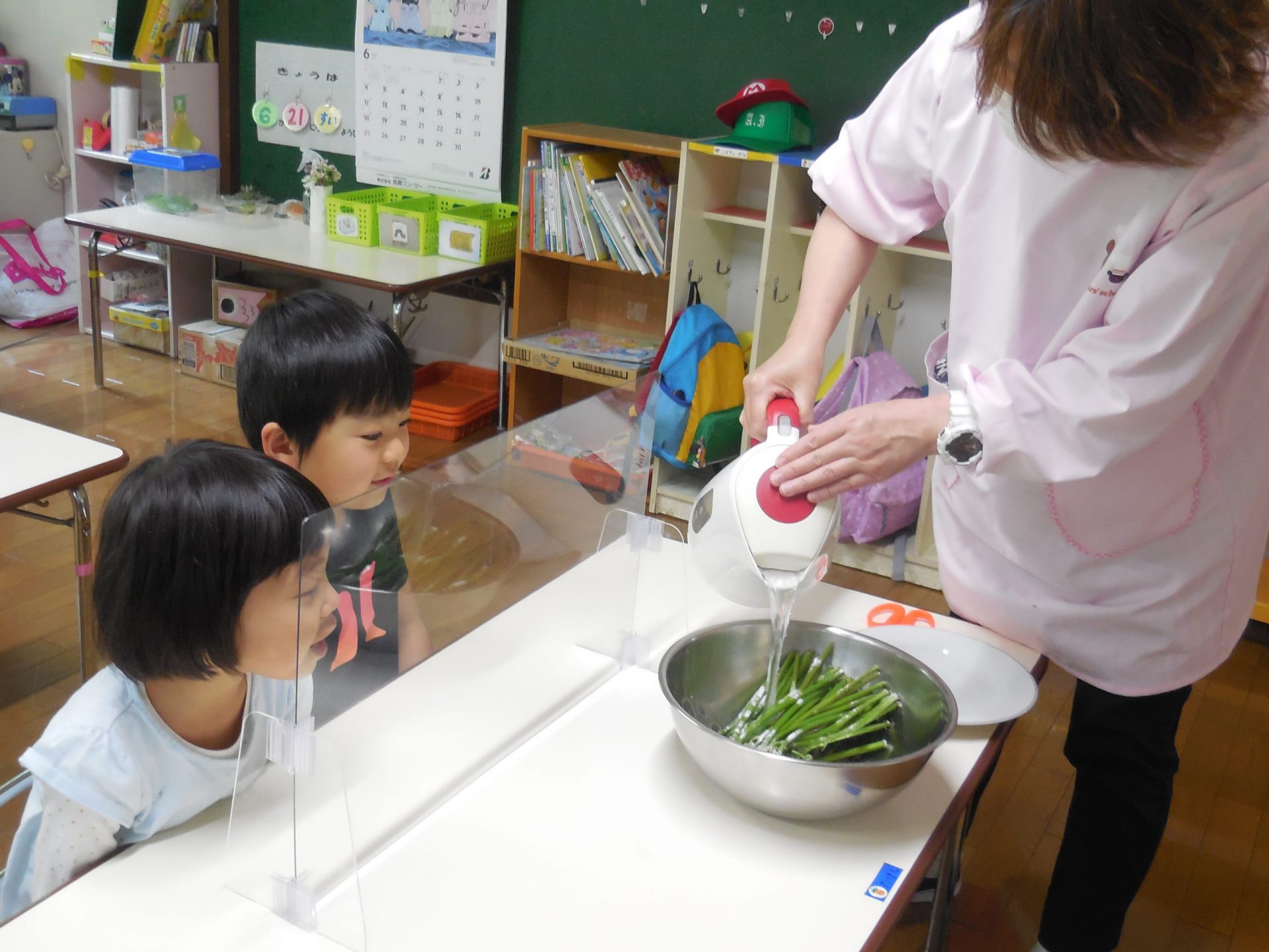 熱湯をかけ灰汁抜きする所を、とても興味深く見ていた。「くさい!」「なんか緑色になってきた」などと言いながら嗅覚や視覚で、色々なことを感じていた。