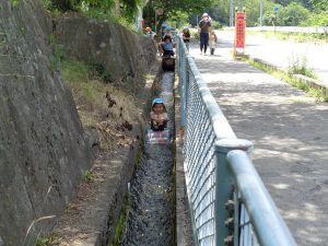 用水路で流れられるなんて、知らなかったな~でも、田んぼに入れる水だから、ゴミや草は流さない約束だよ。