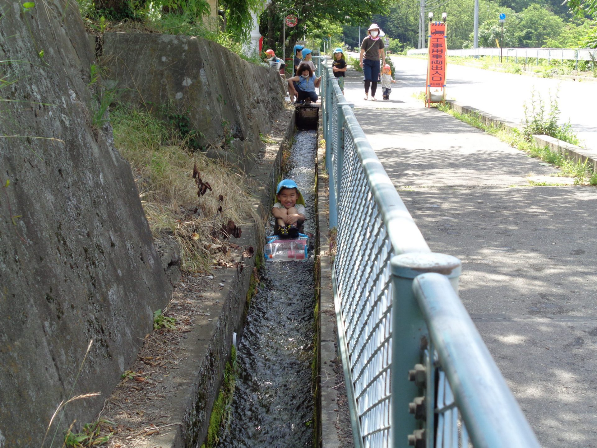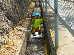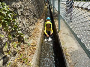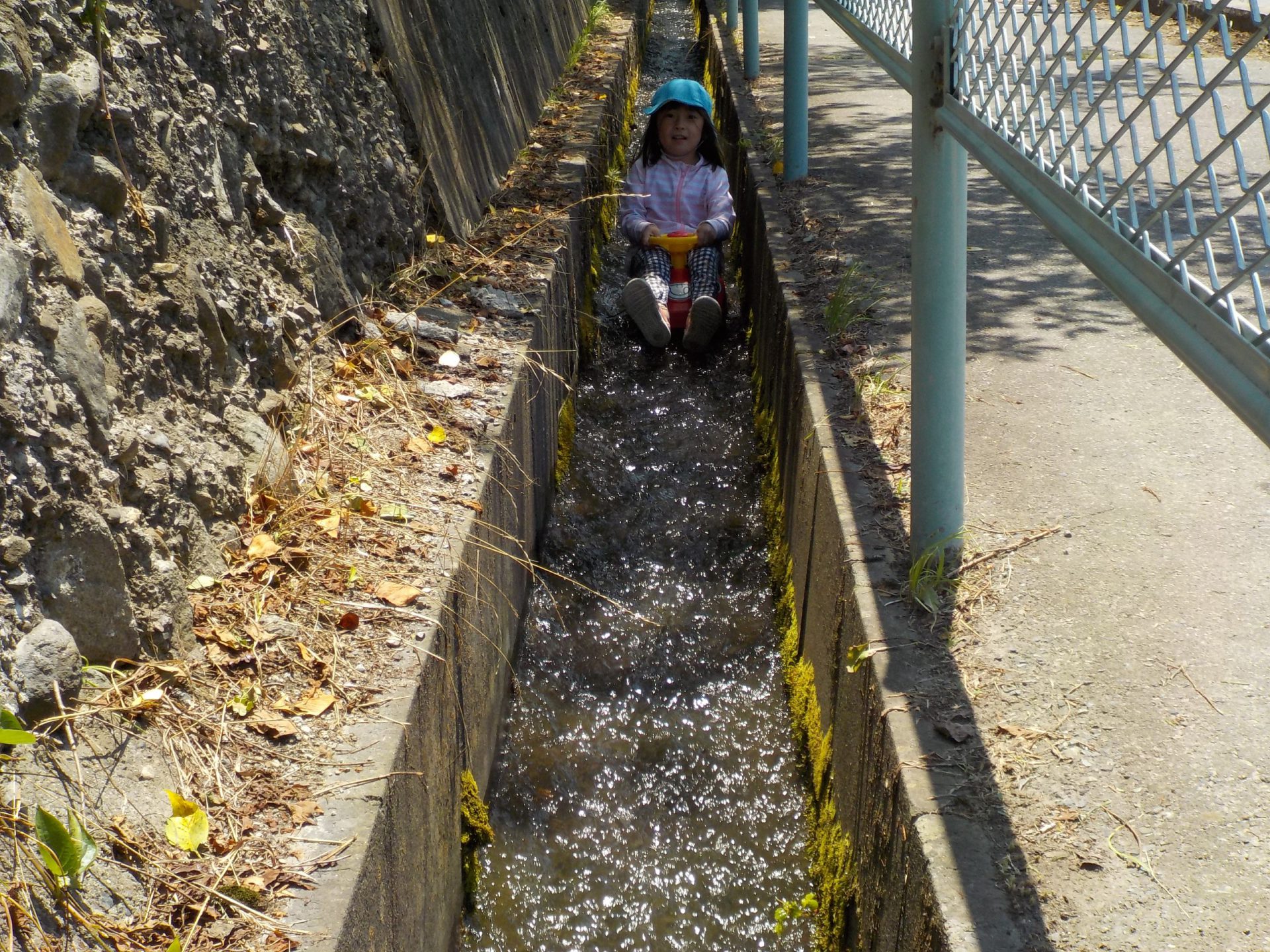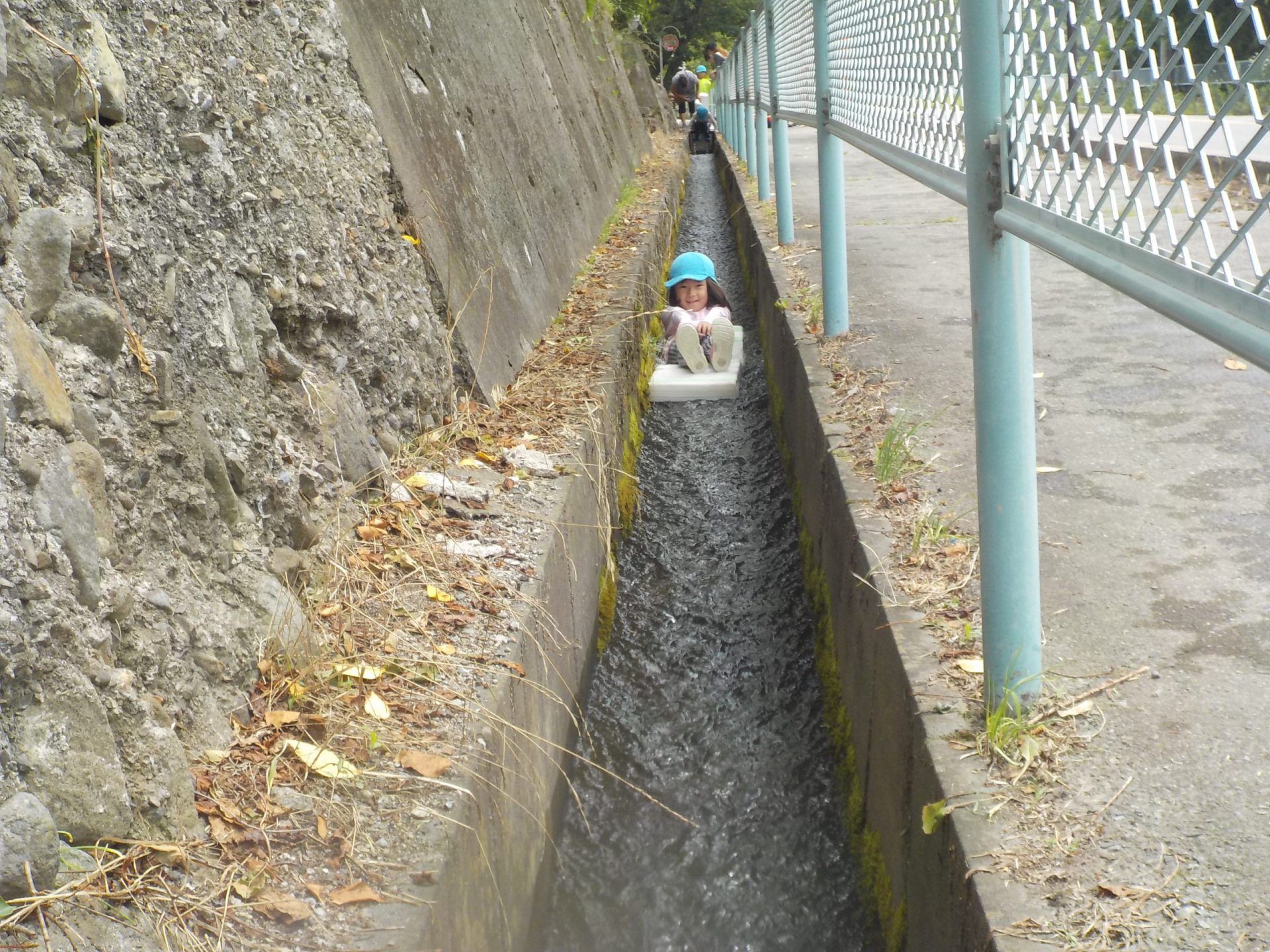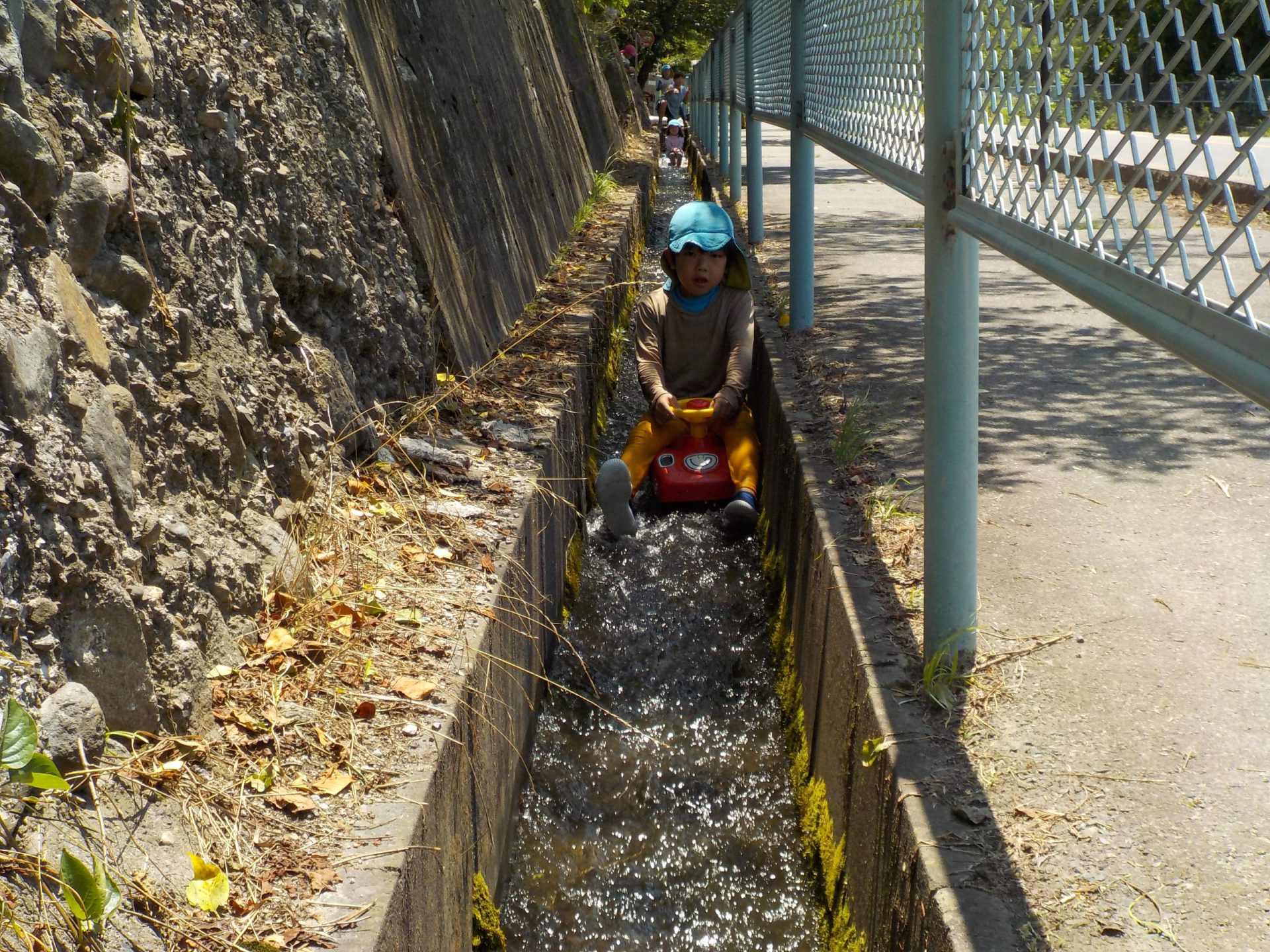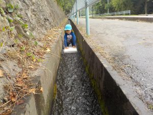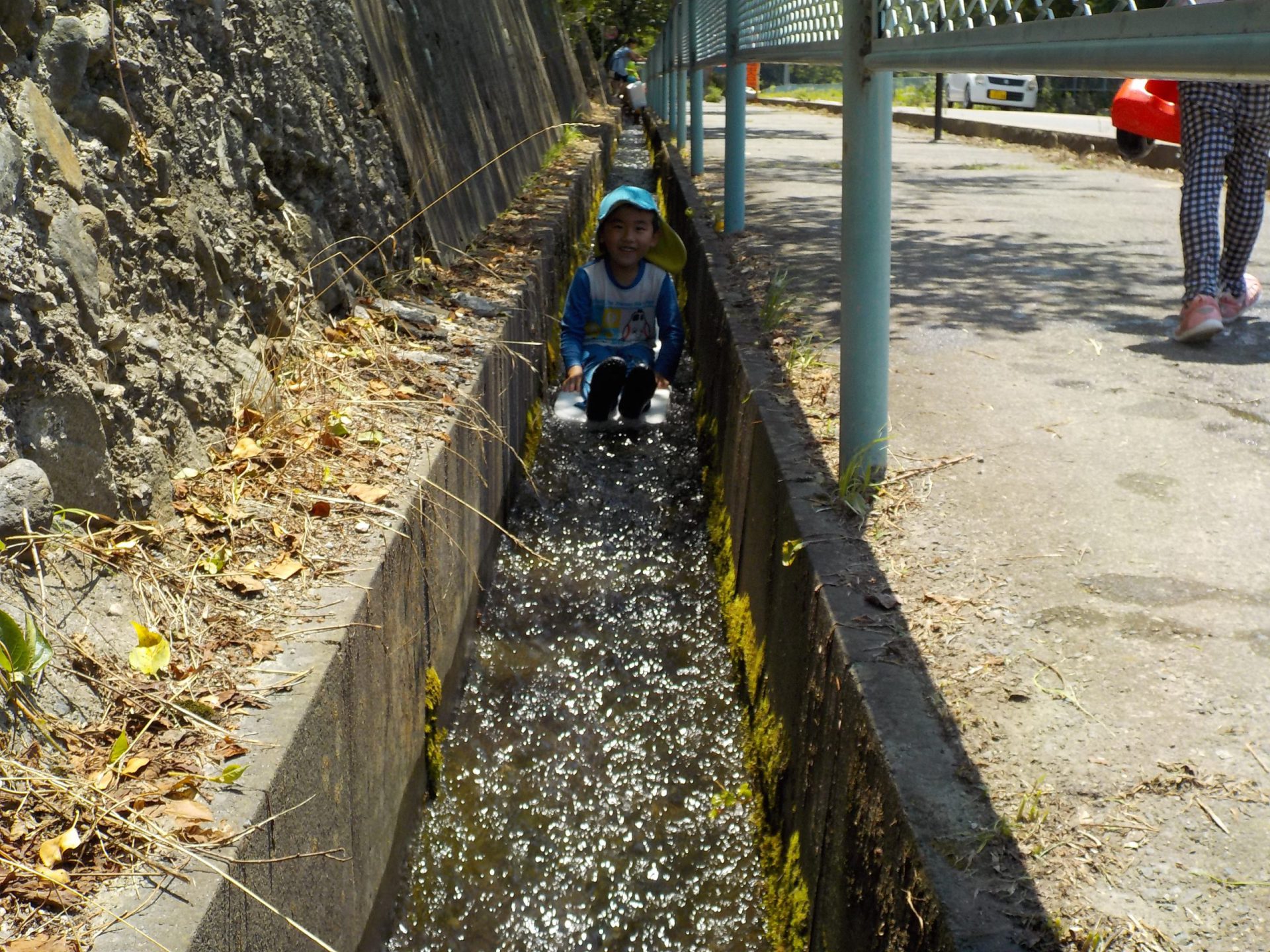 毎日散歩で通っていた(中を歩いていた)用水路、「ここは・・?」から、流れられることがわかると、「あれもしたい」「これでも流れたい」保育士の持っている物「これもいい?」と、スライダーができ楽しいがわかってくると、自分たちで何を持って、次はこれで・・などを考えていくようになりました。与えられたもので満足するのではなく、自分たちで考え「こうしたい」につながっていき嬉しく思います。