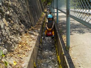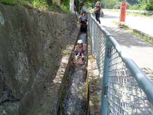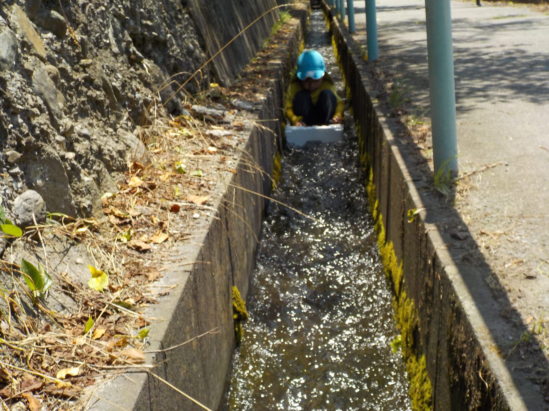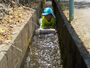 用水路の水が少ないと、流れも弱くてスライダーできないんだ。田んぼに水いれてるからかな~。