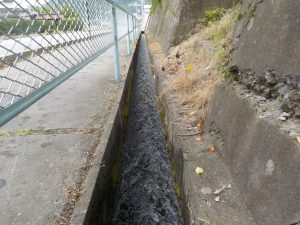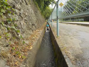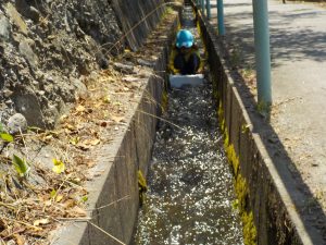 「ちょっと浮くけどダメだ😔」どうしたものかと考えながら歩いていて、そろそろ保育園に着くぞ・・・うん!?もしかしてこの用水路で流れるんじゃないかい!?💡
