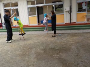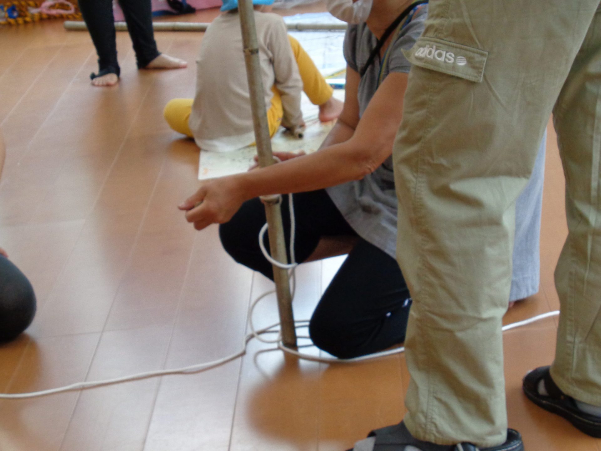 今日の保育参加は、親子で力を合わせて竹馬作りです。