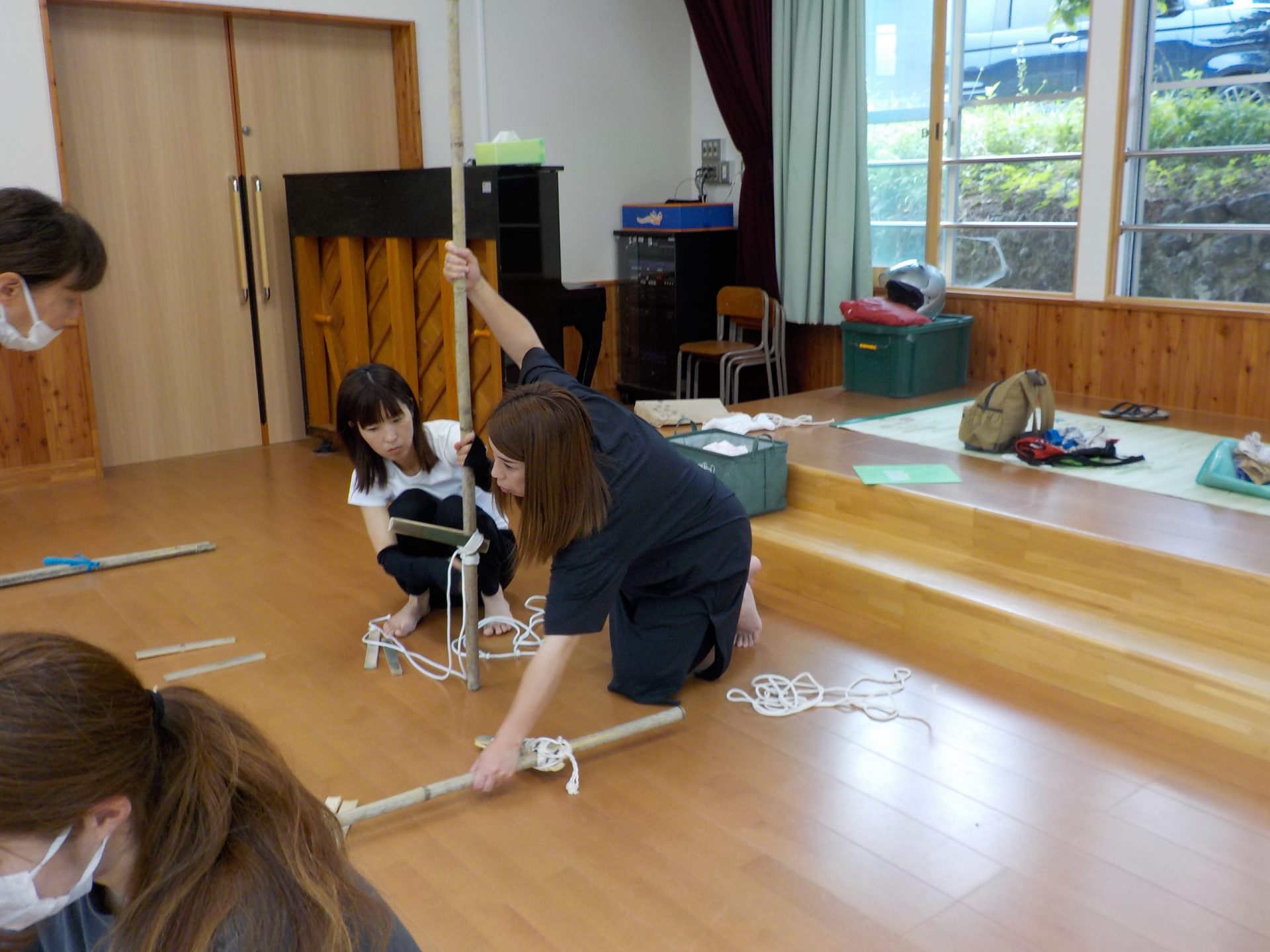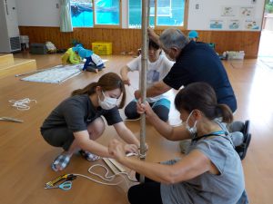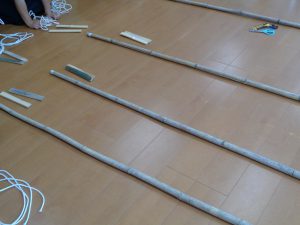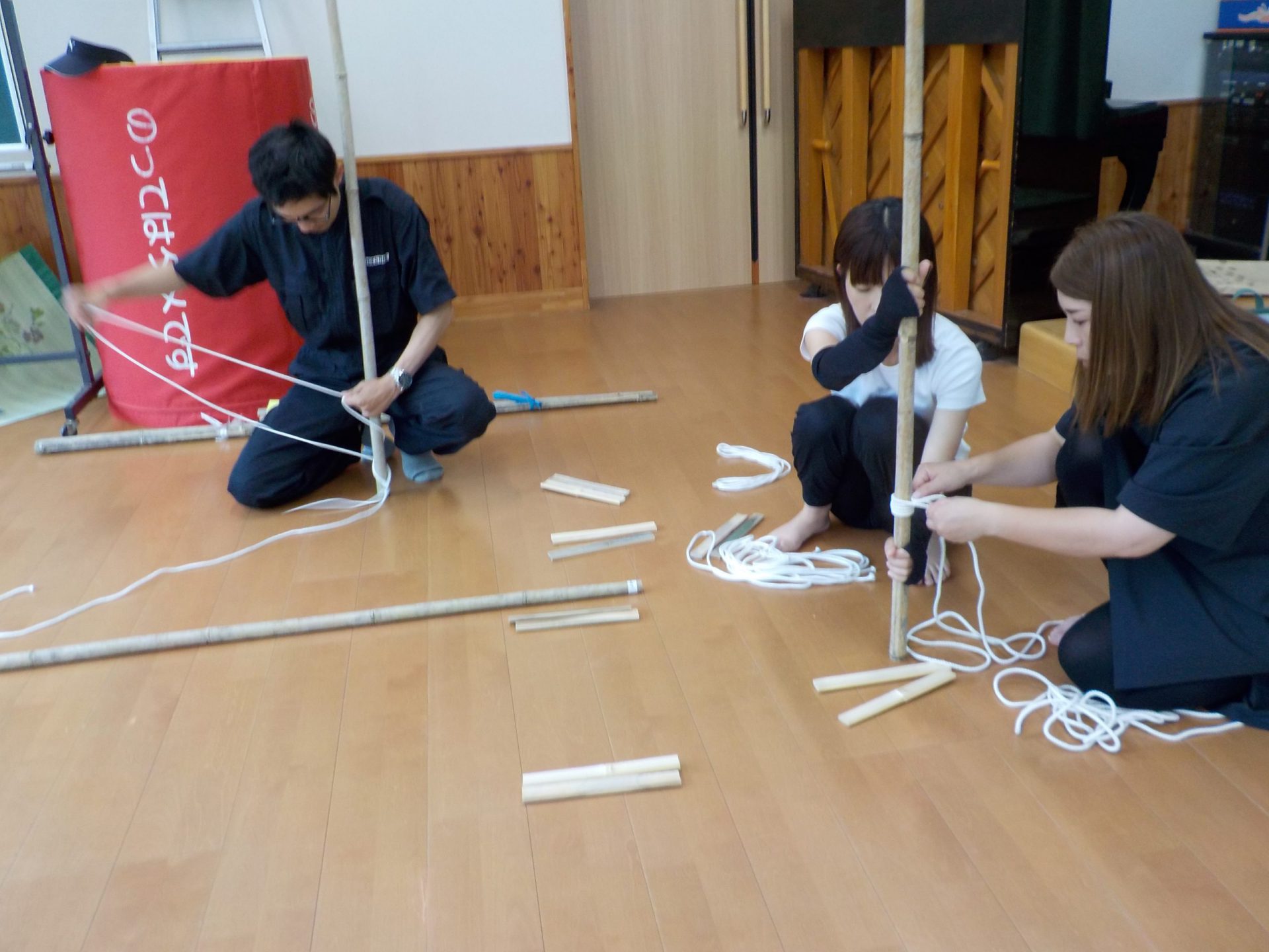 竹に紐を使って、足場をつけていきます。