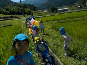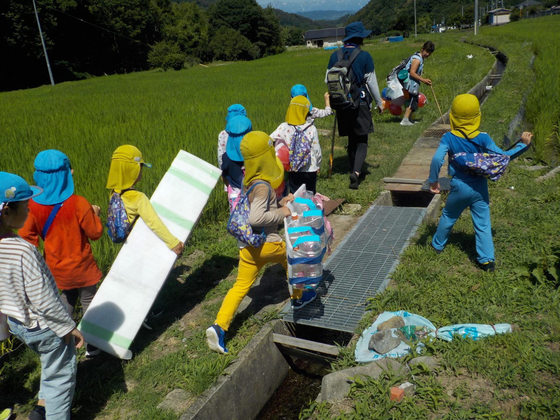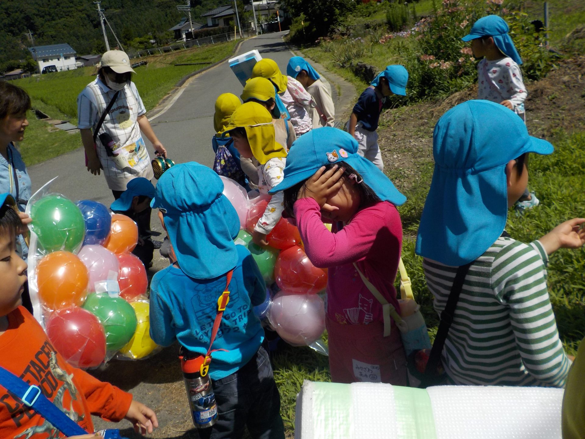 東条保育園前の蛭川が工事になり、川遊びが満足に出来ない。昨年の当園の路線バスを使ったことを知った東条の職員が、路線バスを使って親水公園での川遊びを企画したことで、それならば、地域の保育園同士交流をしたいと考え、今回初めて交流をすることが出来た。