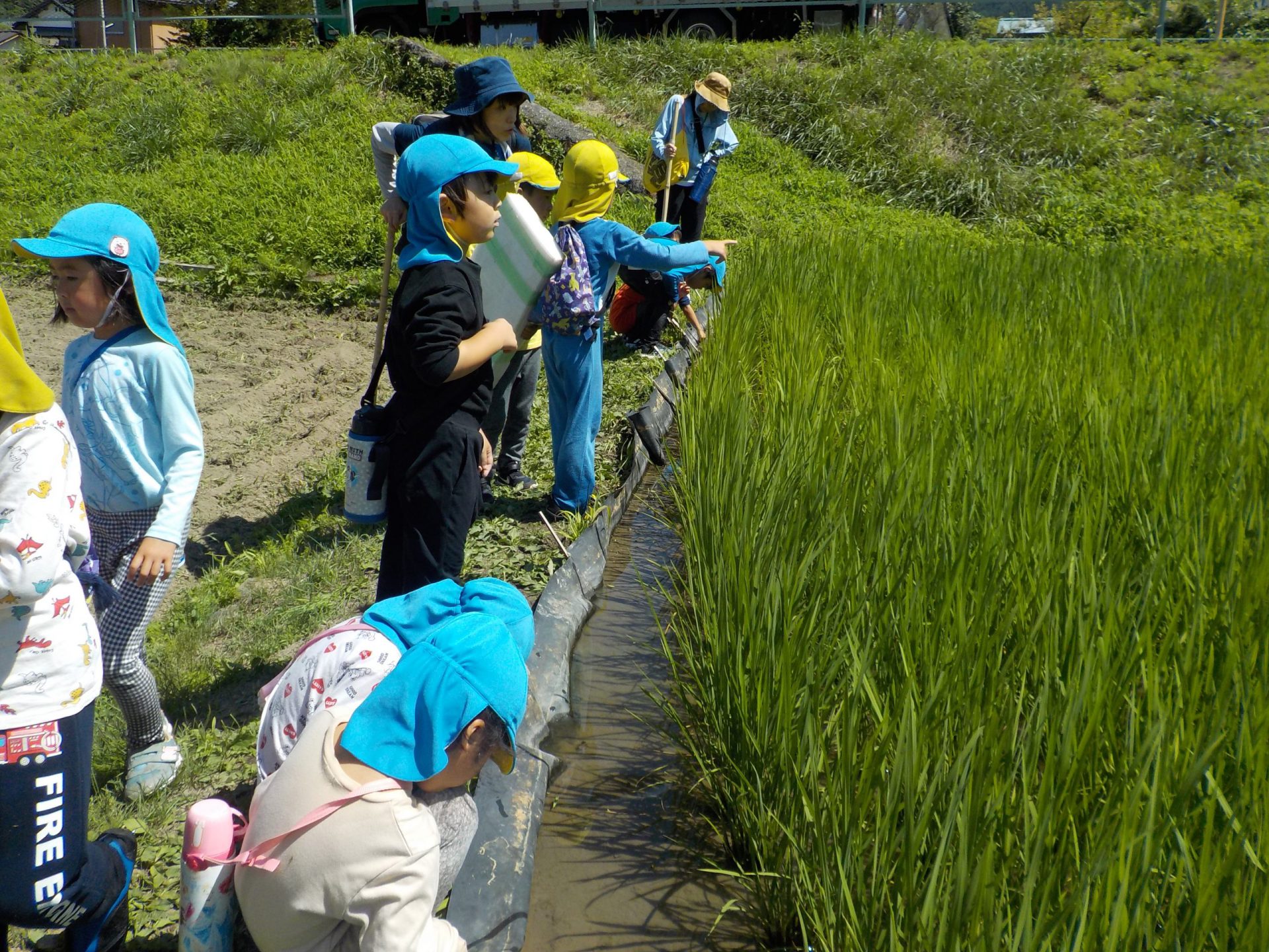 「用水路の水がつめた~い」「でも気持ちいいね」生き物を探したり、葉っぱでキジ笛をやってみたり、葉っぱの匂いを嗅いで「アーモンドの匂い」と発見!!