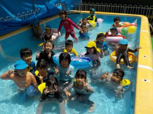 帰ってきて、用水路スライダーを楽しんだ後は、みんなで・・・プールに入っちゃおう!!