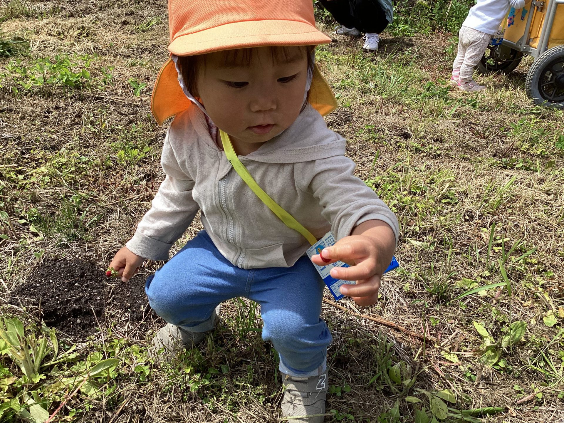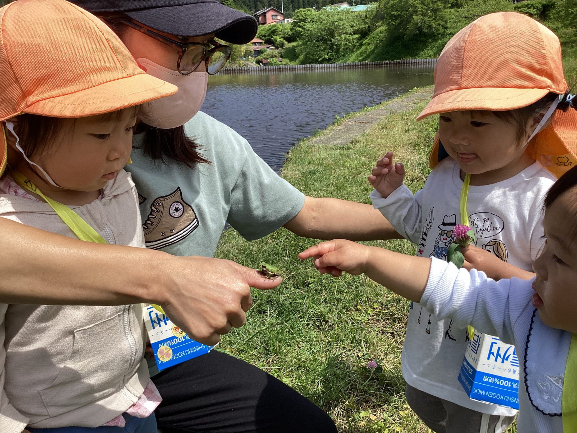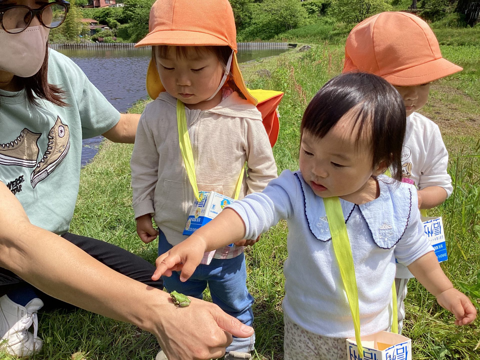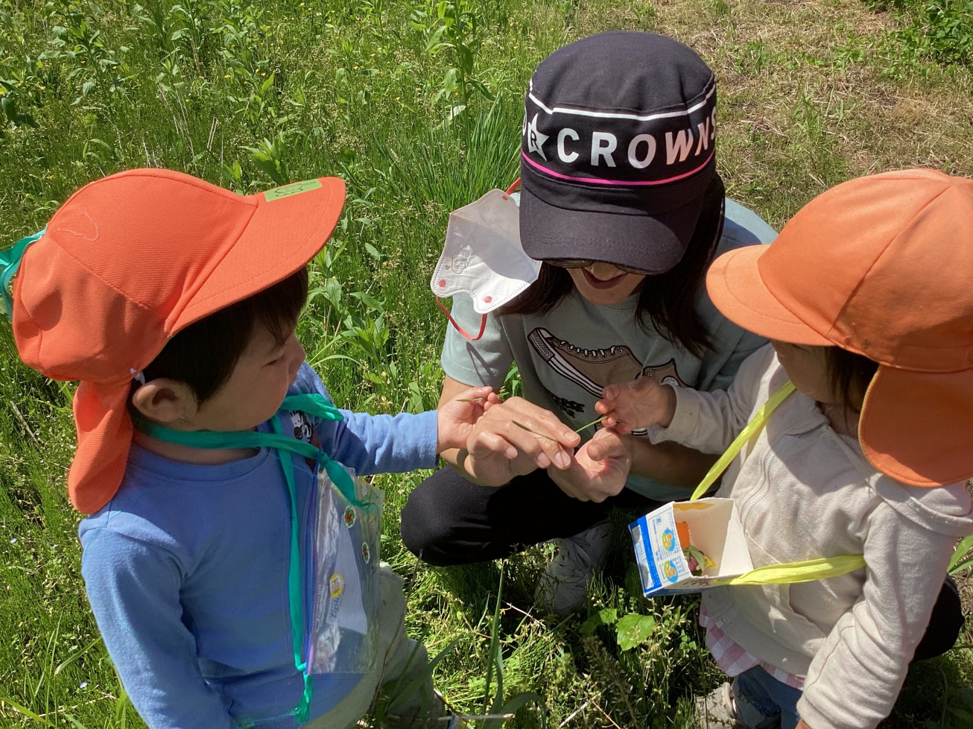 地主の方が歩くところだけ草を刈っていただき、遊ぶところはあえてそのまま草むらを残してくれていました。ヘビイチゴやシロツメクサやアカツメクサを摘んだり、スズメノテッポウという植物が音が鳴るということに気がついたり、様々な生き物にも出会うことができ、大変有難かったです。以前からお友達に関心を持って同じ遊びを楽しむ姿が見られるようになってきていたので、遠足でも見られると良いなと思っていました。カエルを触ることを少し怖がる姿もありましたが、お友達が触っているのを見て、触ってみたいという気持ちも伝わってきました。友達と成長し合う姿が遠足でも見られて嬉しかったです。