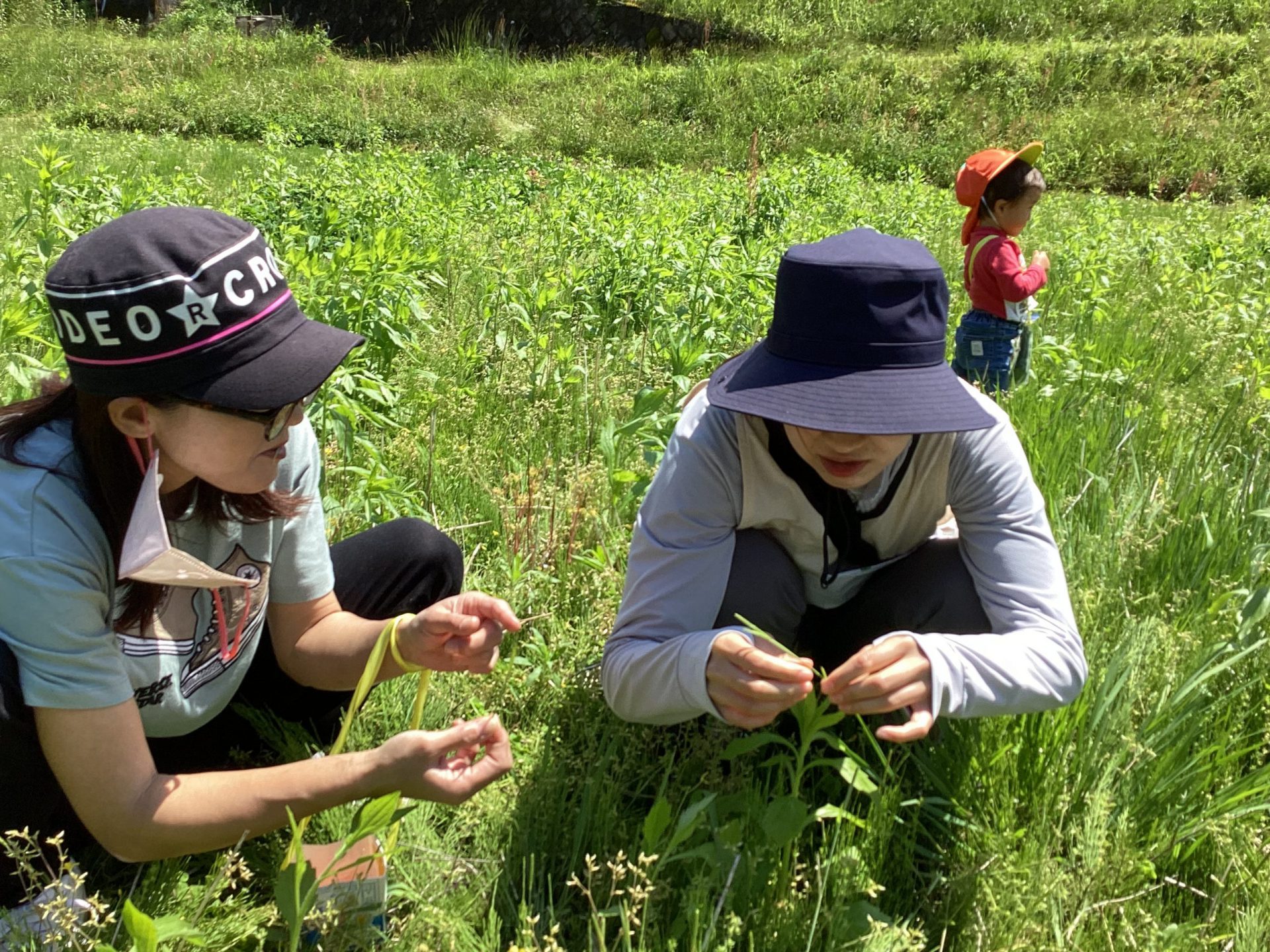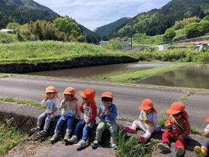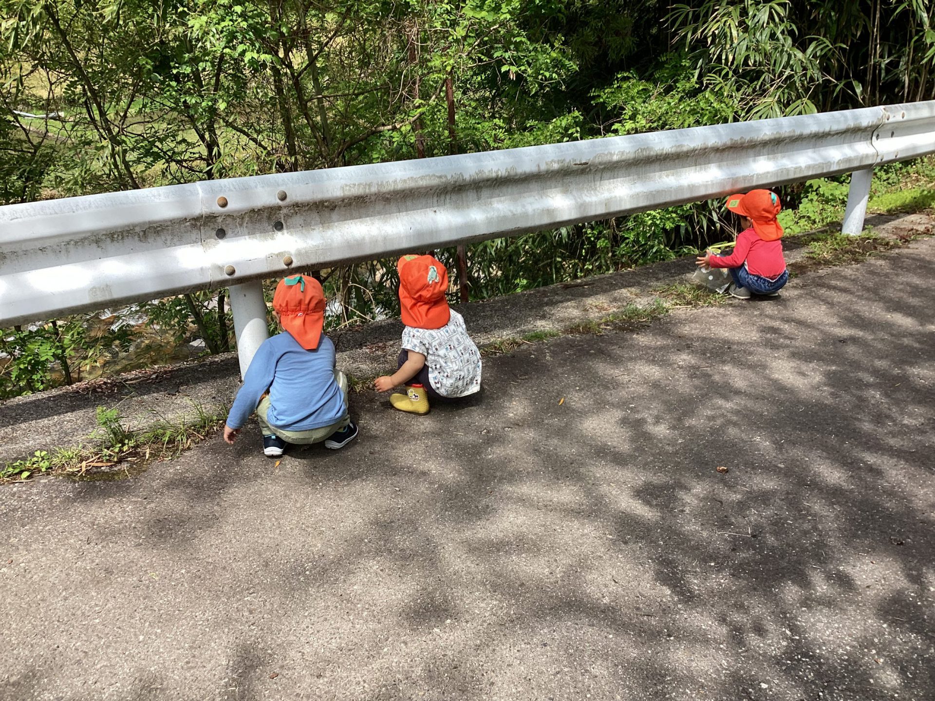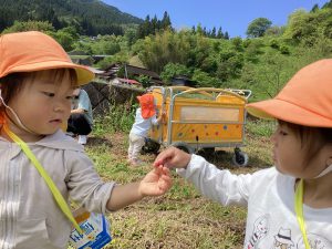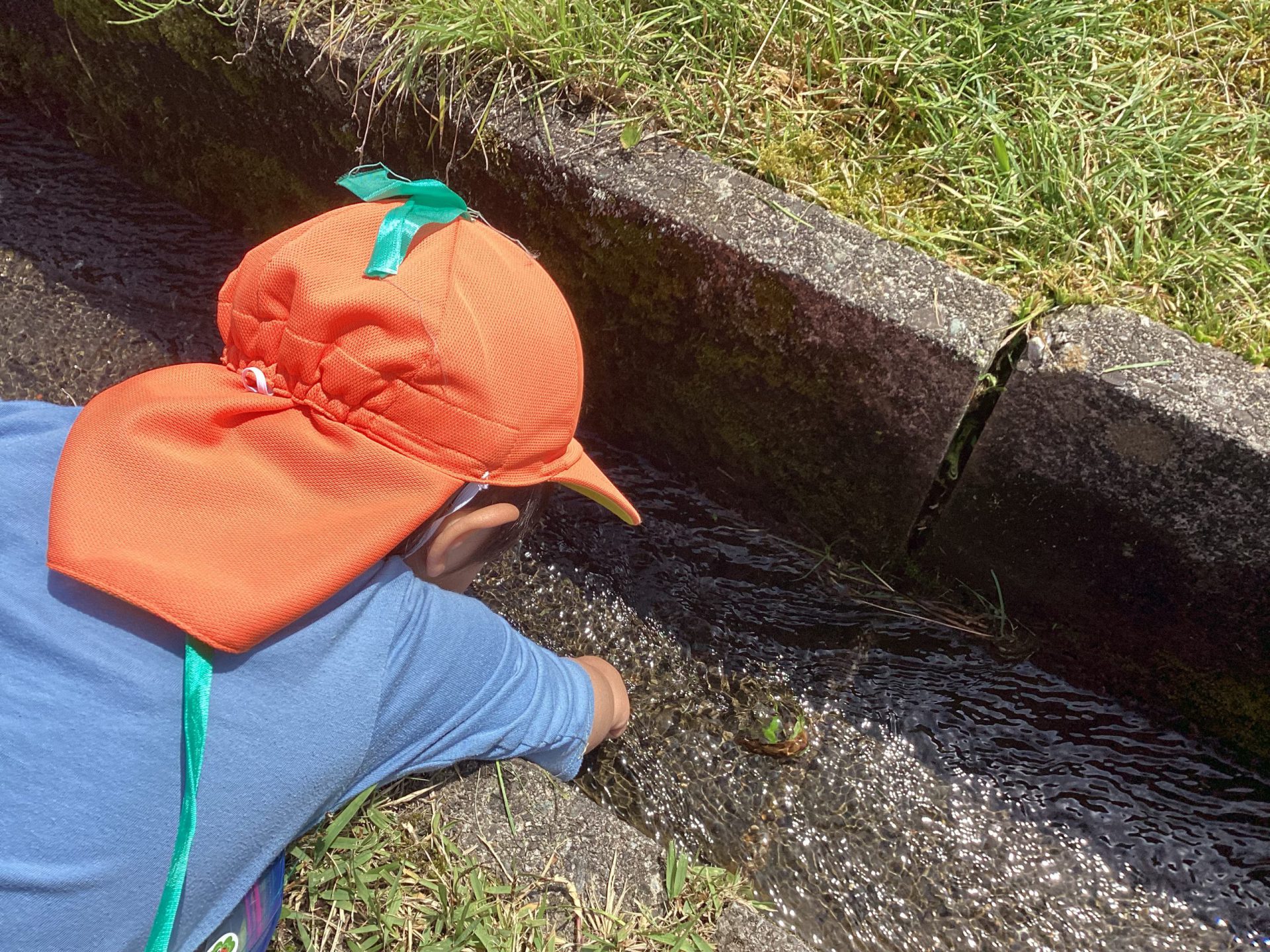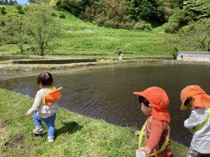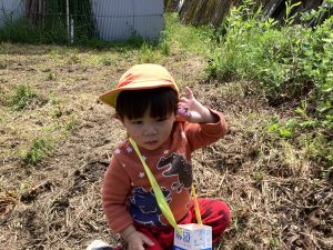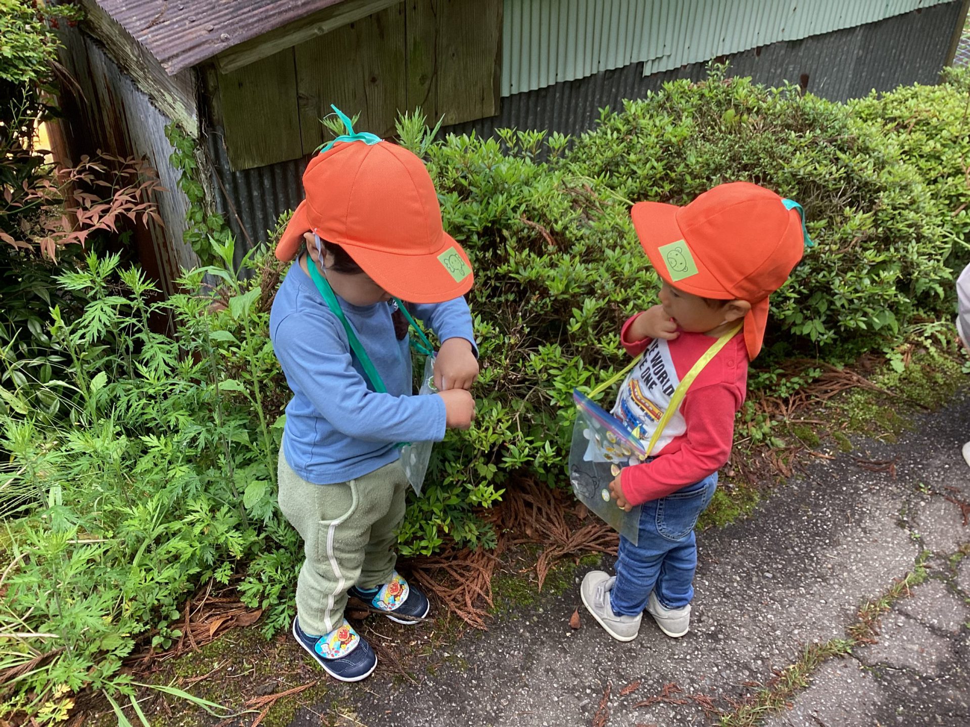 地主の方が歩くところだけ草を刈っていただき、遊ぶところはあえてそのまま草むらを残してくれていました。ヘビイチゴやシロツメクサやアカツメクサを摘んだり、スズメノテッポウという植物が音が鳴るということに気がついたり、様々な生き物にも出会うことができ、大変有難かったです。以前からお友達に関心を持って同じ遊びを楽しむ姿が見られるようになってきていたので、遠足でも見られると良いなと思っていました。カエルを触ることを少し怖がる姿もありましたが、お友達が触っているのを見て、触ってみたいという気持ちも伝わってきました。友達と成長し合う姿が遠足でも見られて嬉しかったです。