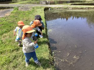 水がゆらゆら反射して光る田んぼにも興味津々のひよこ組。