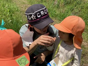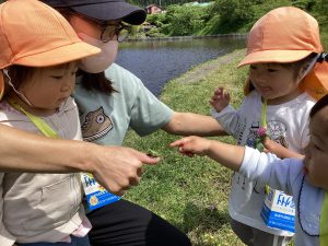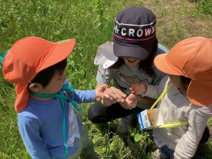 スズメノテッポウを給食の先生が鳴らすとすぐに興味を持ち、鳴らそうと挑戦する姿がありました。カエルやちょうちょを見つけて大興奮で追いかける姿、生き物に触れる友達や先生の姿に刺激を受け、触ってみたいと挑戦する姿がありました。