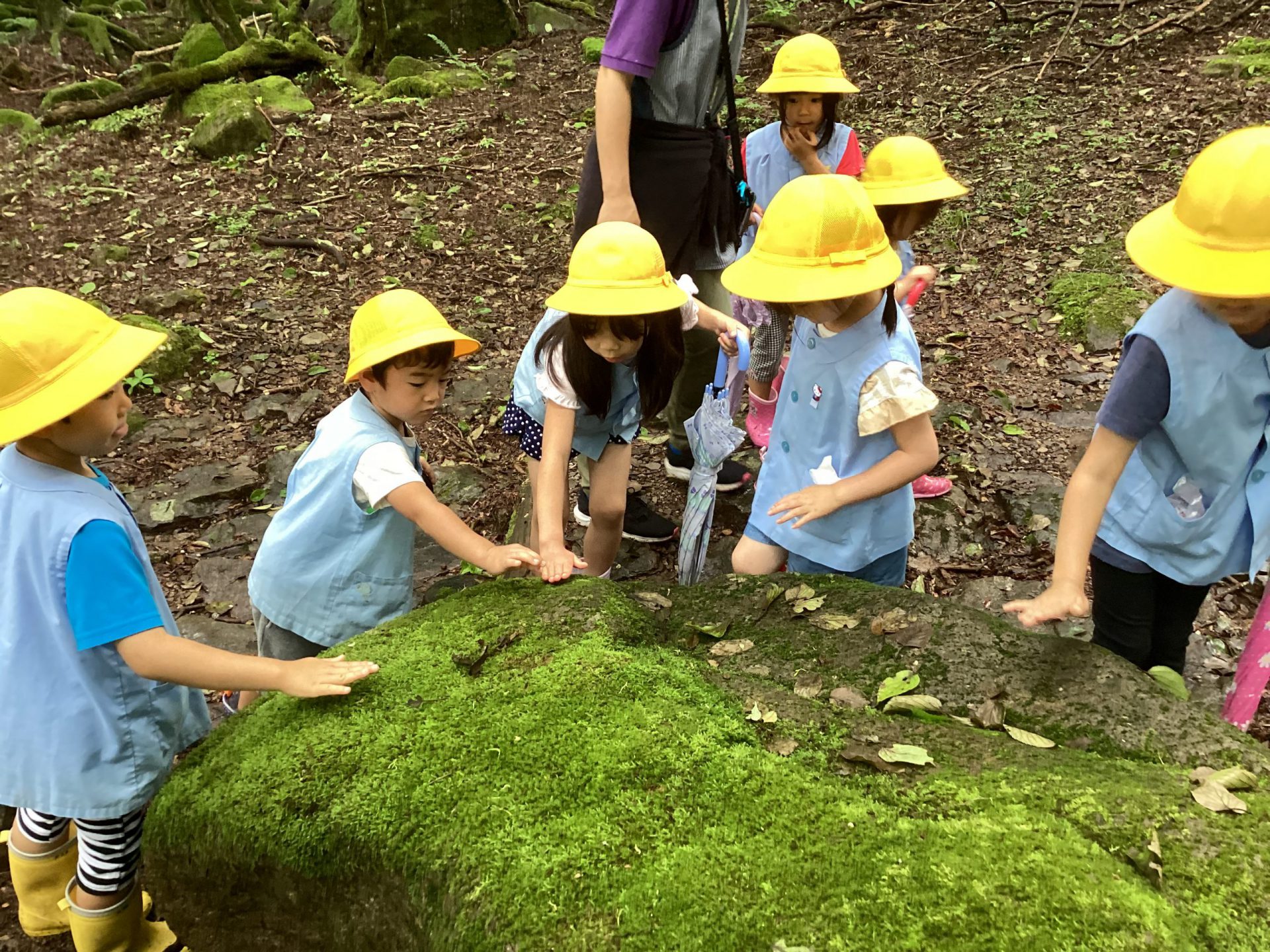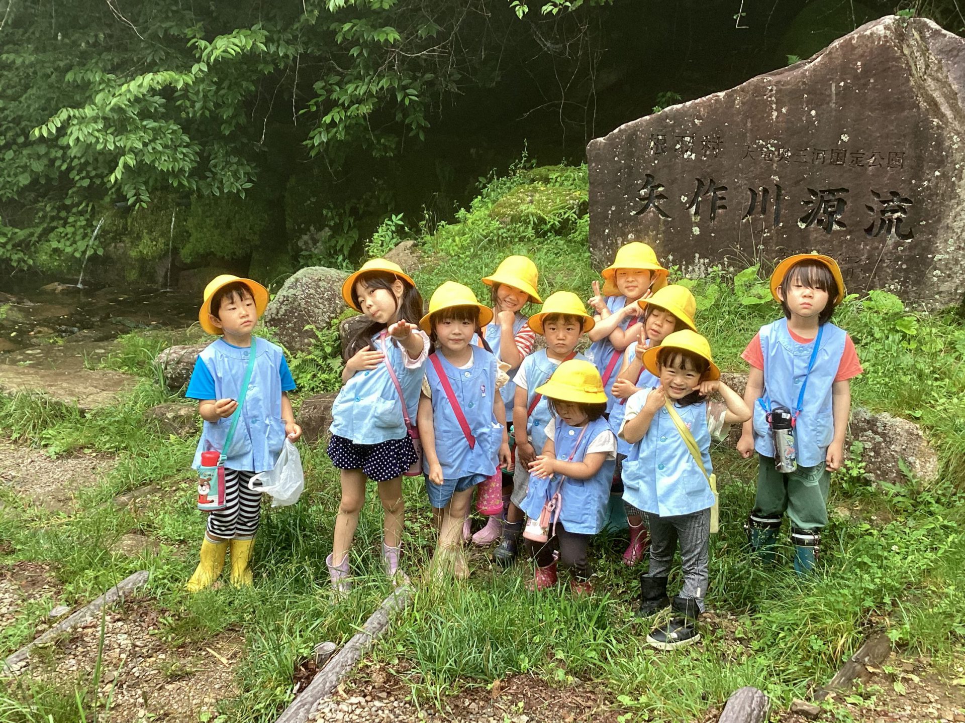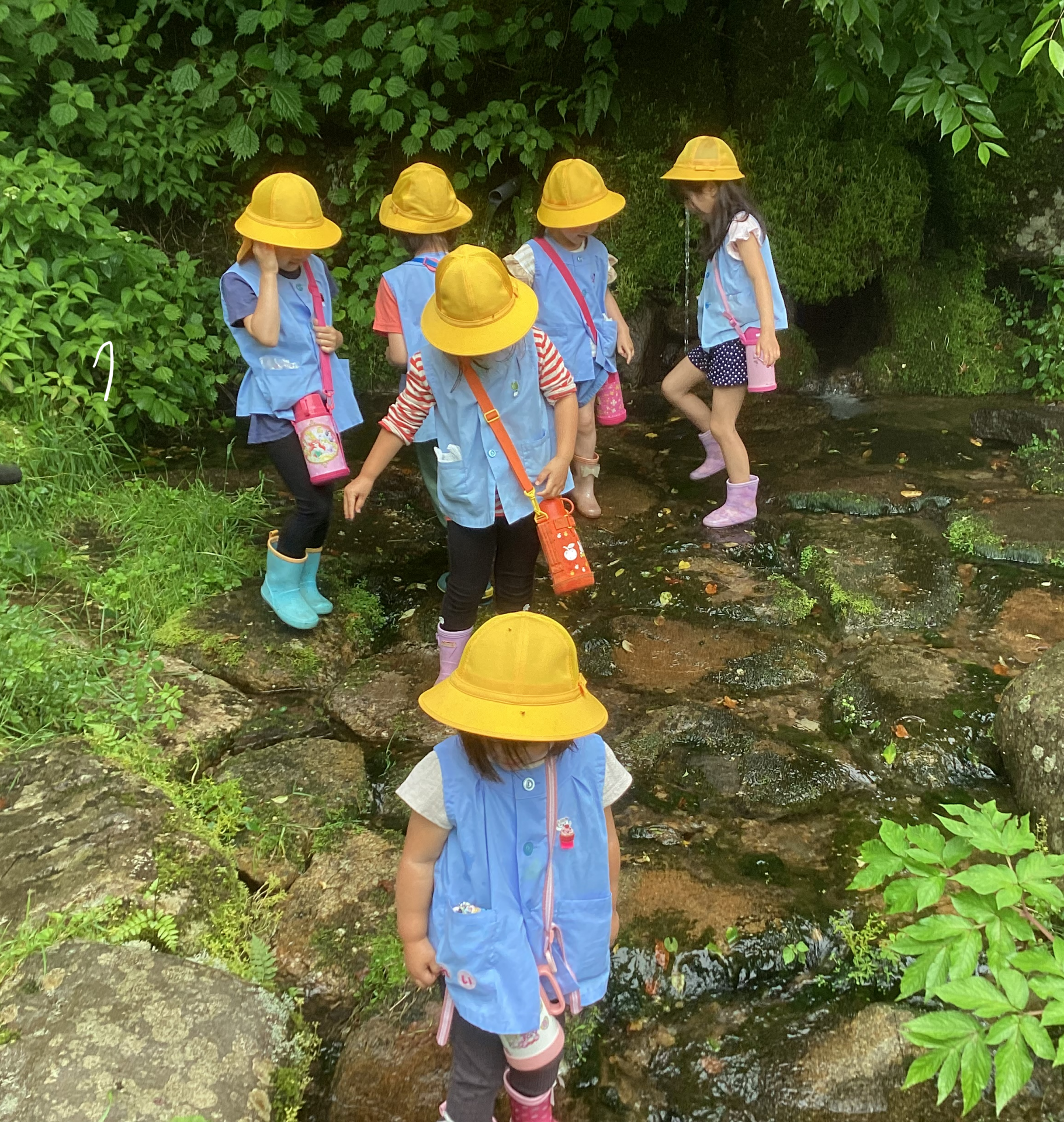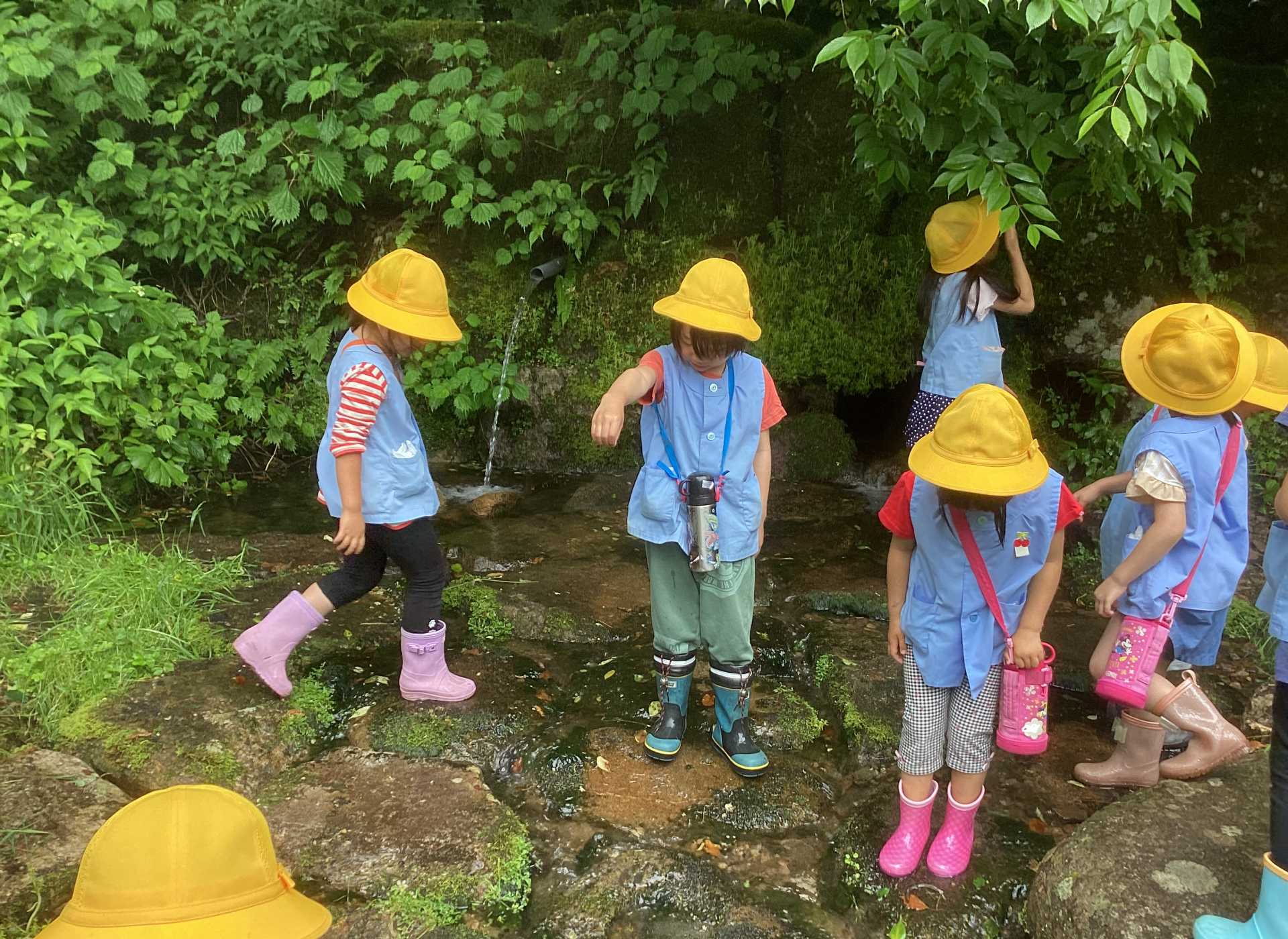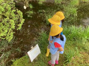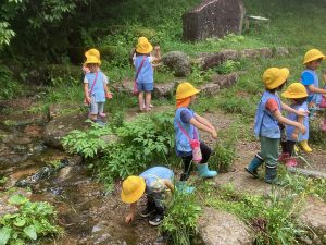保育士から、源流について話を聞きました。自分たちが知っている大きい川の始まりが、いつも見ている川と違う事が不思議のようです。川の水に手を入れてみたり、きれいな石を見つけたり、藻を手に取ってみたりと川の散策をします。