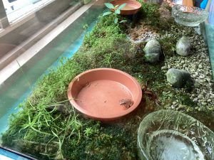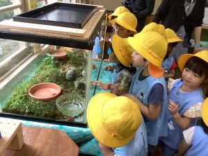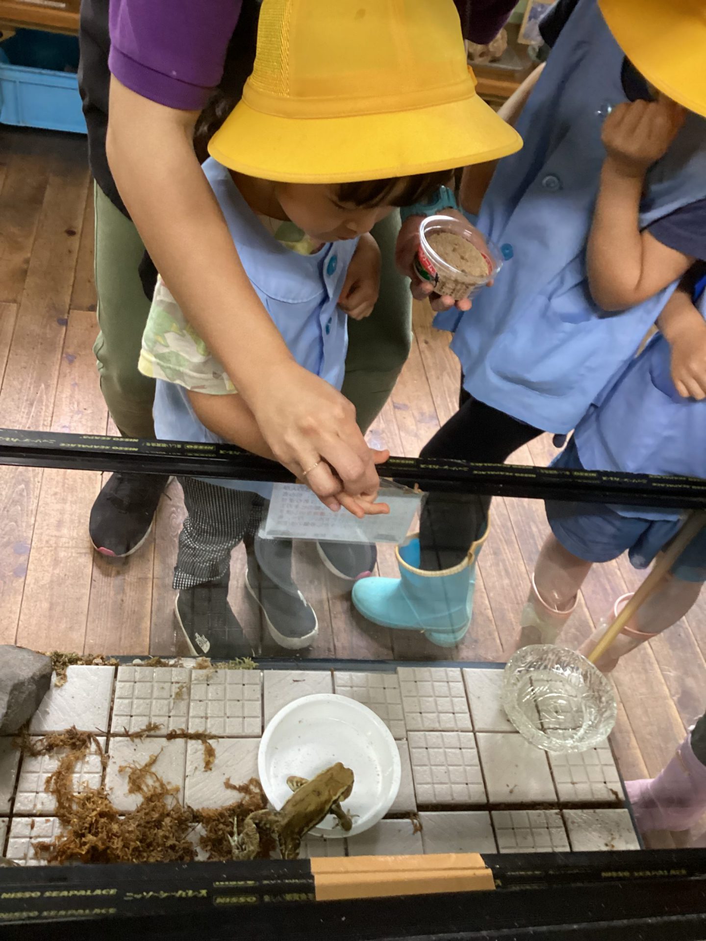 ・カエル館のいろいろなカエルを見て、色や大きさが違う事に気付きました。「隠れているよ。みんなが来たから、驚いて隠れちゃったのかな?」「カエルって耳があるの?」と疑問を持つ。保育士から「耳は無いけど、耳のように音などを感じるものが、体にあるんだよ」と聞き、驚く子どもたち。