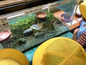 の言葉にホッとしたのか、友達と一緒に館内を見て回りました。館内は色々なカエルが展示され、順番に子どもたちは食い入るように見て行きます。