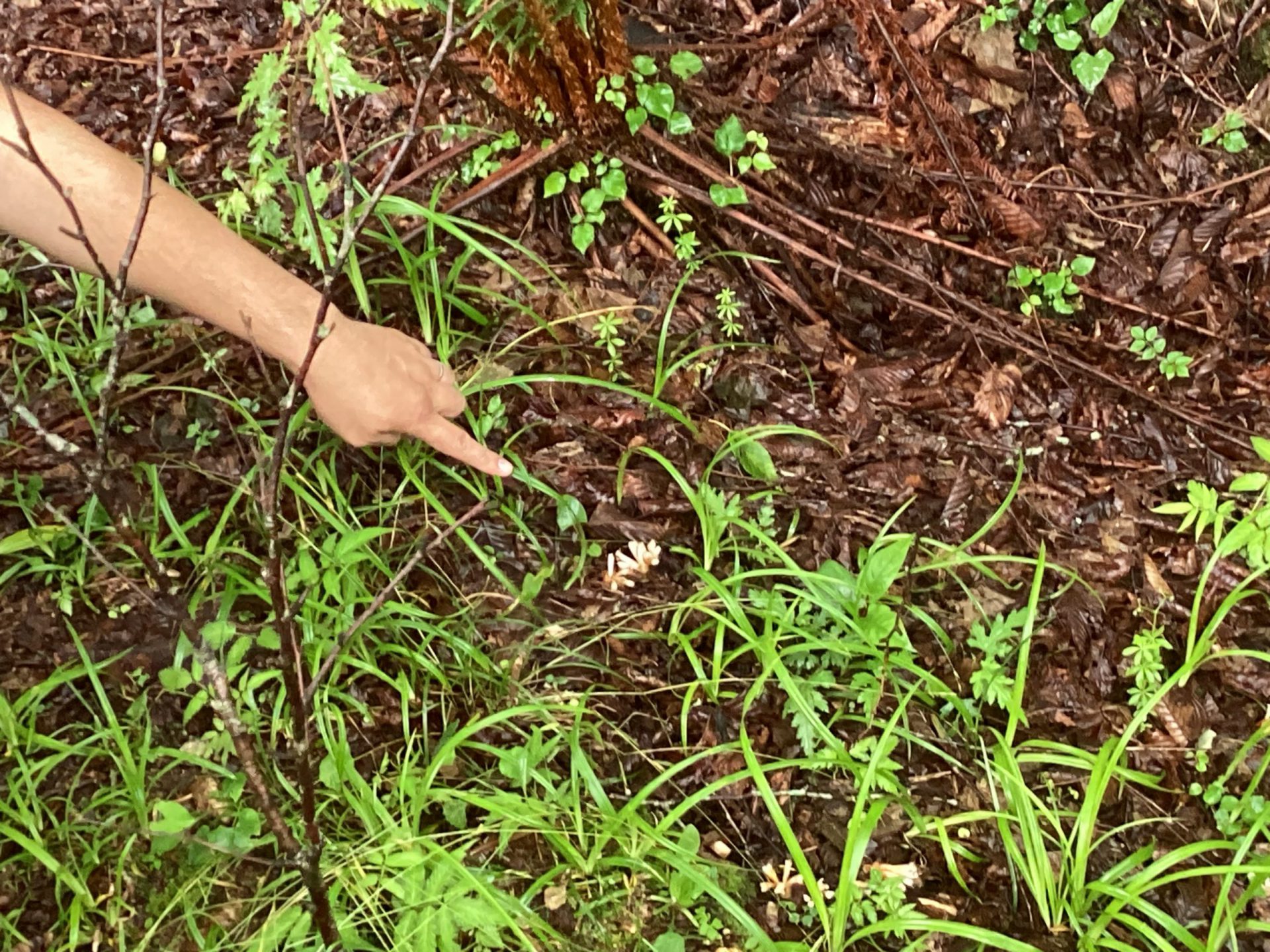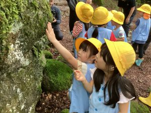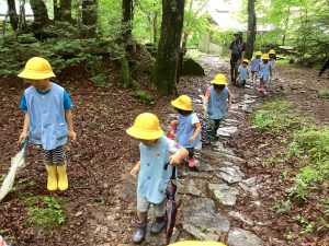 今度は、カエル館の裏山を散策です。雨降りの後なので、滑らないよう足元に注意しながら歩き進みます。傘を杖がわりに使う子もいました。