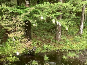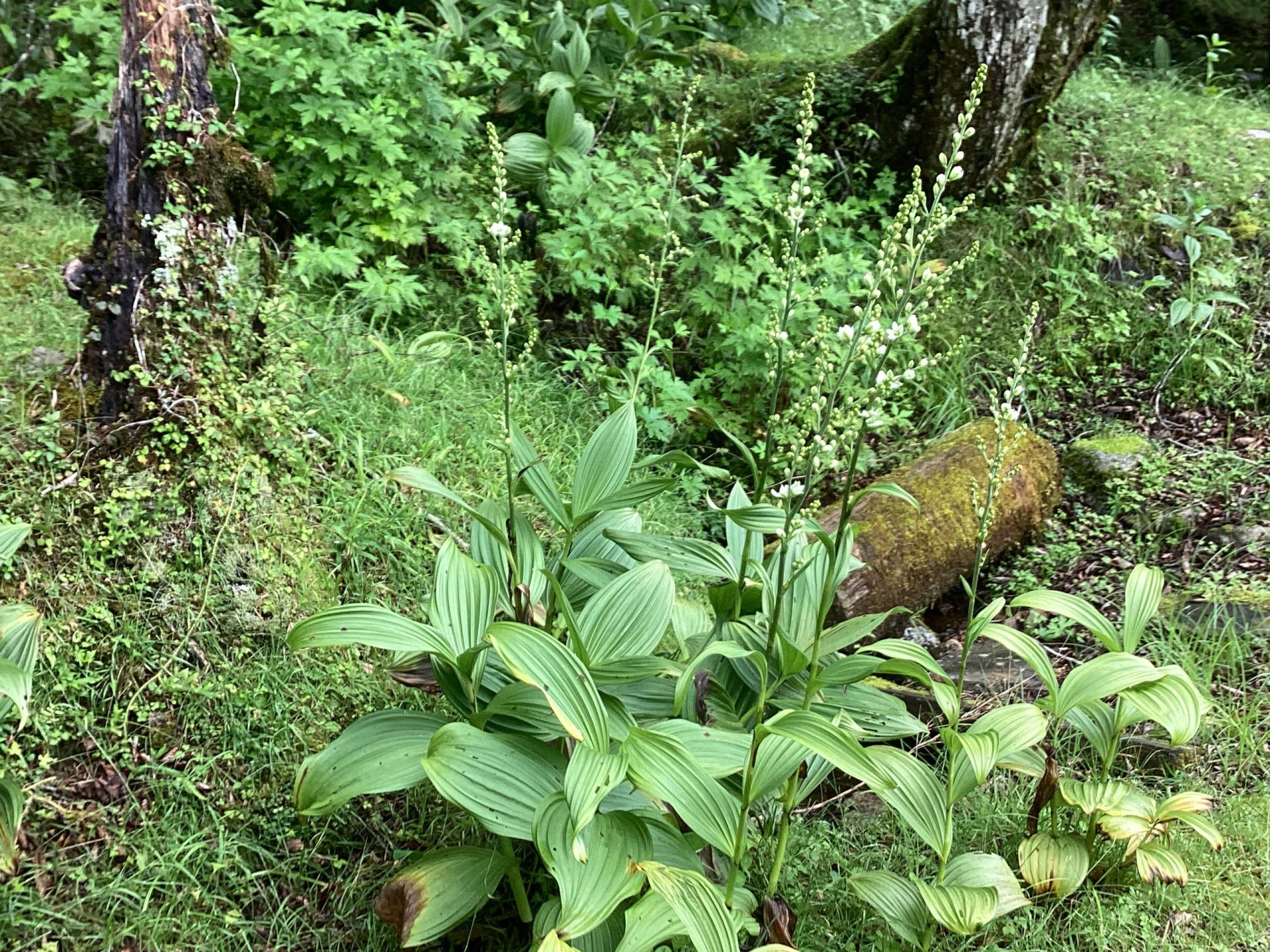 館長さんが、モリアオガエルの産卵地が近くにあると案内してくださいました。行く道中、珍しいキノコや高原植物のコバイケイソウが周辺で見られます。