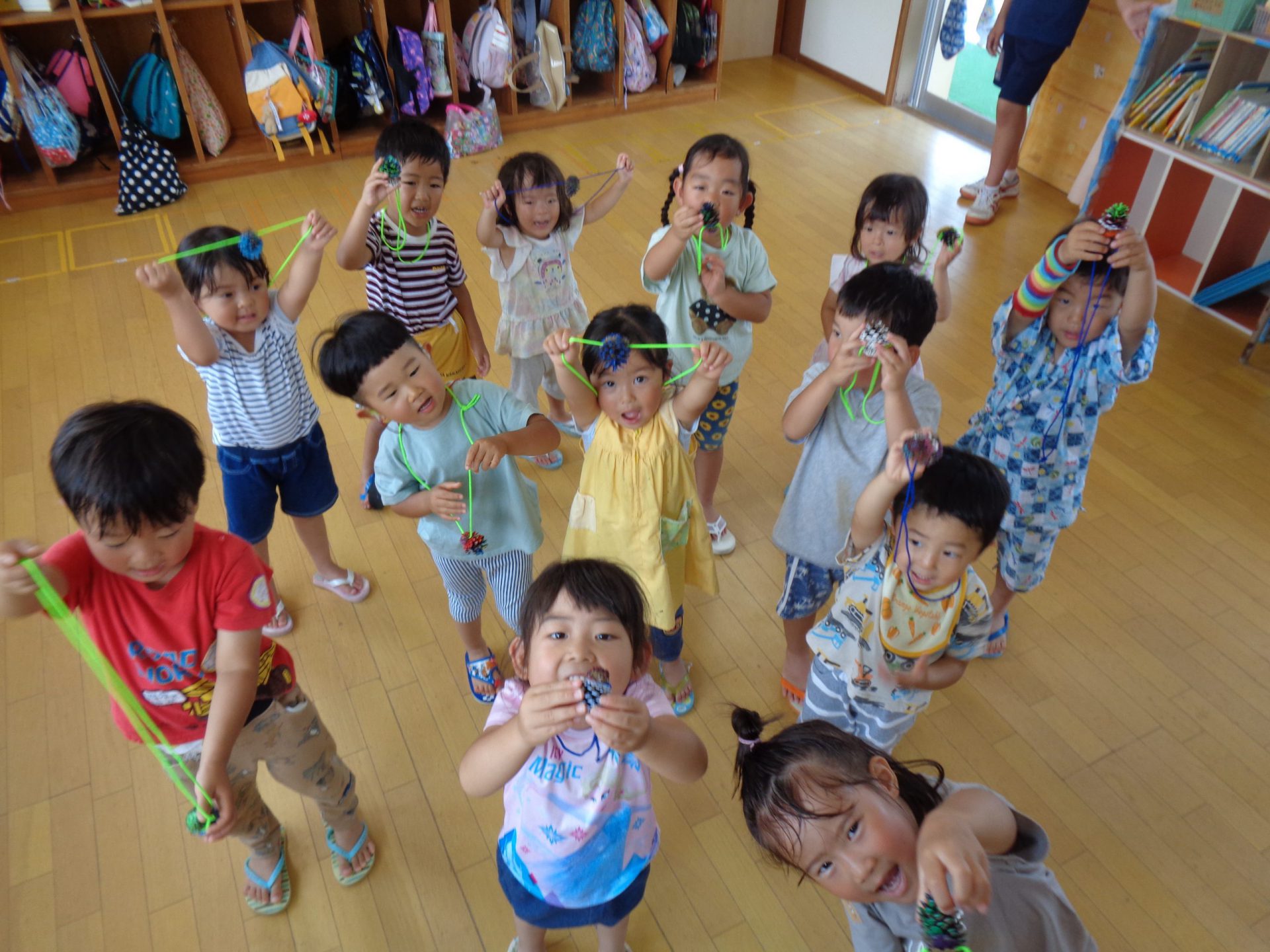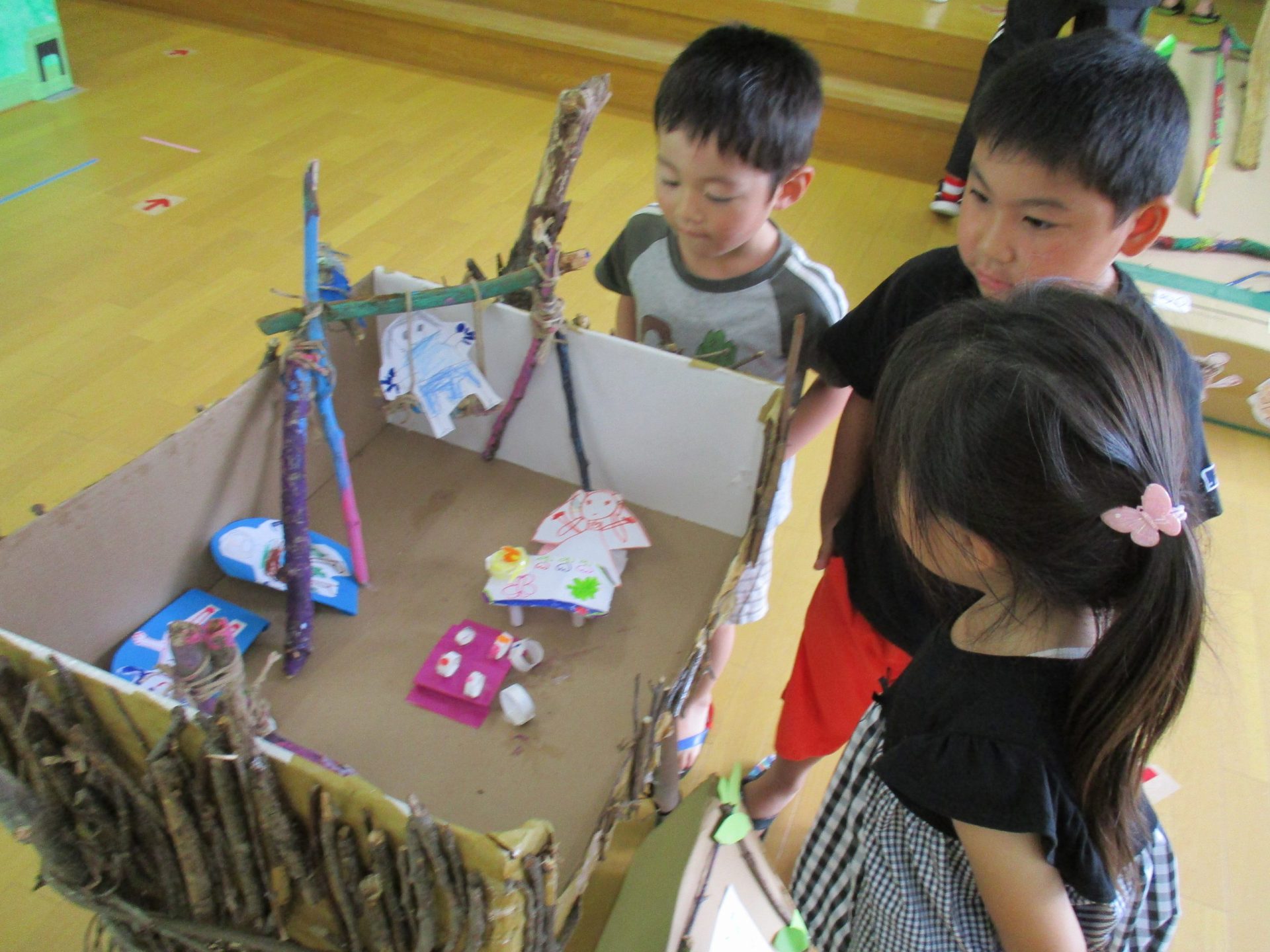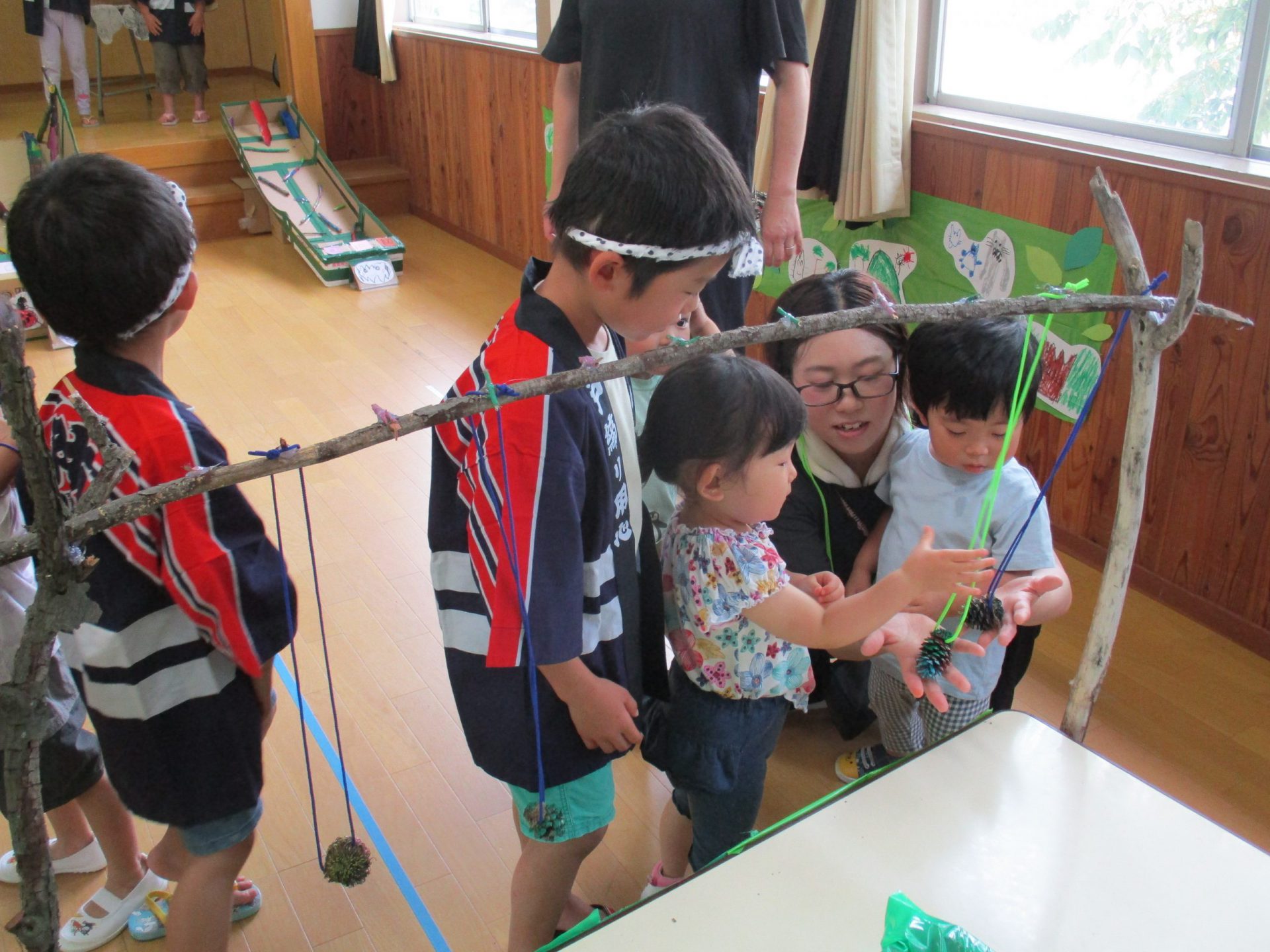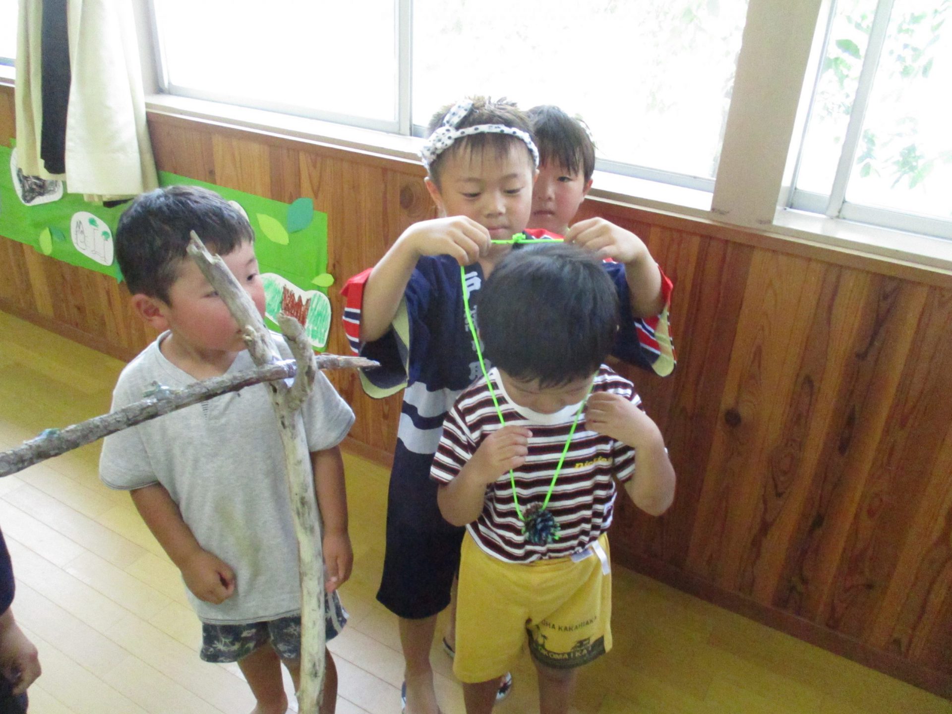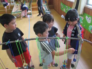 今までは保育士に聞くことが多かった子ども達。山の中から使えそうと集めてきた枝や木の実を、どう組み立てたら立てられるのか、どうくっつけたら出来るかな・・・と友達同士で相談して作っていく姿がたくさん見られました。