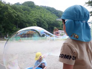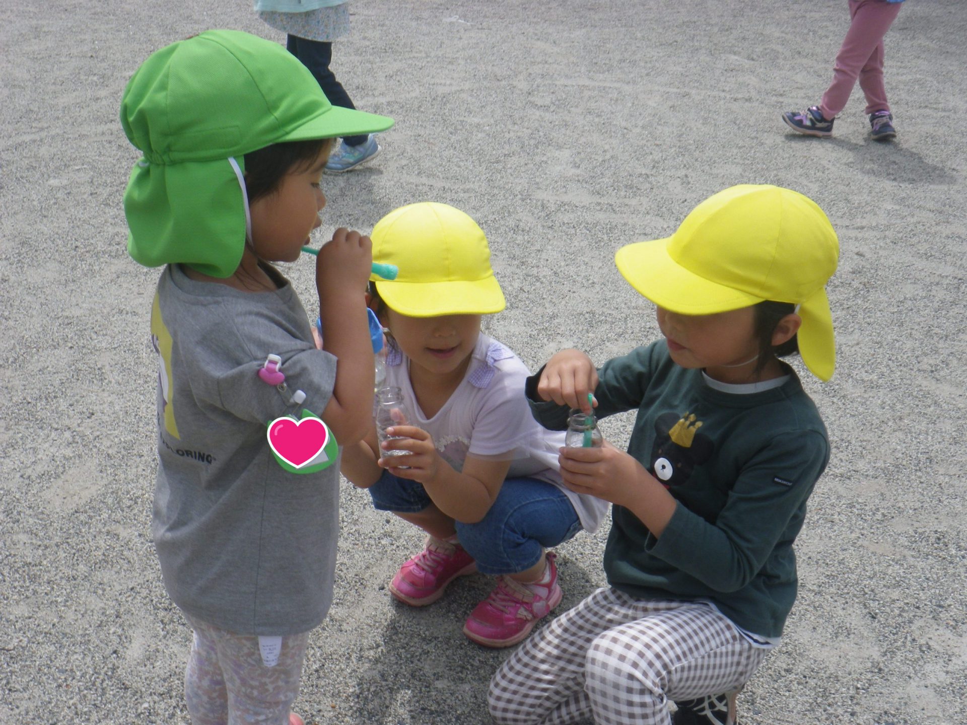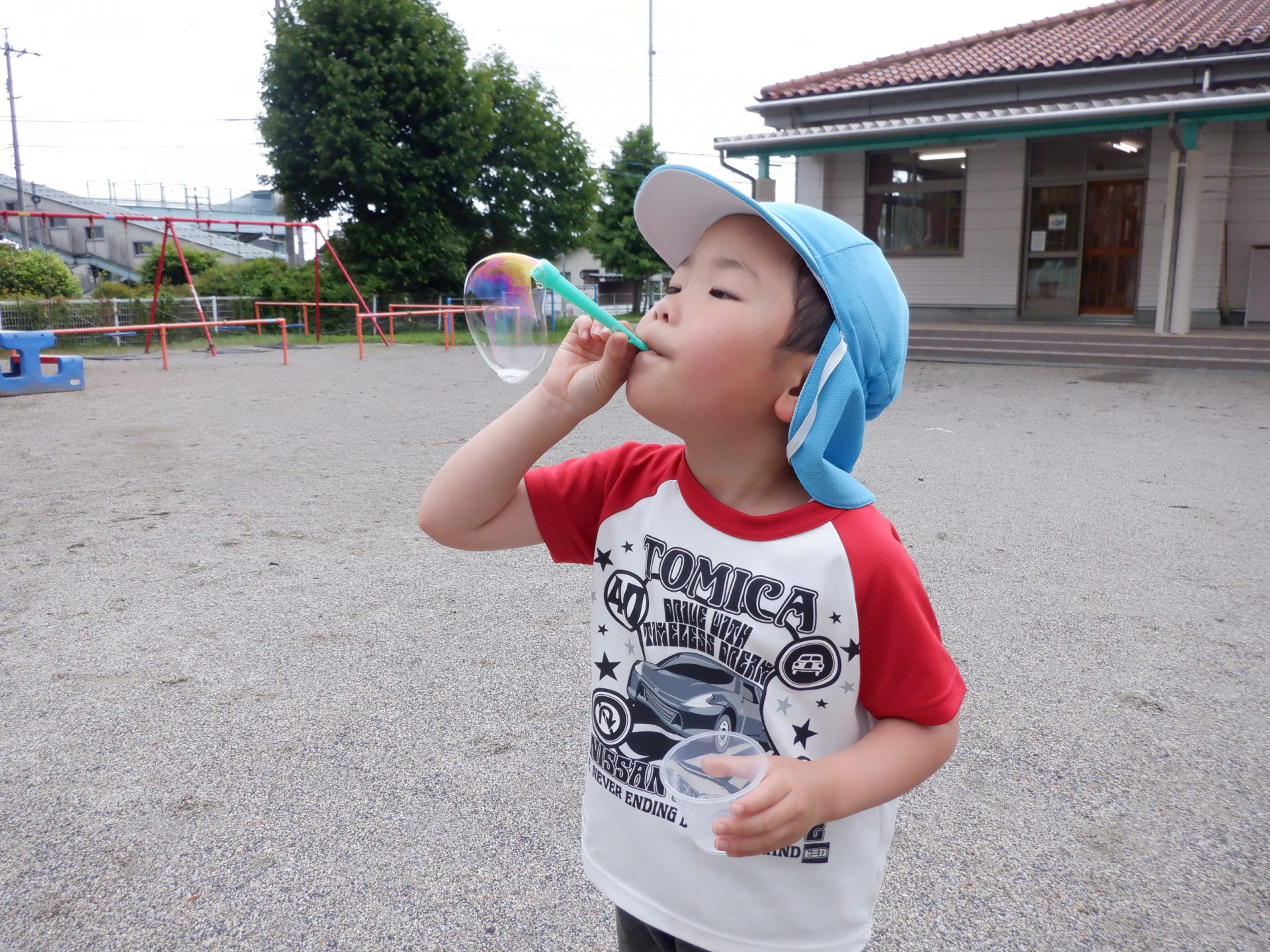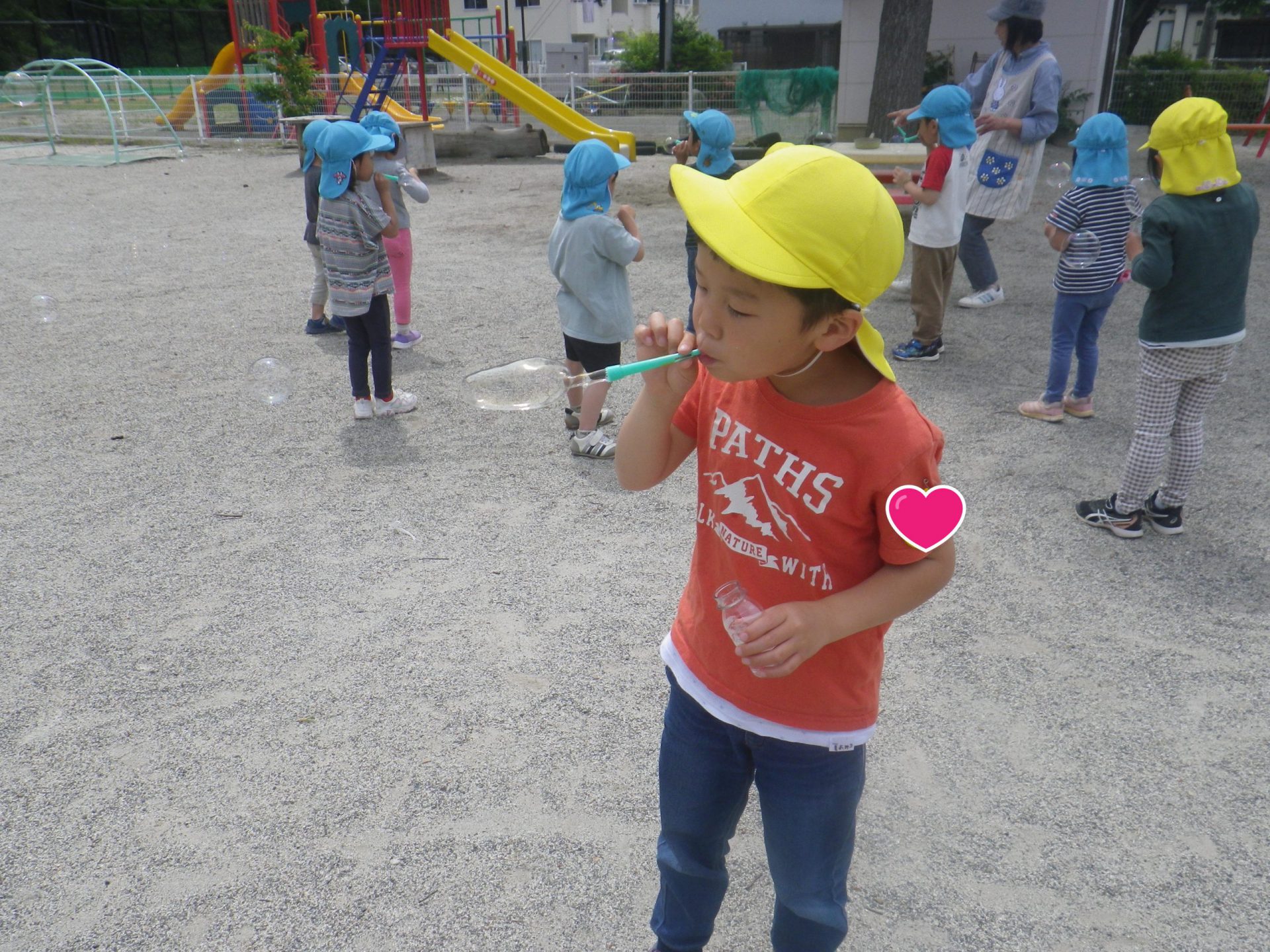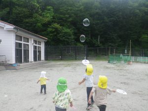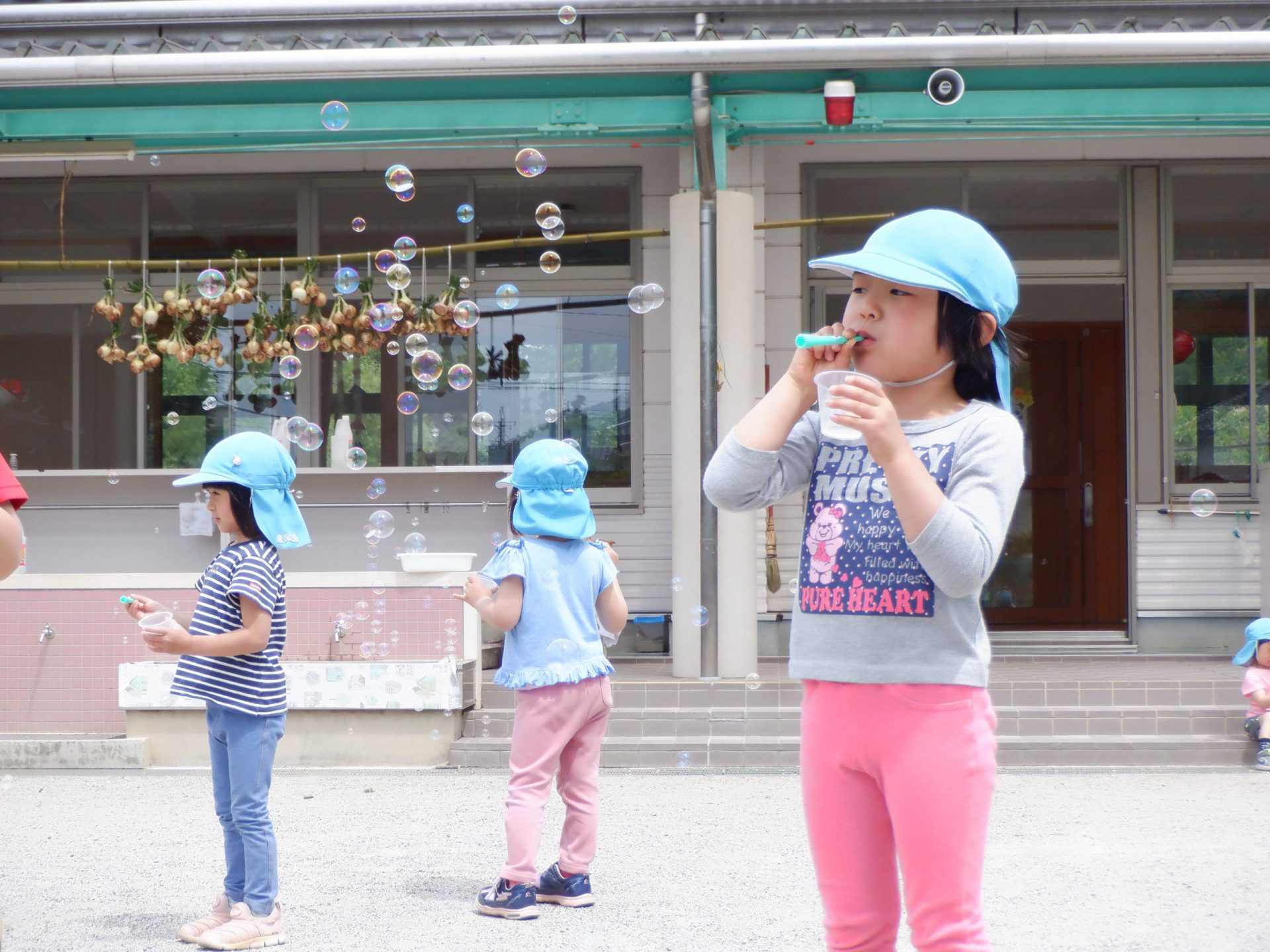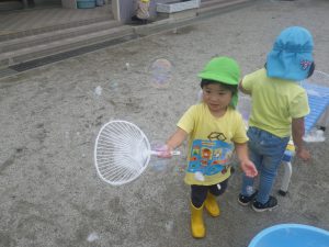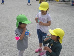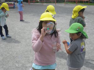 子ども達が大好きなしゃぼん玉遊び。朝からいつでも遊べるように準備しておくと、「今日もしゃぼん玉やりたい!」