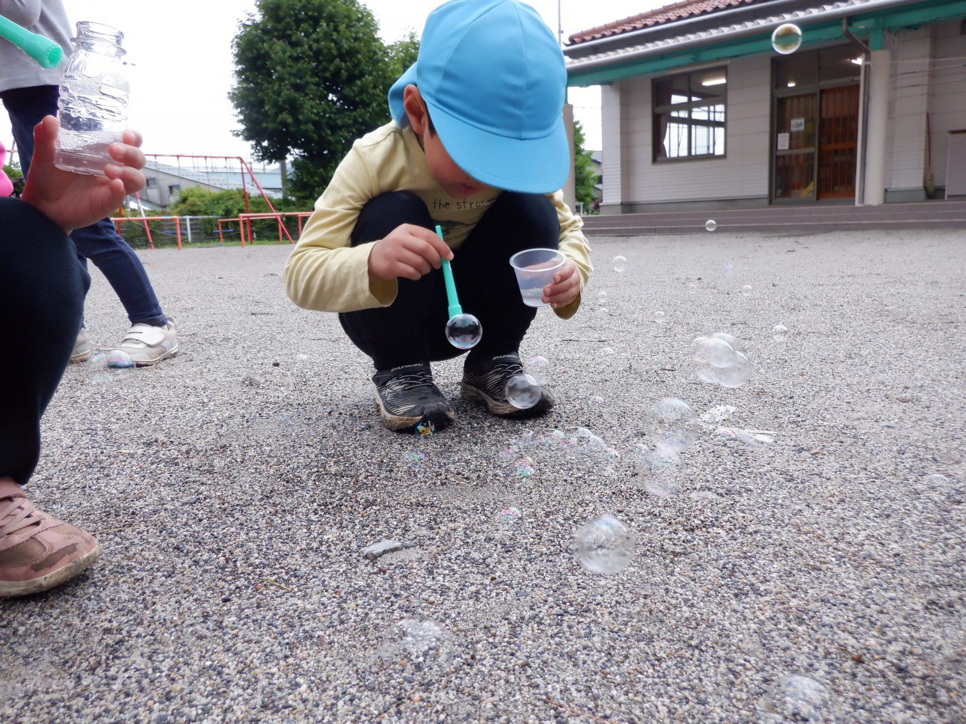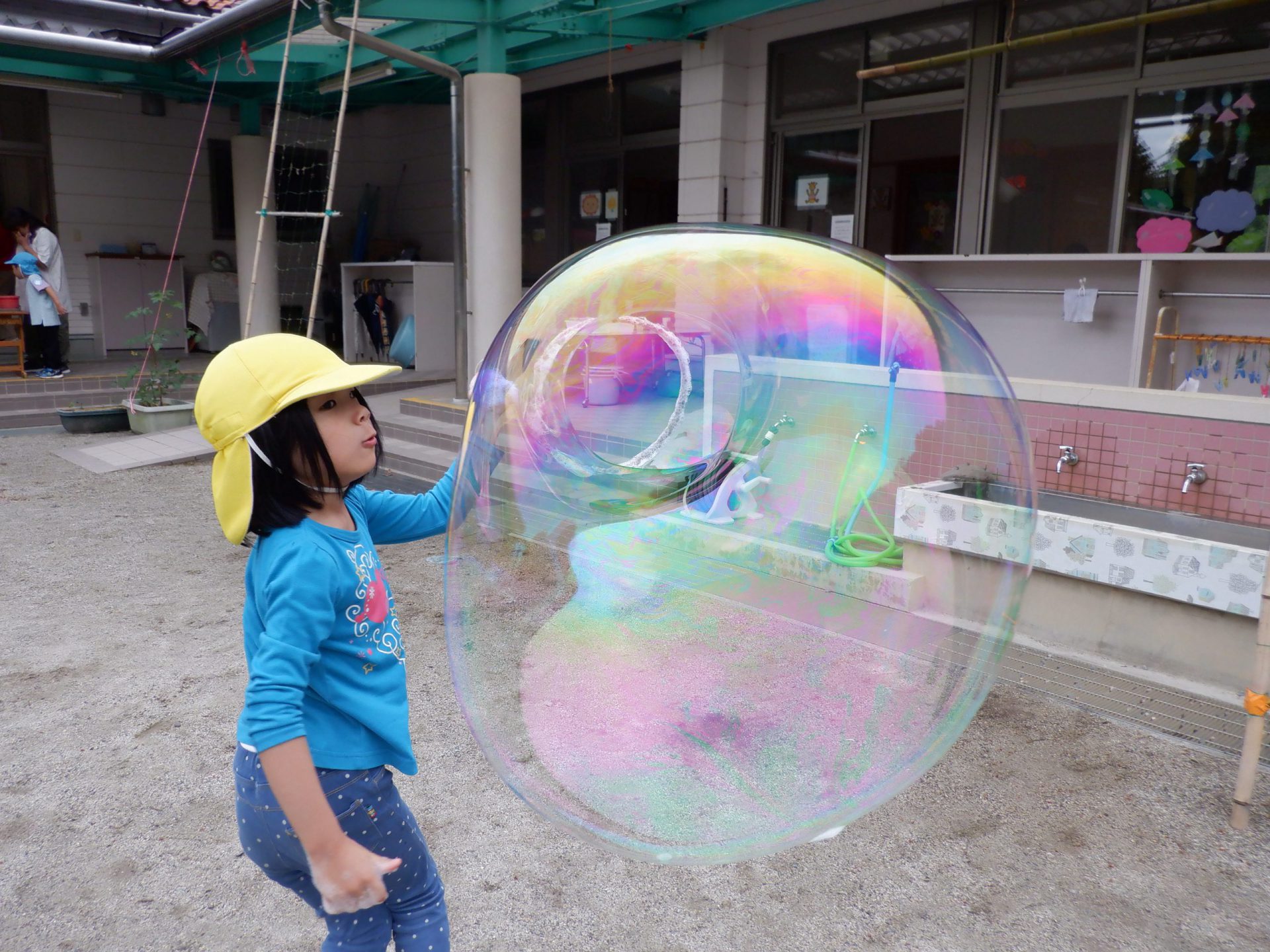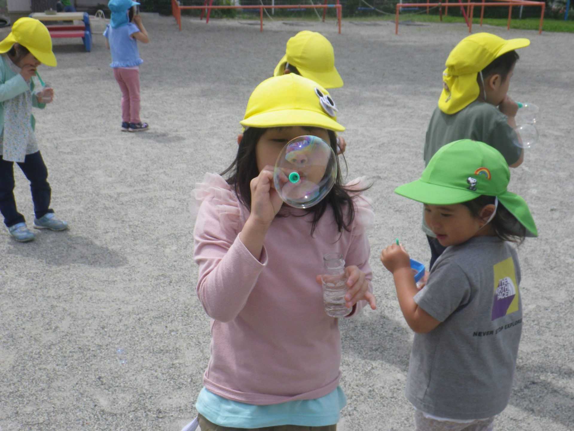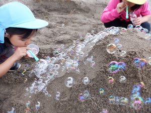 しゃぼん玉遊びを通して、友達同士で吹き方や様々な用具を工夫して試したり、考えたりする体験ができ、繰り返し楽しむ中で性質や不思議さに気付け、園全体の子ども達で楽しさを共有することができました。