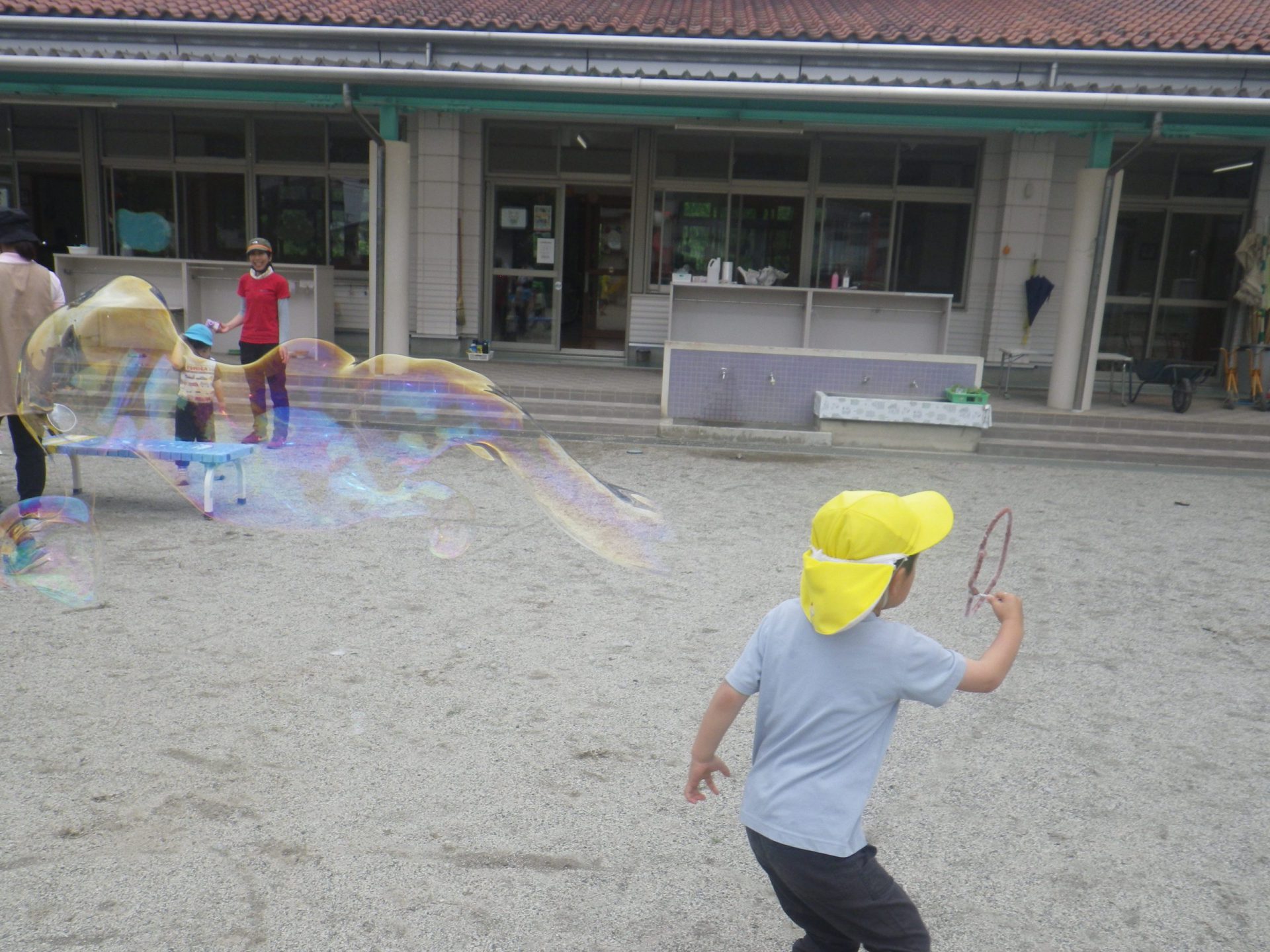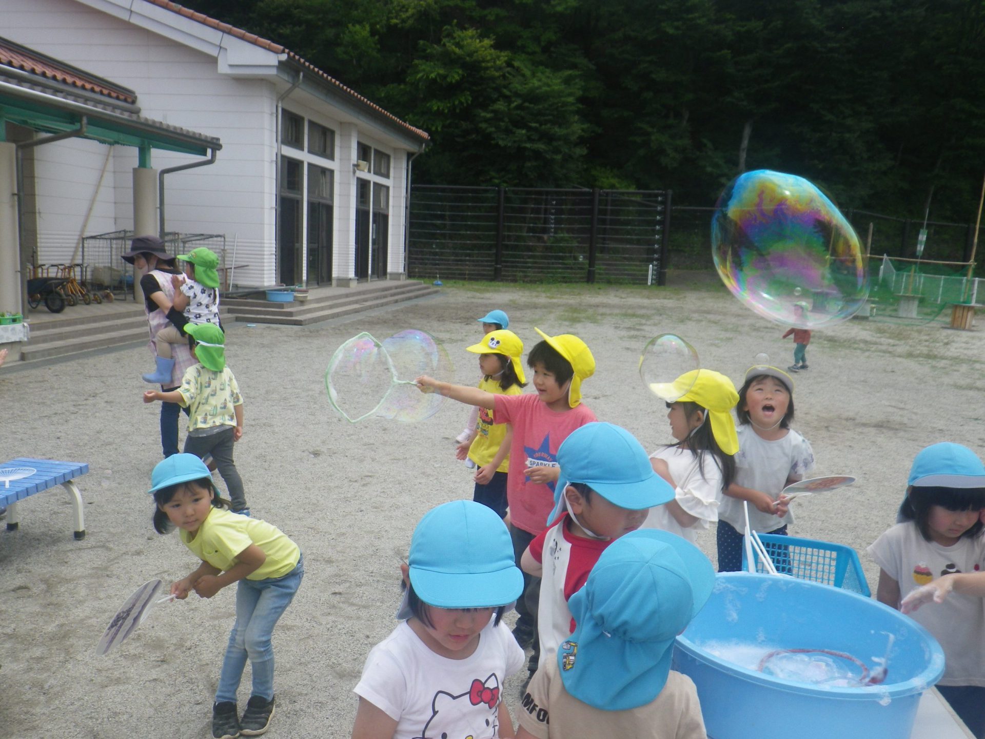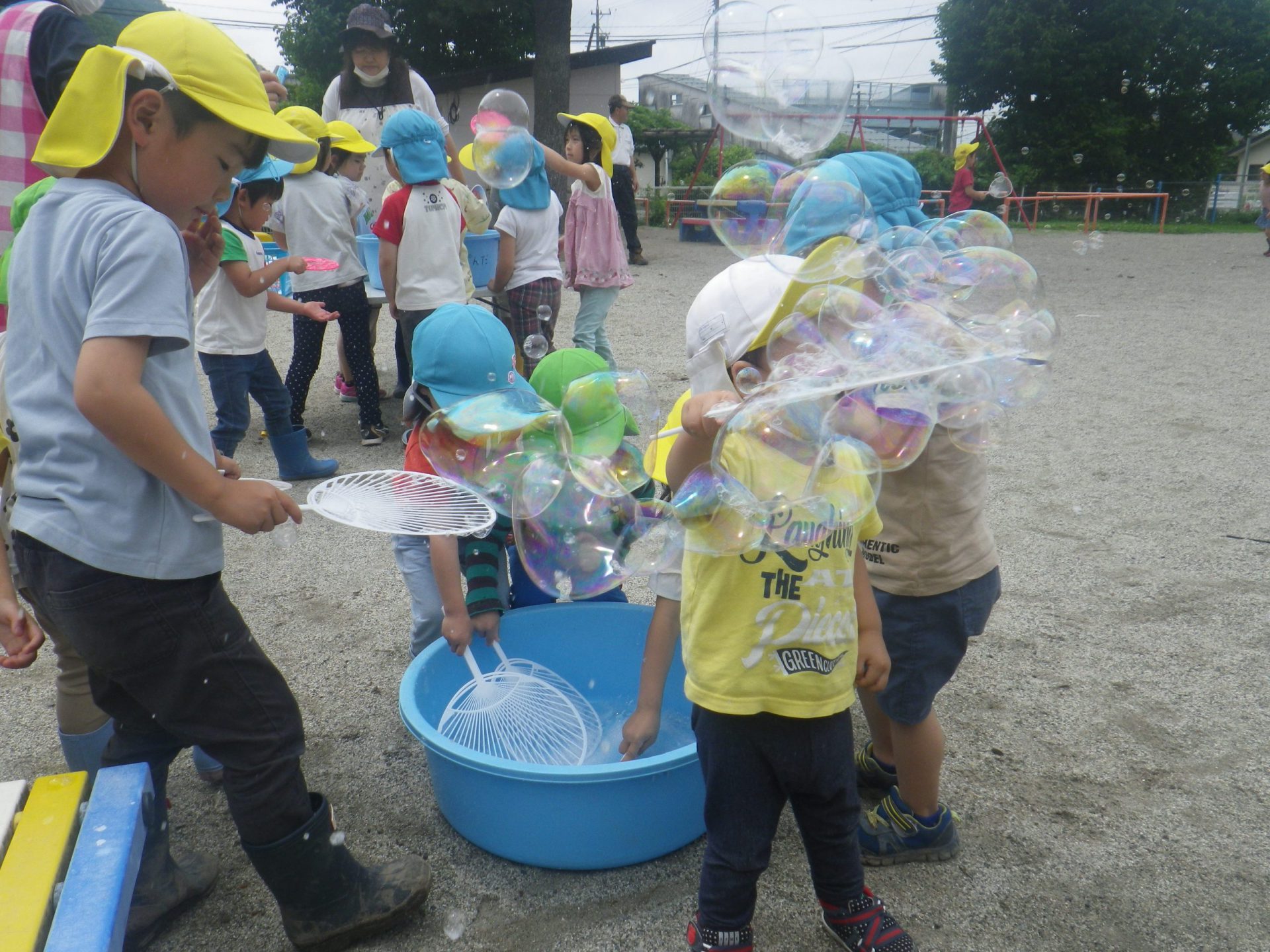 しゃぼん玉遊びを通して、友達同士で吹き方や様々な用具を工夫して試したり、考えたりする体験ができ、繰り返し楽しむ中で性質や不思議さに気付け、園全体の子ども達で楽しさを共有することができました。
