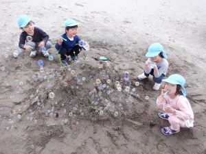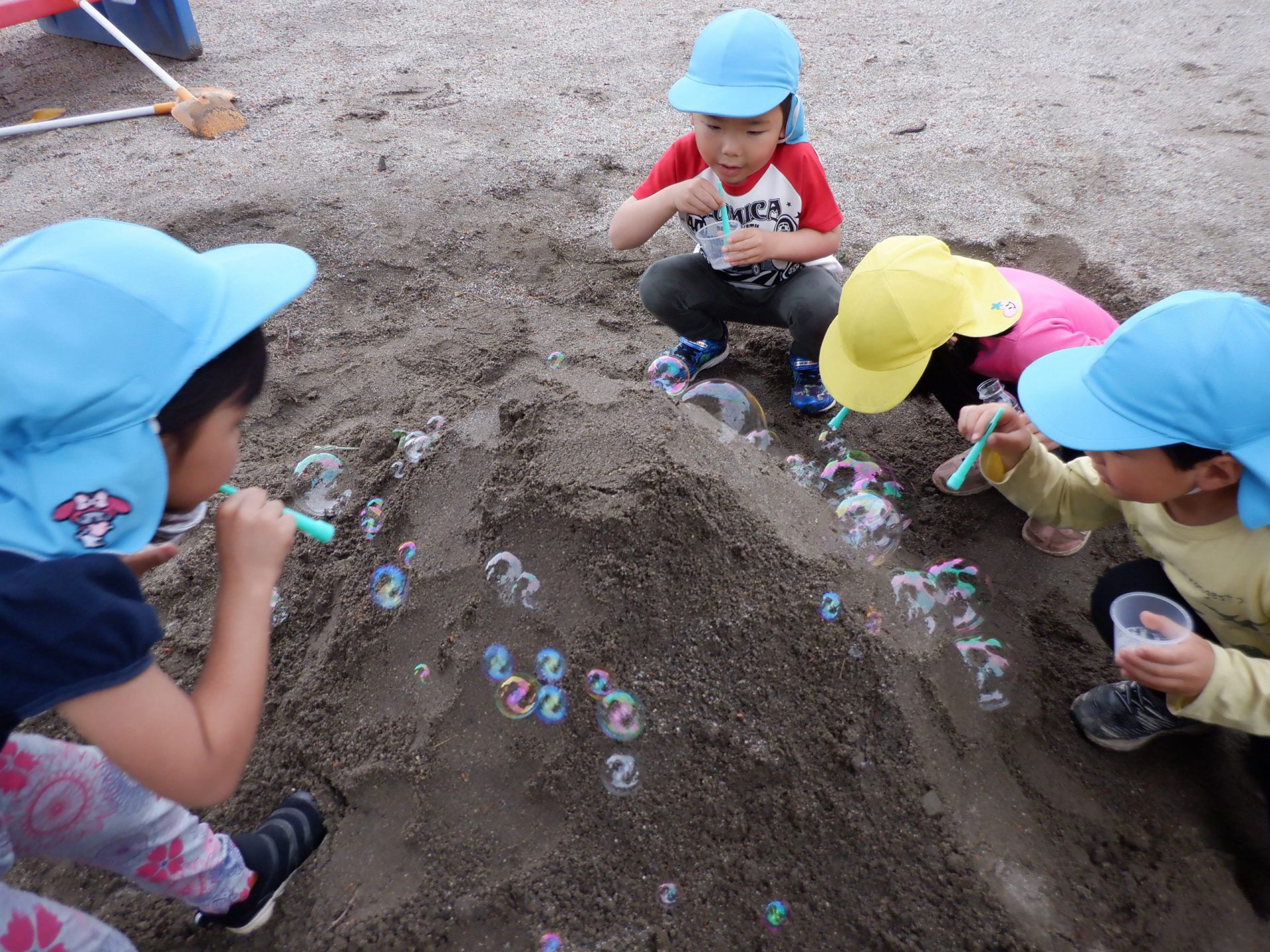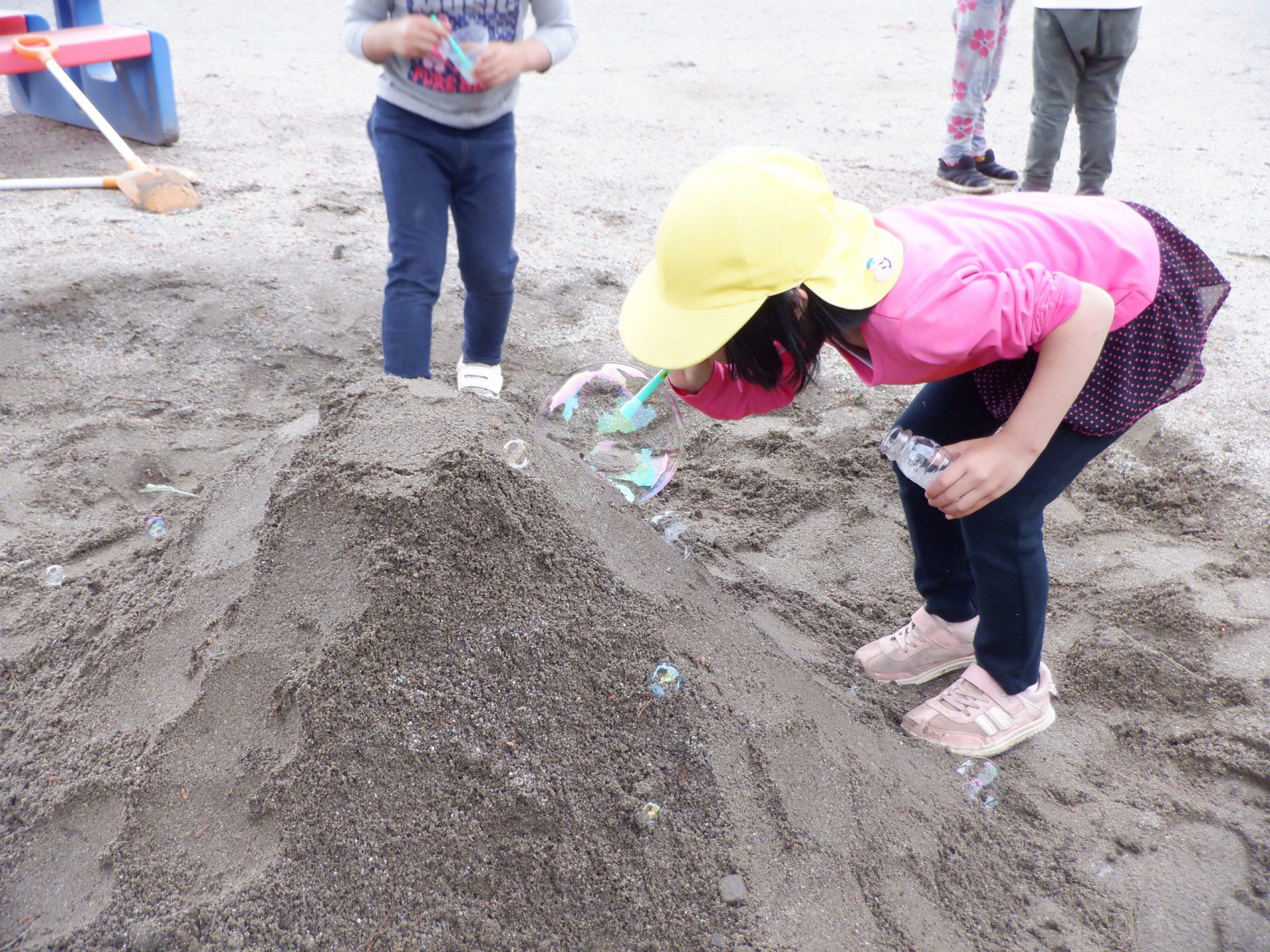 だんだん友達が集まって 皆でしゃぼん玉を砂山につけて・・・「おもしろい!」