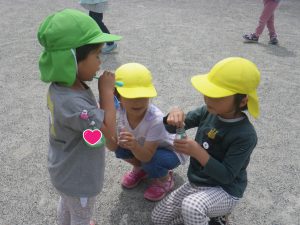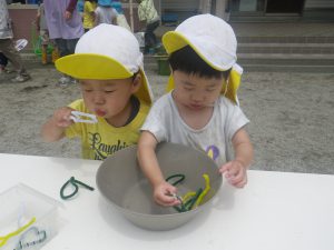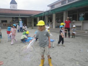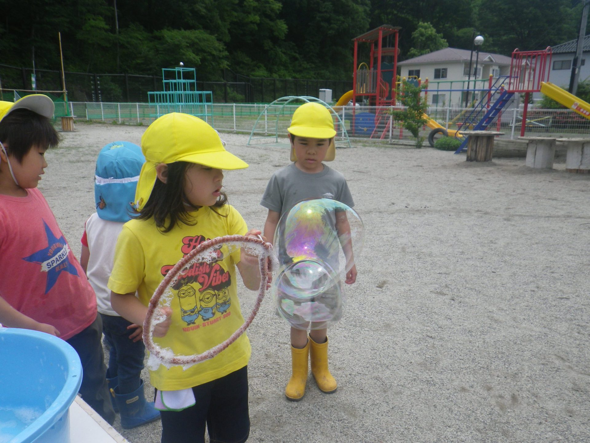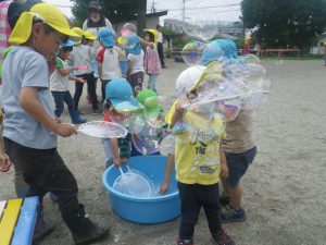 園全体の子どもたちの興味がしゃぼん玉に向かい、試したり、不思議さに気がついたりして楽しむ姿が見られたので、誕生会のお楽しみにモール・うちわ等様々なしゃぼん玉遊びの道具を用意してみました。