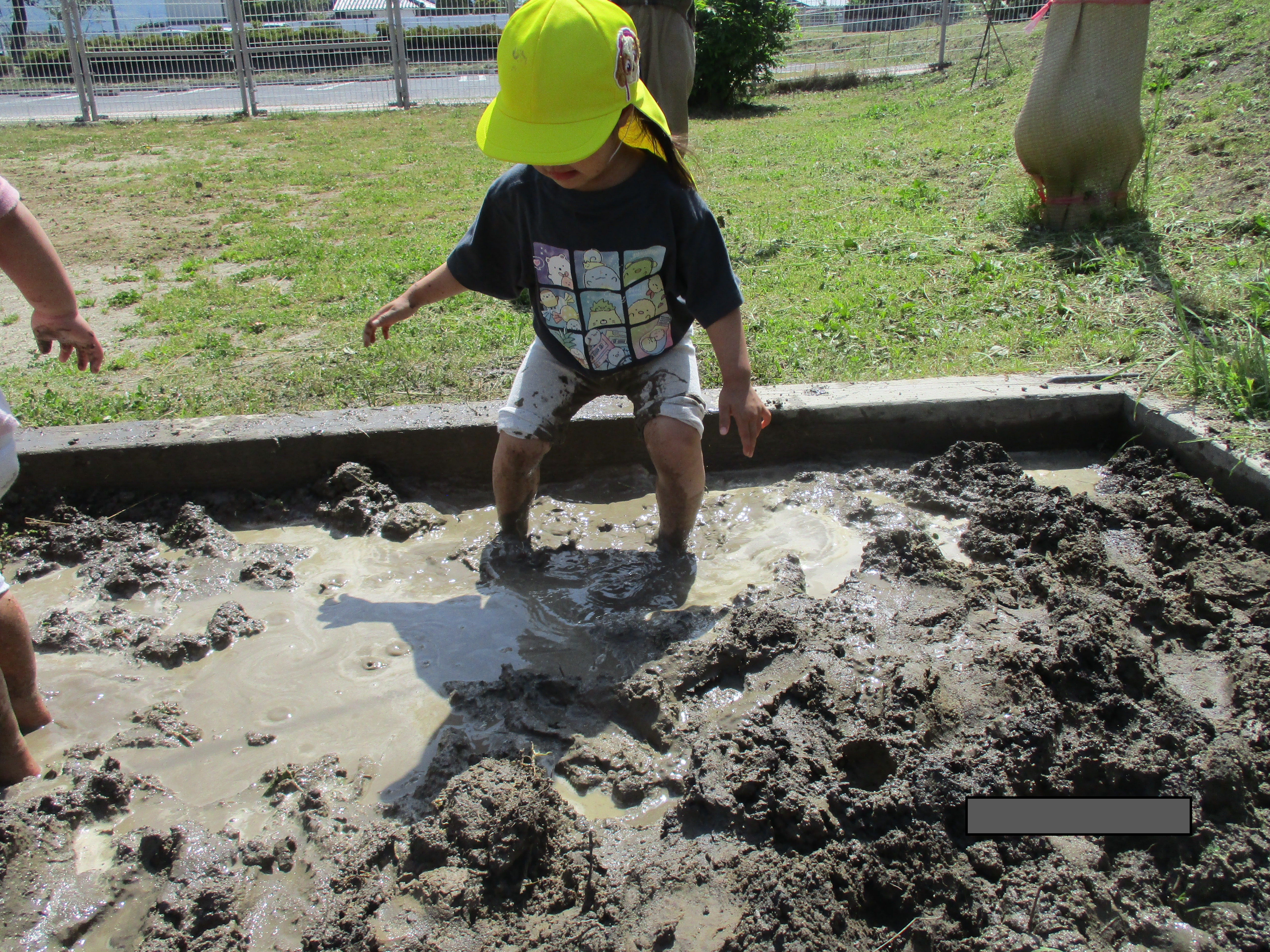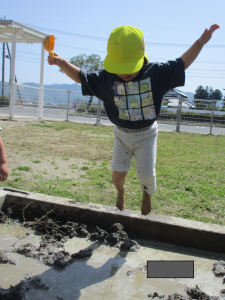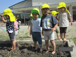 はだしで泥んこ庭で遊びました。「泥んこ庭に入ってみよう‼」