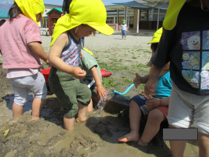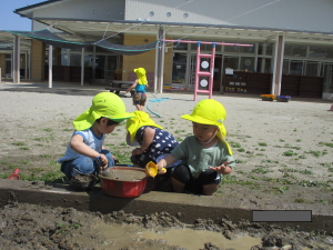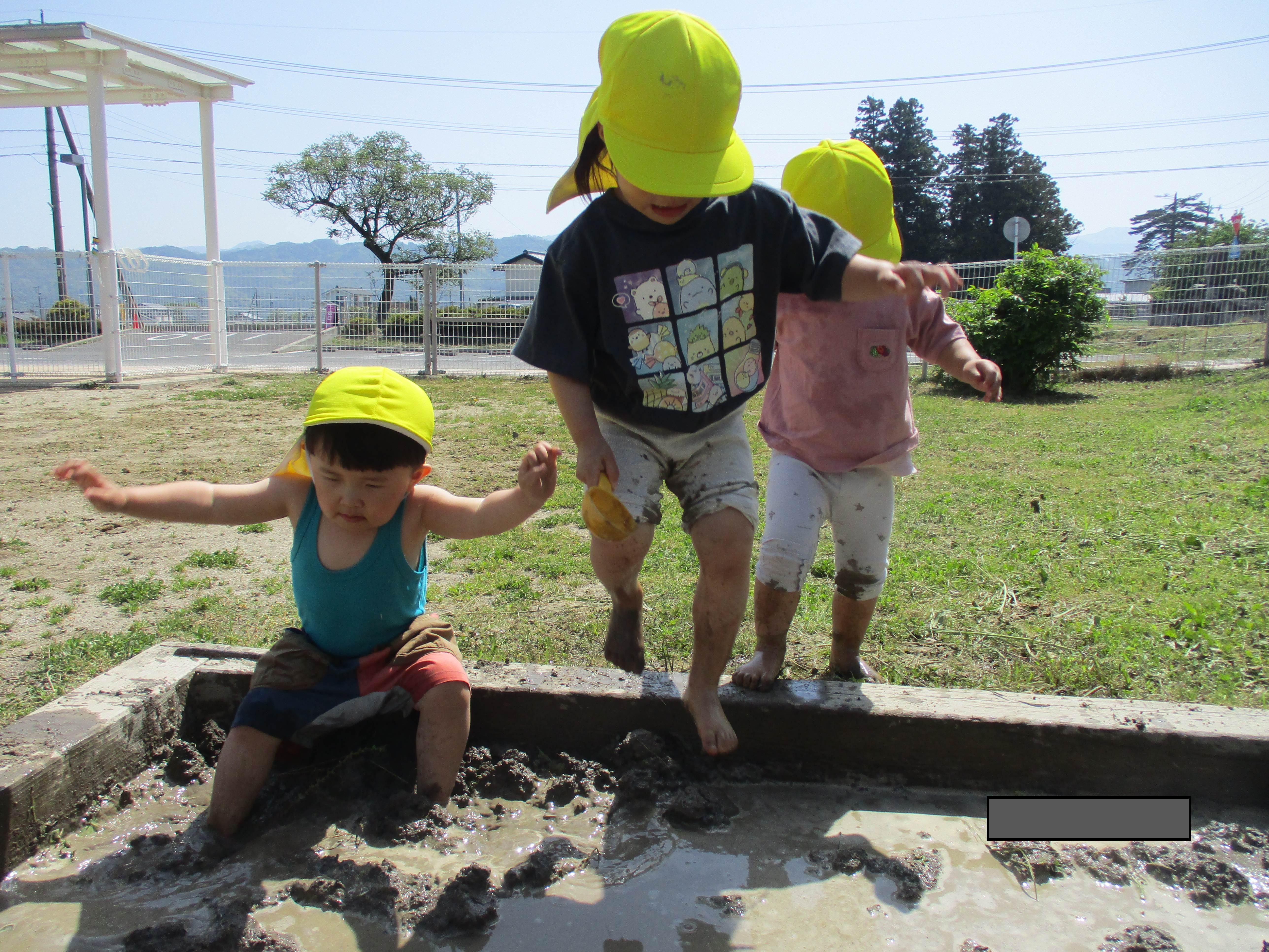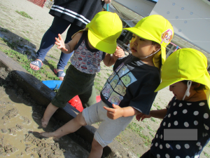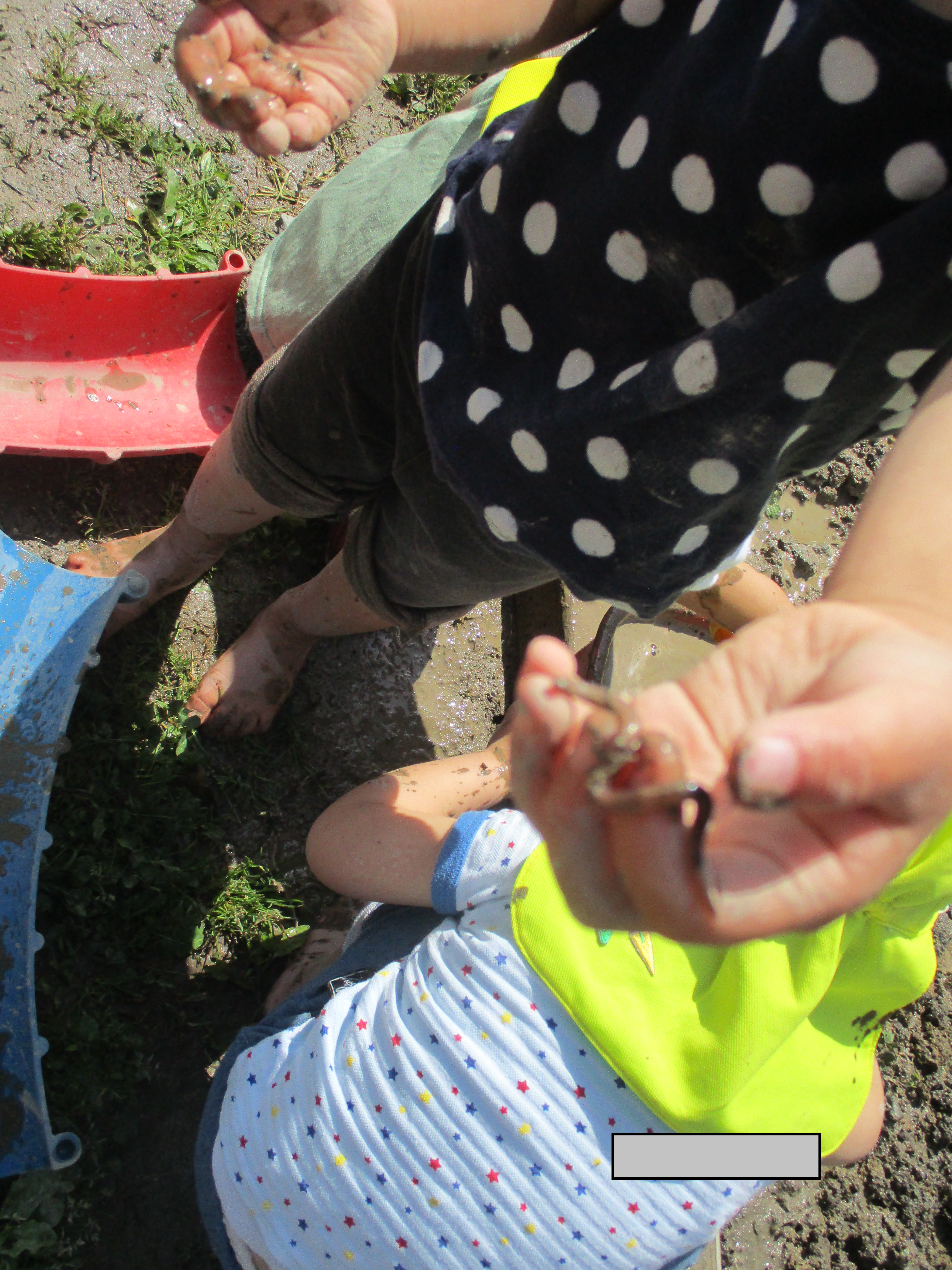 ・ダイナミックに遊ぶ子、汚れるのを気にする子、お友達のことが気になって真似しようとする子、様々な姿を見せてくれます。それぞれのペース、思いを大切にしながら見守っていきたいです。
