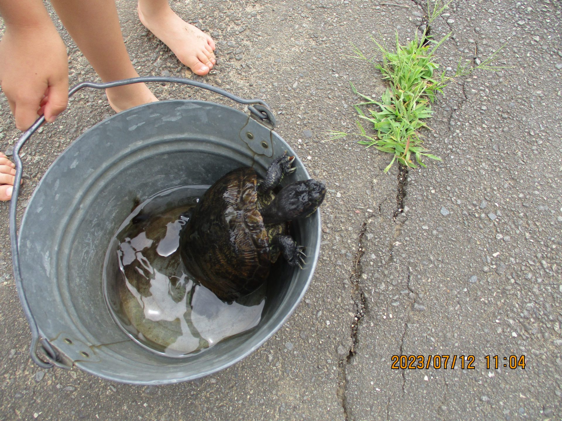 カメを捕まえた後の、子どもたちの「このカメさんをどうするか会議」