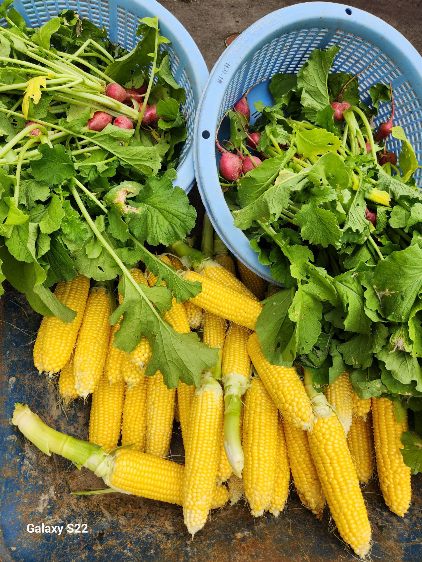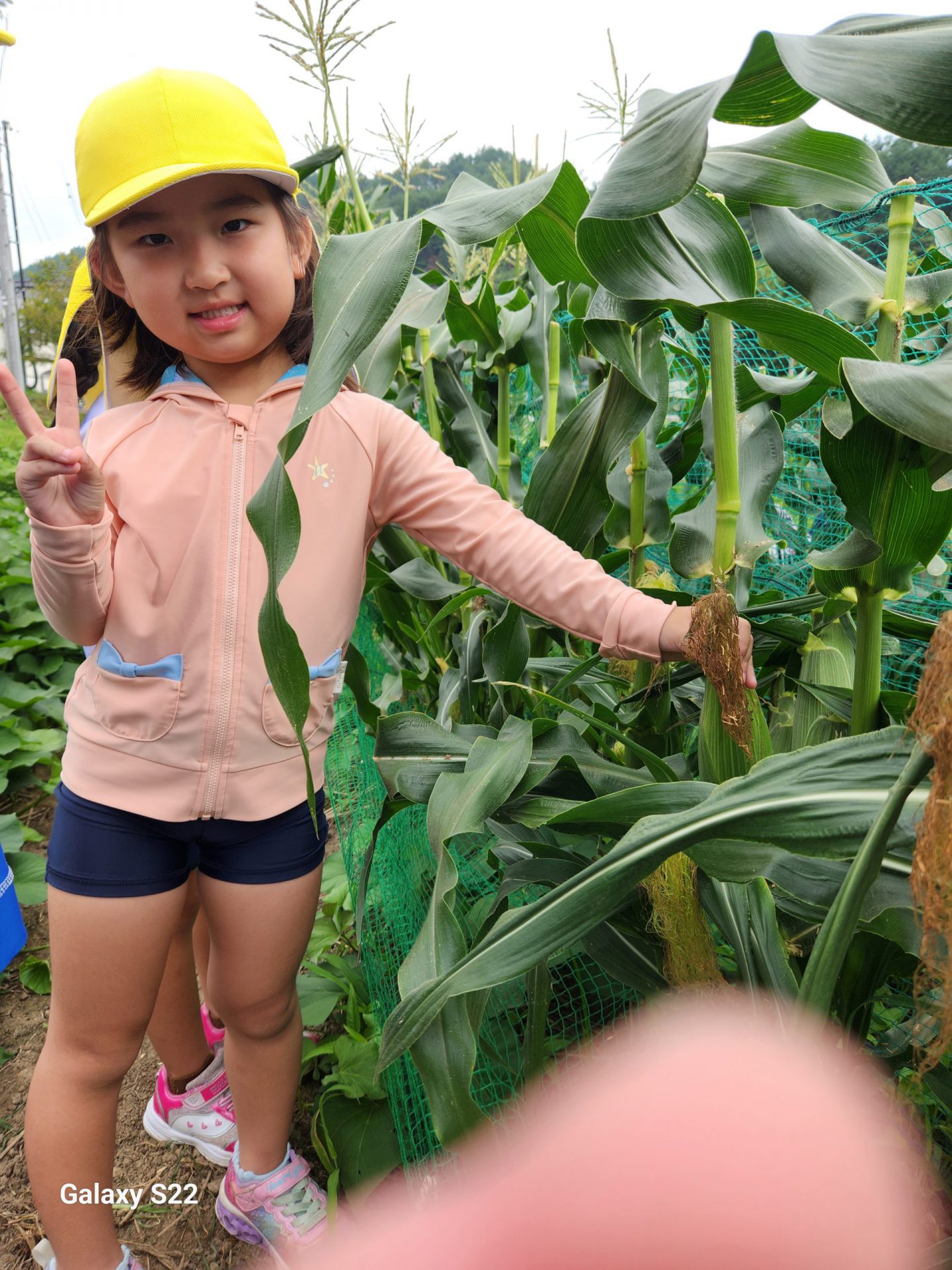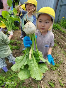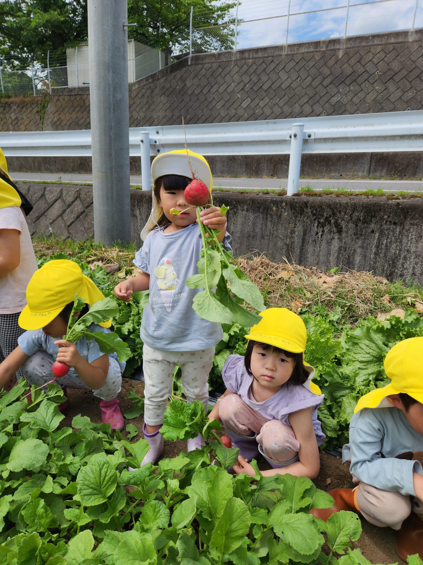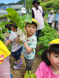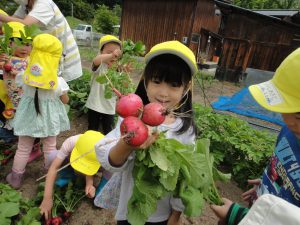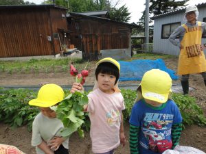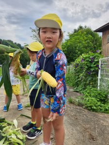 畑では、二十日大根、カブ、ナス、トウモロコシの収穫をしました。