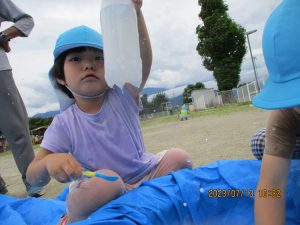 「アルプスウォーターランド」と名付けた園庭で様々な水遊びを楽しんだ子ども達。
