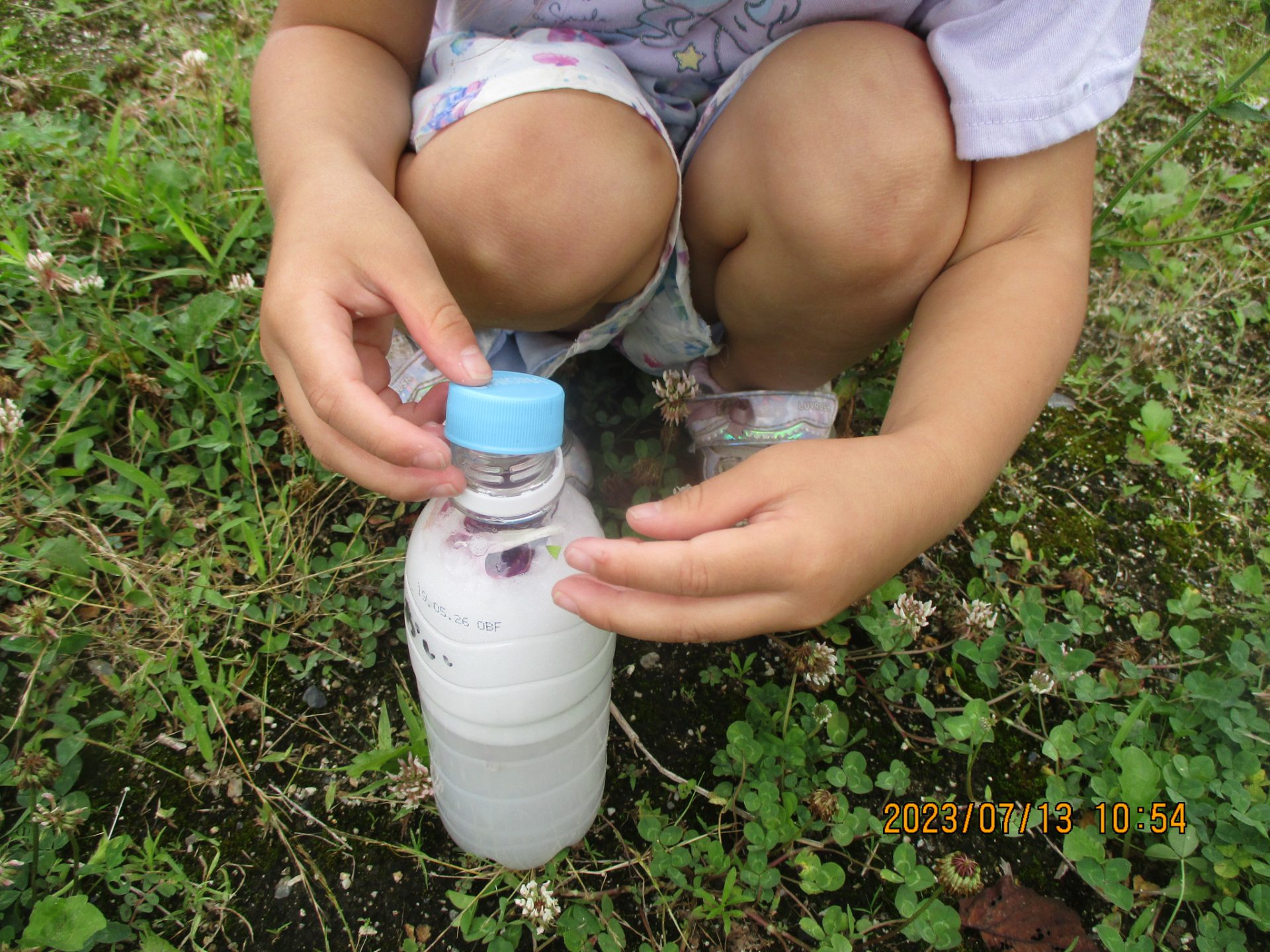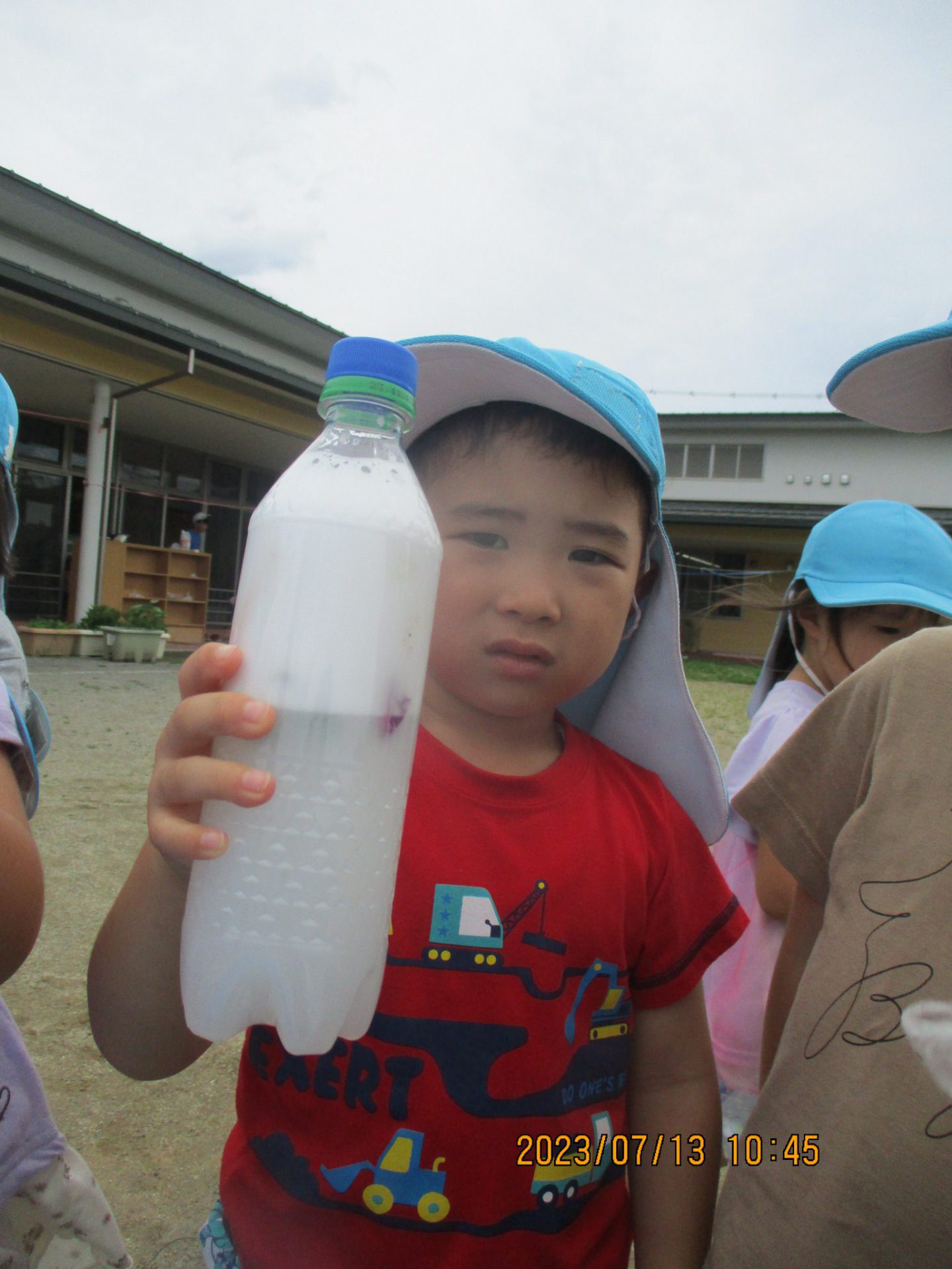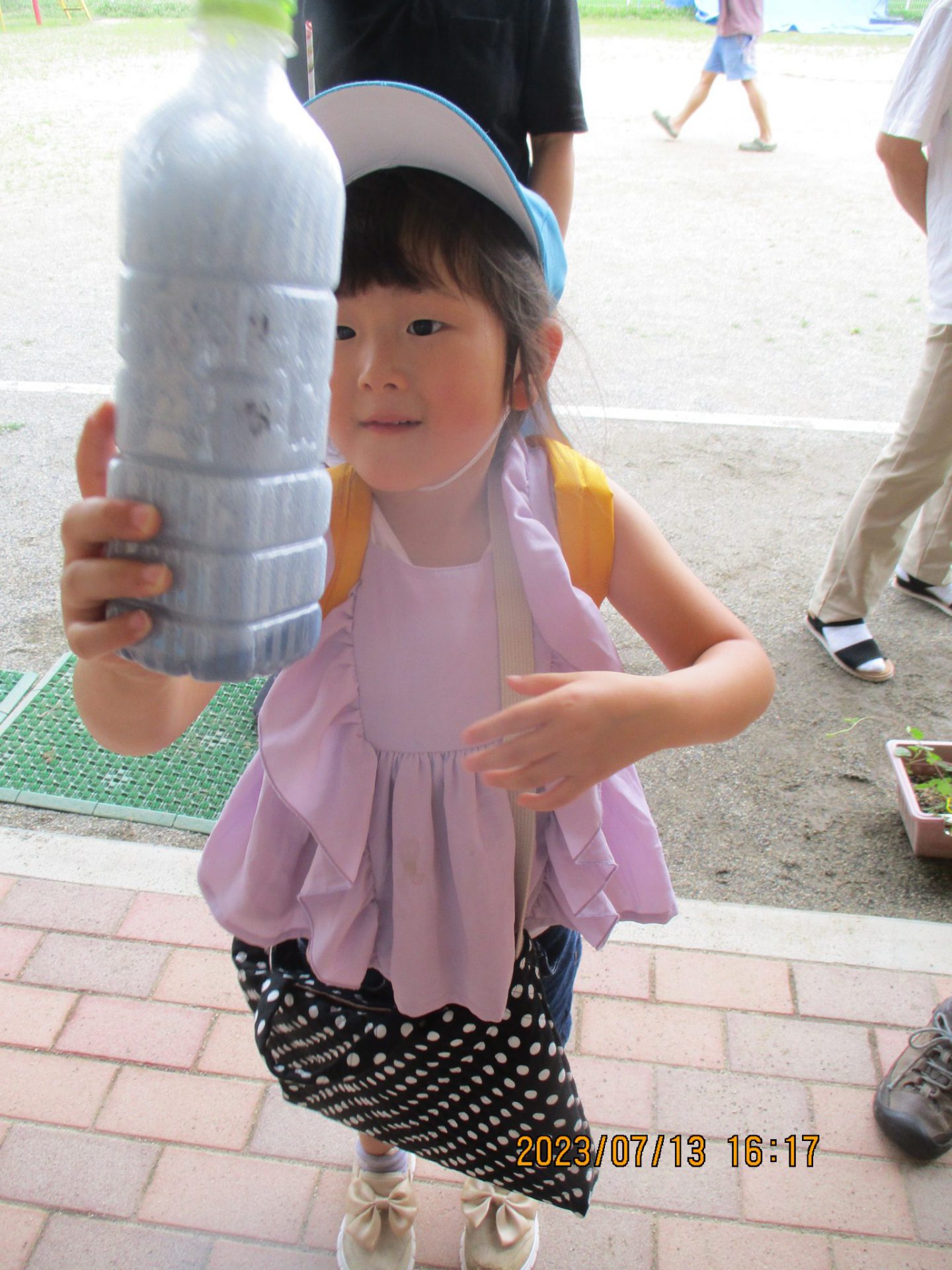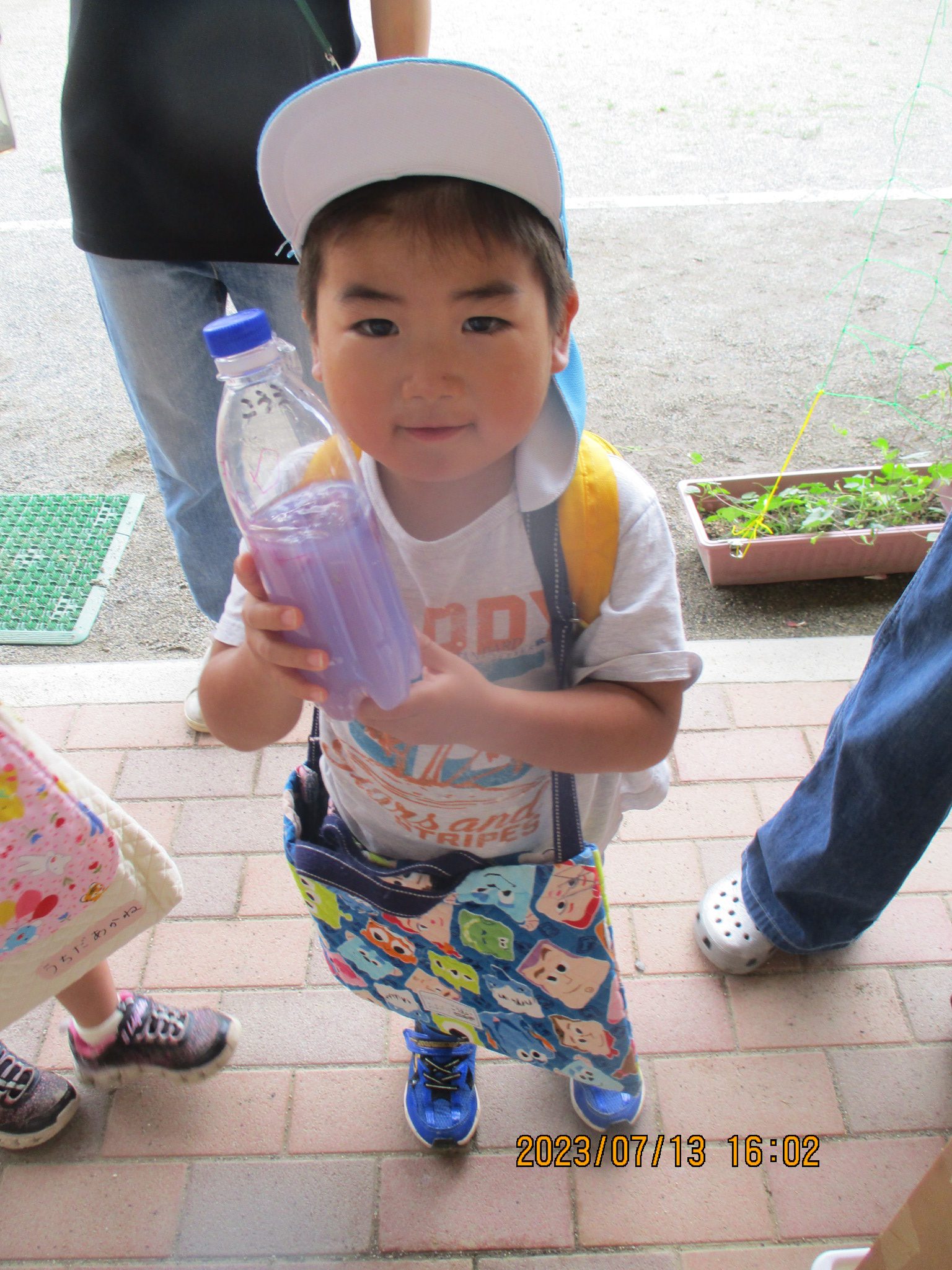 夕方、迎えに来たお家の方にペットボトルに取っておいた色水を見せようとした時…。