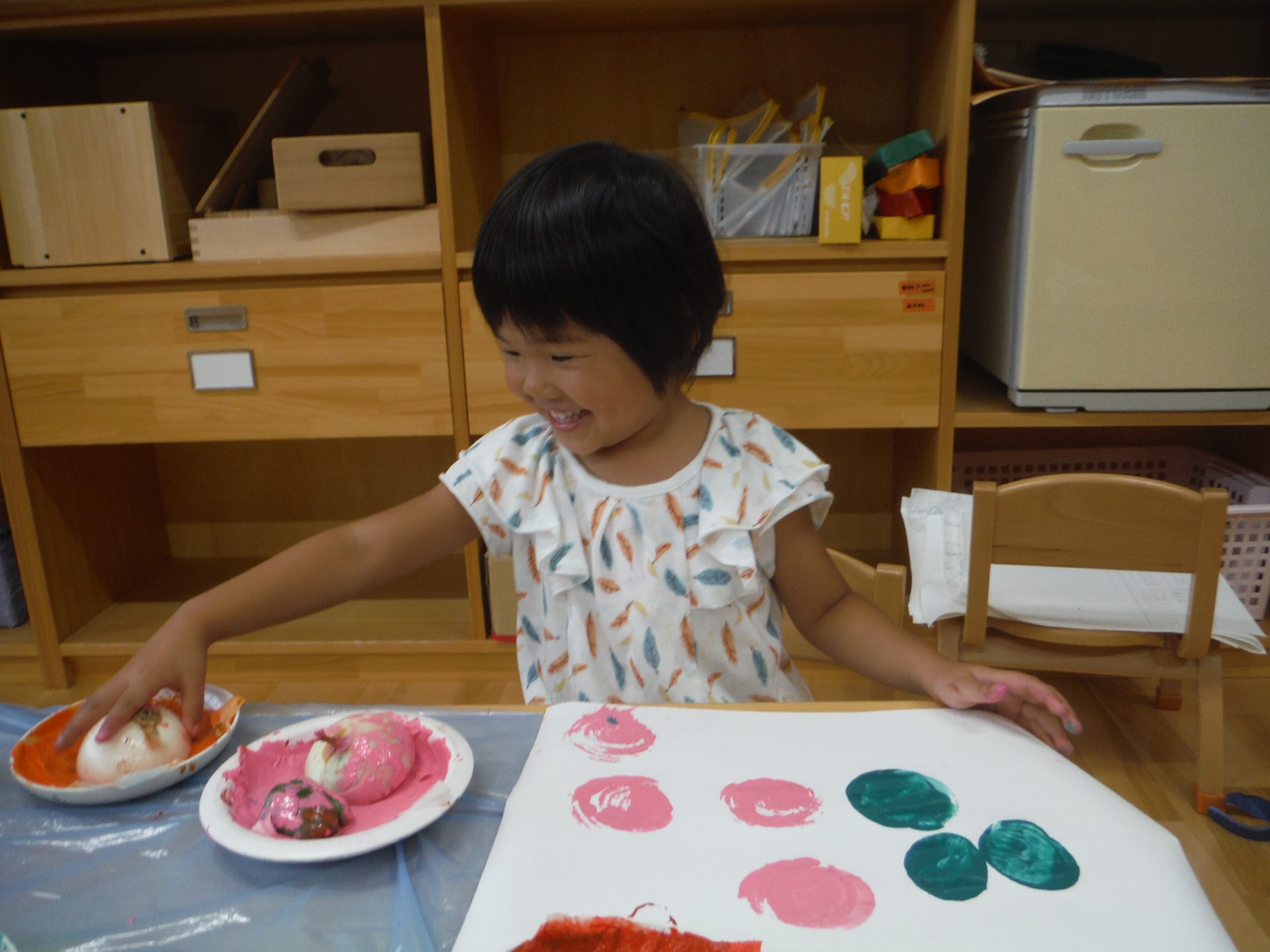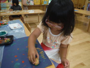色々な色の絵の具を野菜につけて、野菜の断面の形を想像し、楽しいスタンプあそびになりました。