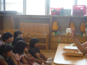 玉ねぎを輪切りにして、子ども達に見せているところです。
