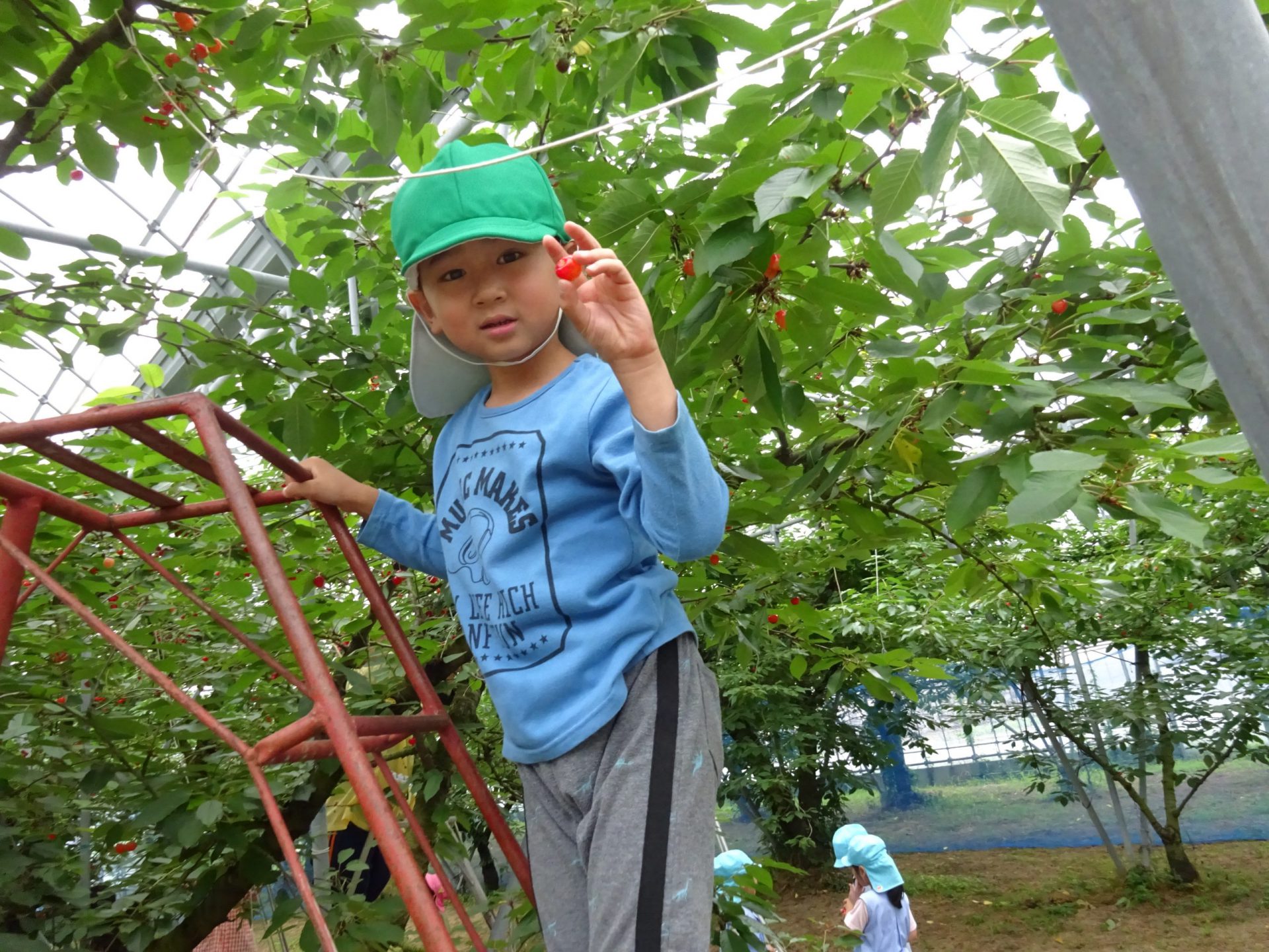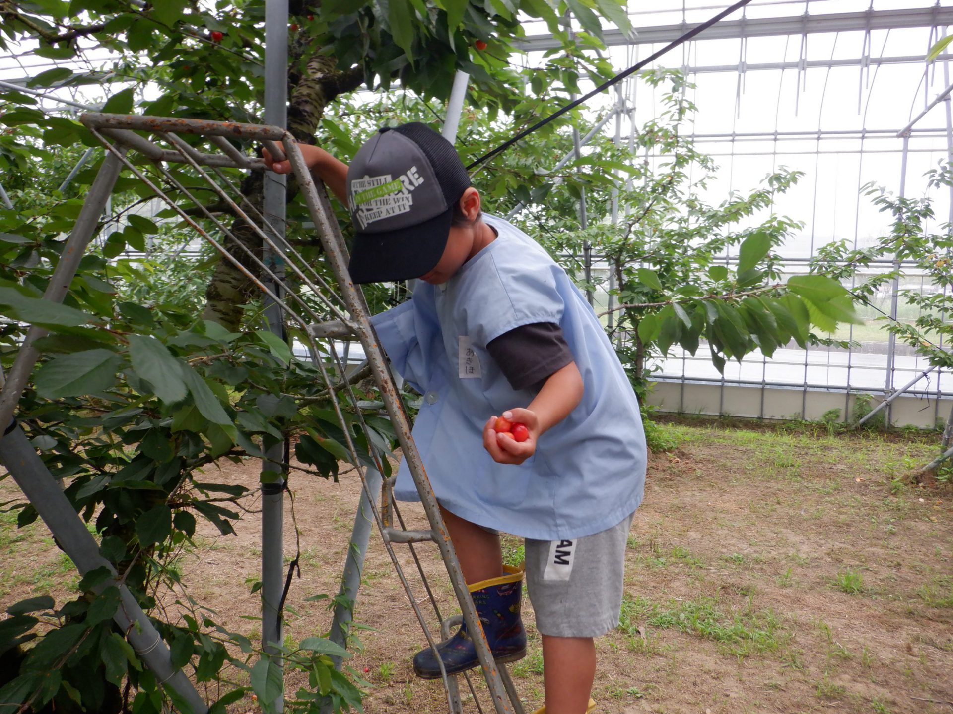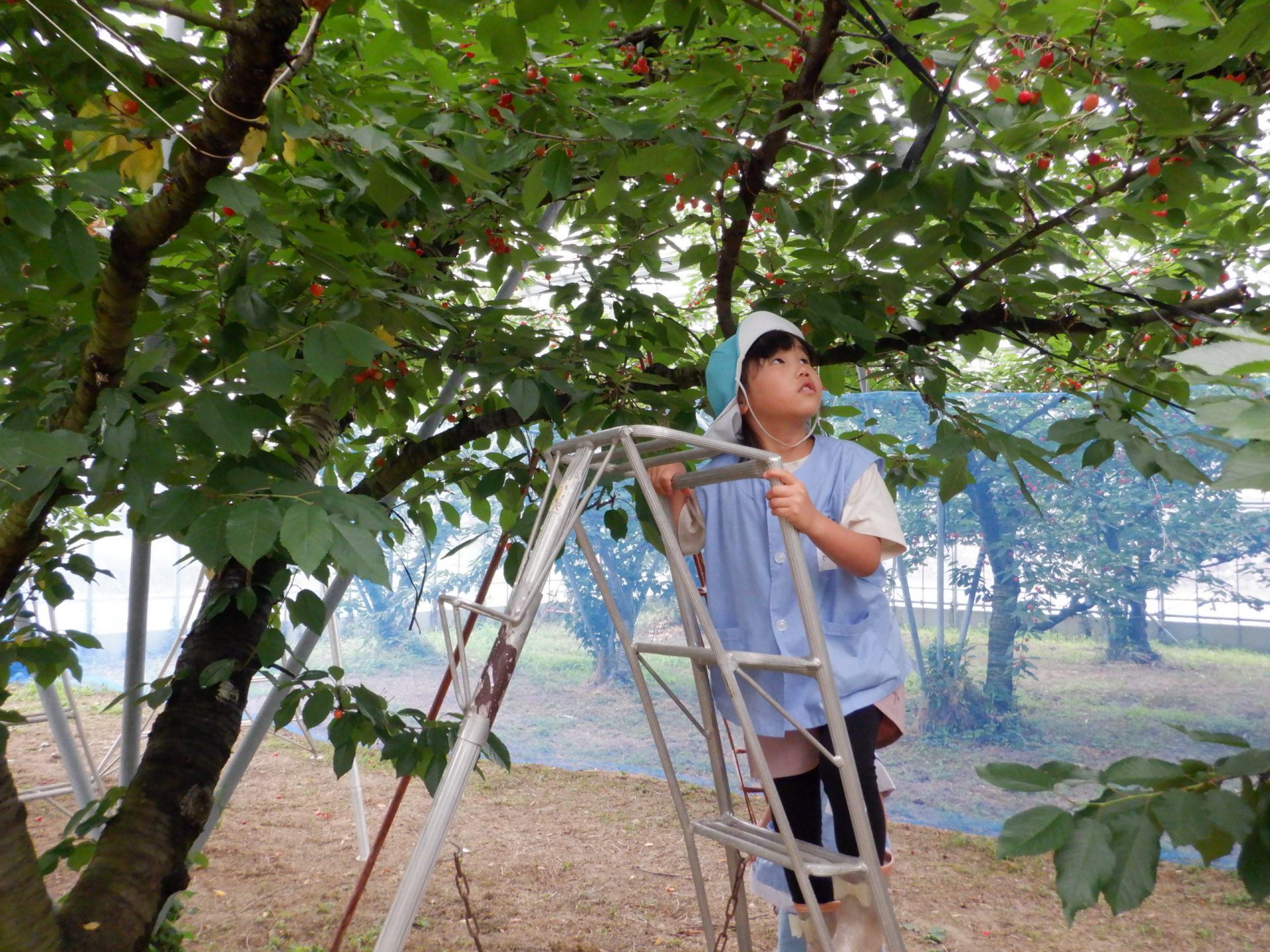 ・さくらんぼの種の誤飲や高い脚立からの転落などないように、職員がそれぞれしっかり付いてみることで、子どもたちは日頃登れない高いところに登ったり、おいしいさくらんぼをおなかいっぱい食べることができました。自然の中に出かけることや地域の方と関わるとき、危険なこともありますが、控えてしまうのではなく、職員が事前に検討し準備することで、子どもたちは楽しい経験ができることを改めて感じました。