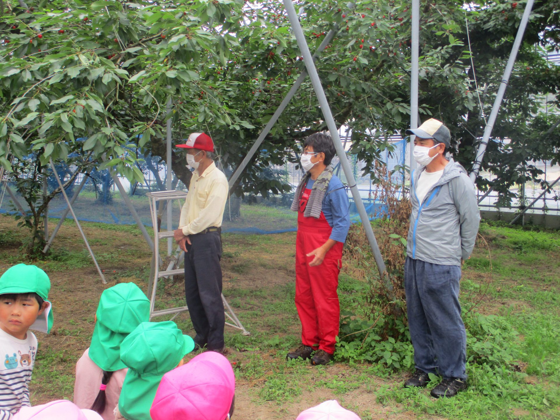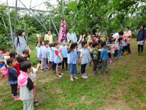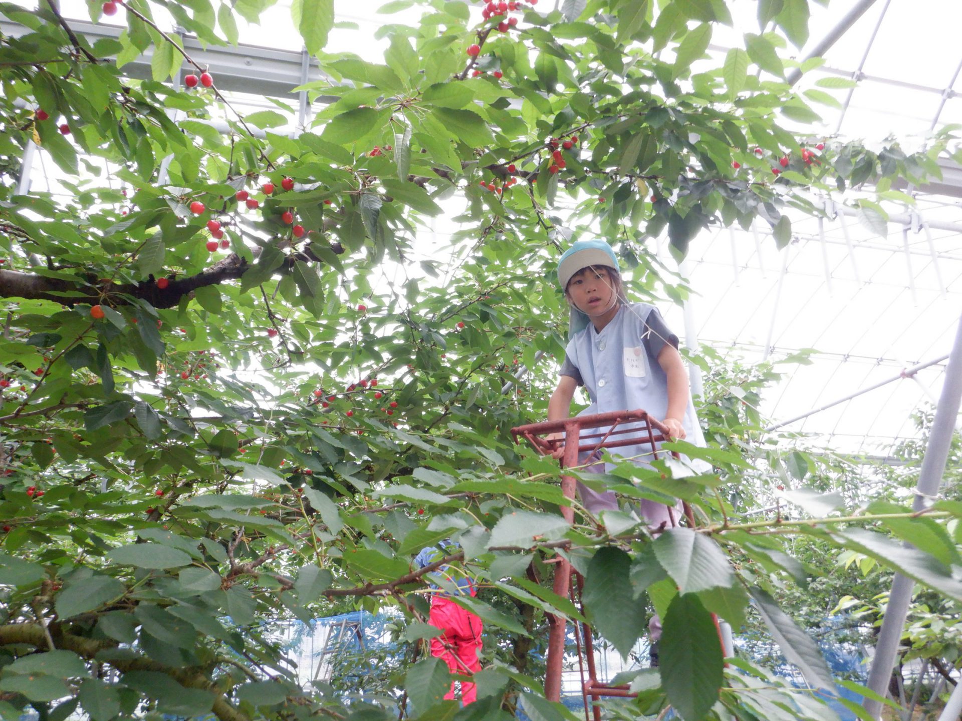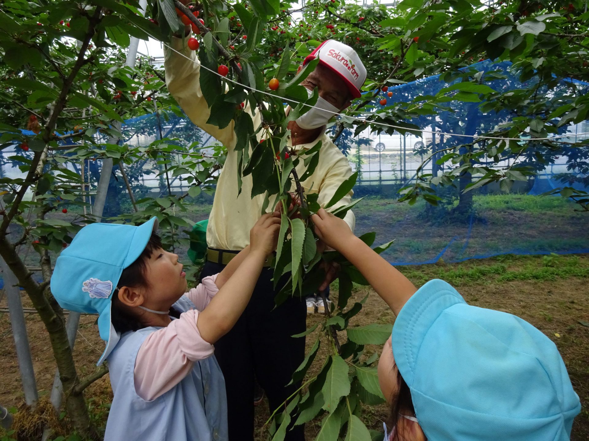 ・さくらんぼの種の誤飲や高い脚立からの転落などないように、職員がそれぞれしっかり付いてみることで、子どもたちは日頃登れない高いところに登ったり、おいしいさくらんぼをおなかいっぱい食べることができました。自然の中に出かけることや地域の方と関わるとき、危険なこともありますが、控えてしまうのではなく、職員が事前に検討し準備することで、子どもたちは楽しい経験ができることを改めて感じました。