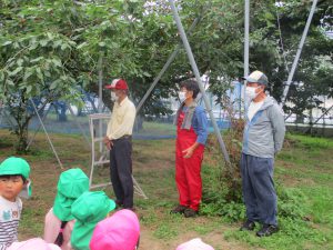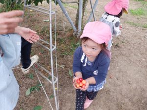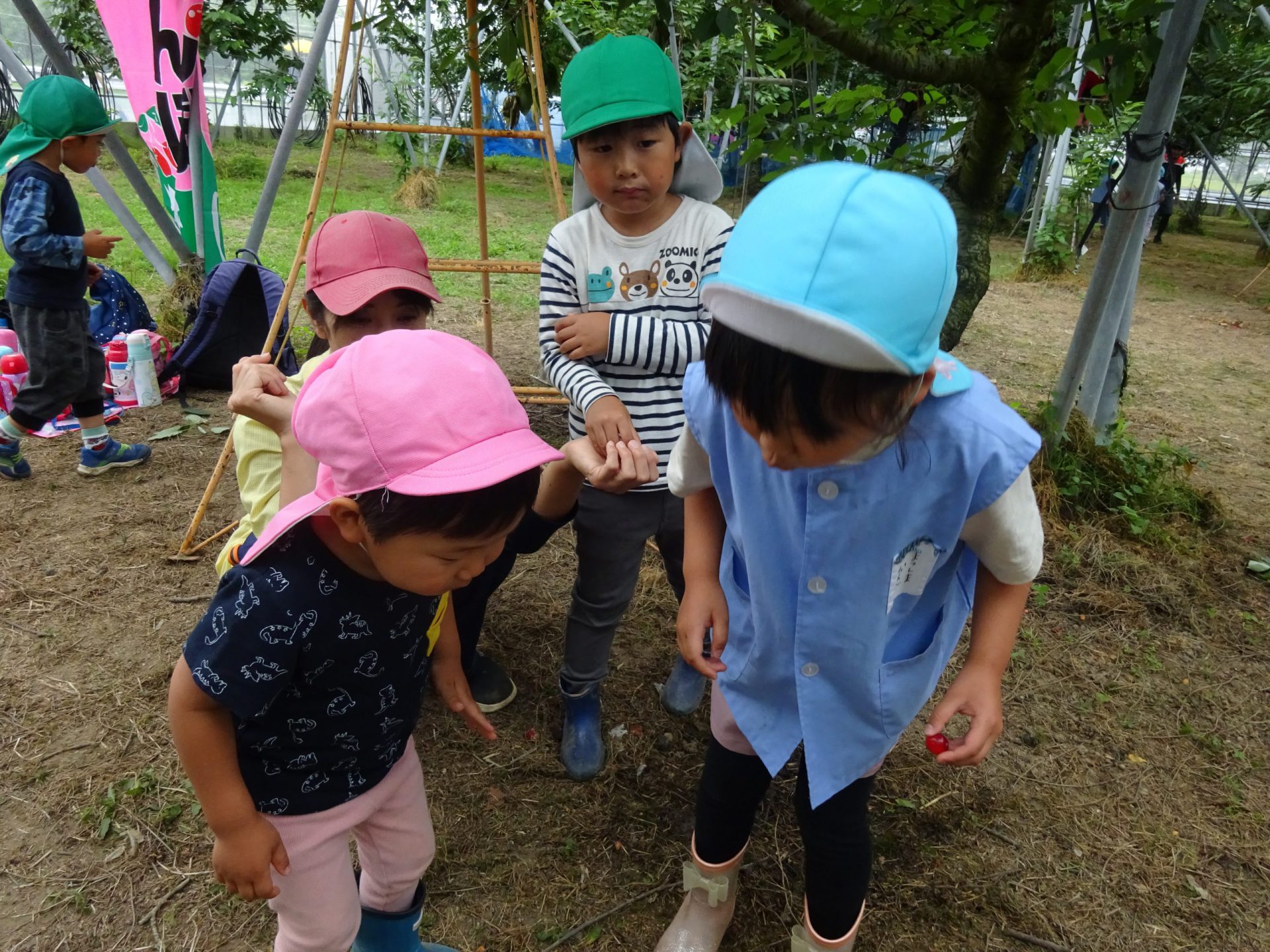 ・子どもたちは「開始」の合図でさっそく木に駆け寄り、採って食べて、種をペーッと吐き出していました。慣れてくるとどんどん自分で見つけ、友だちと一緒に採って見せ合ったり、食べたりして、千代保育園のお友だちとも関わる姿も見られました。