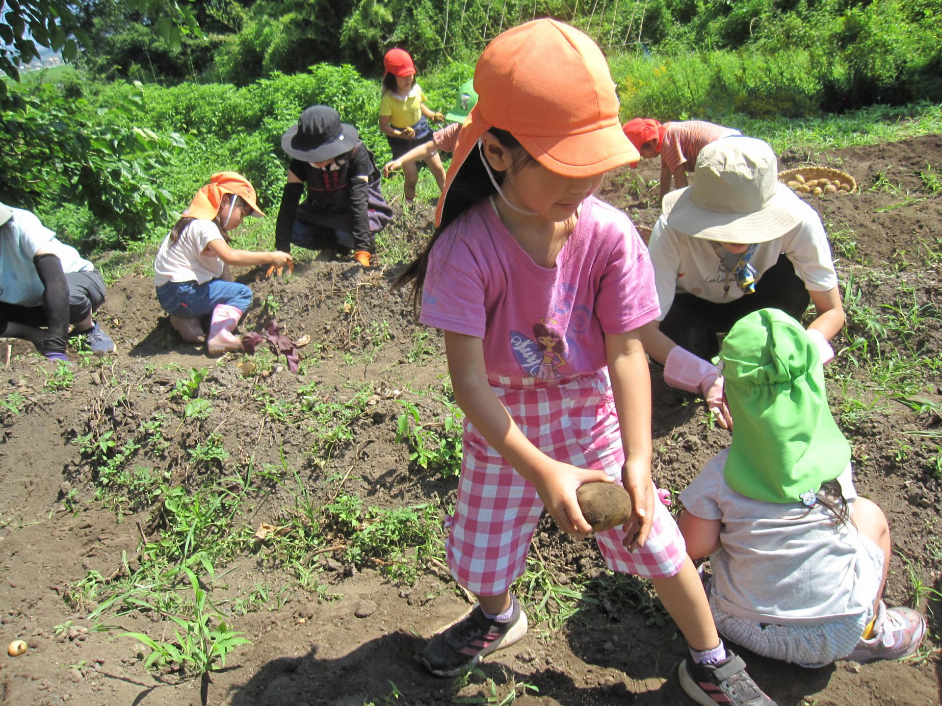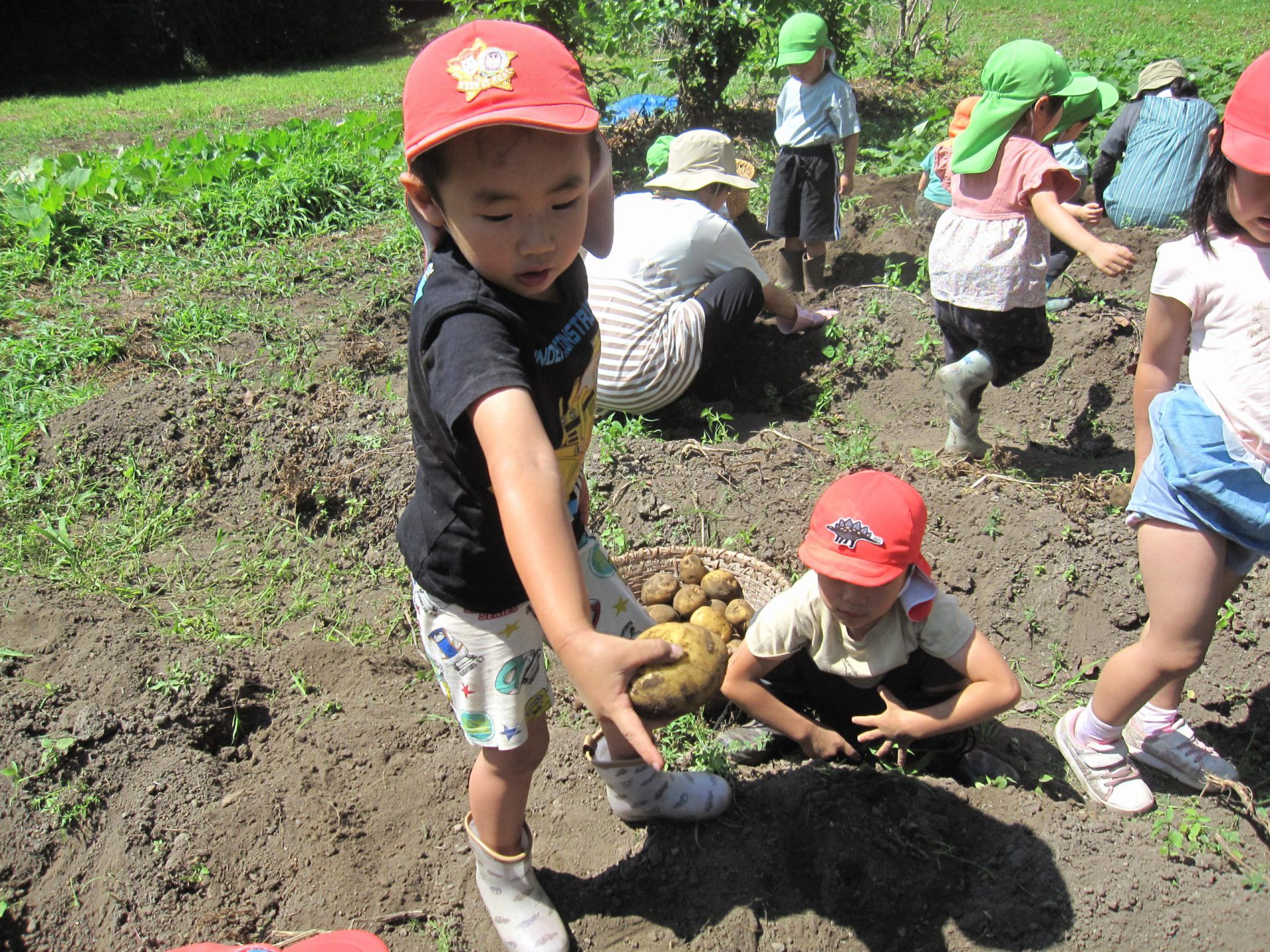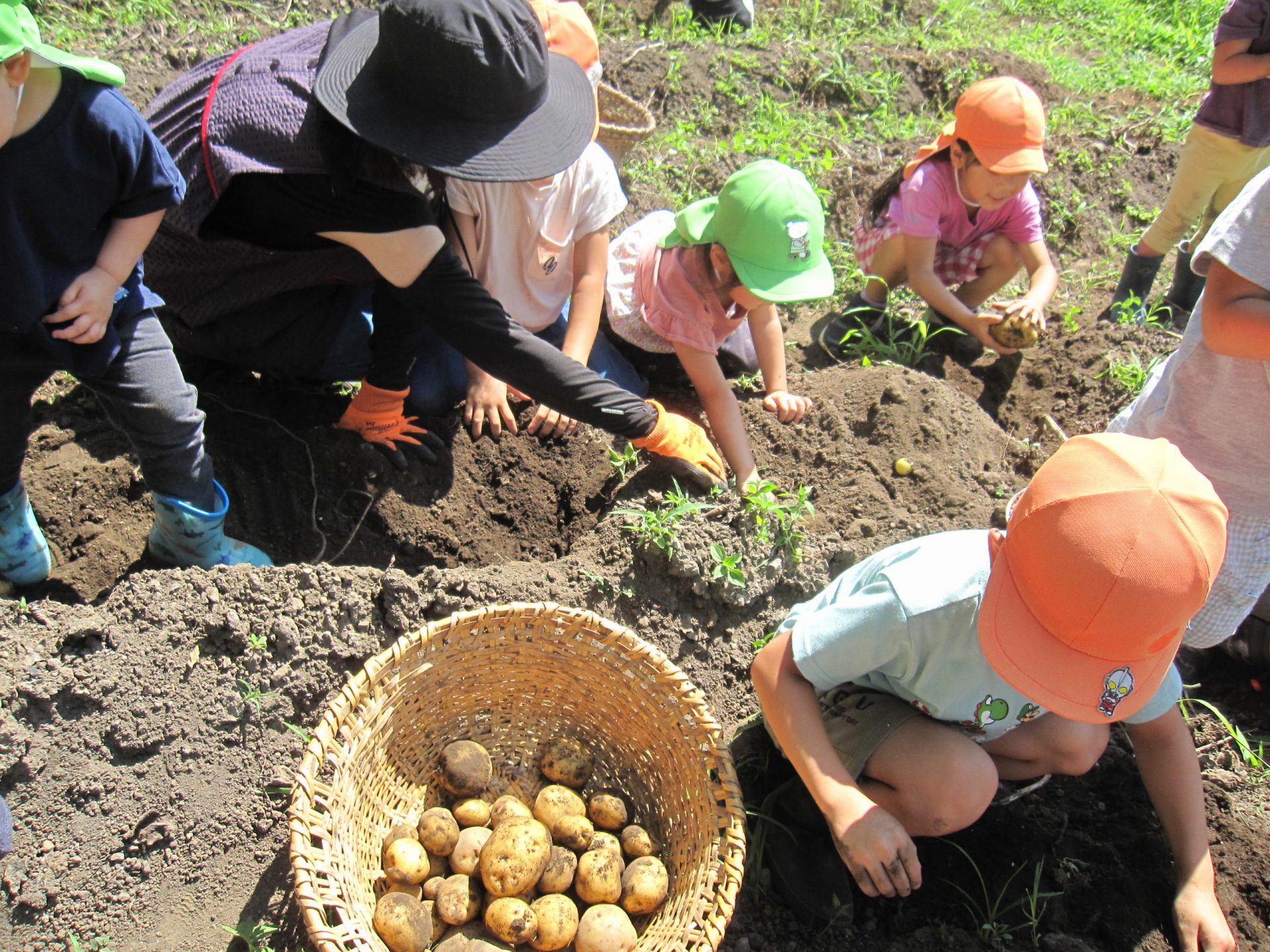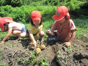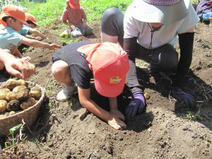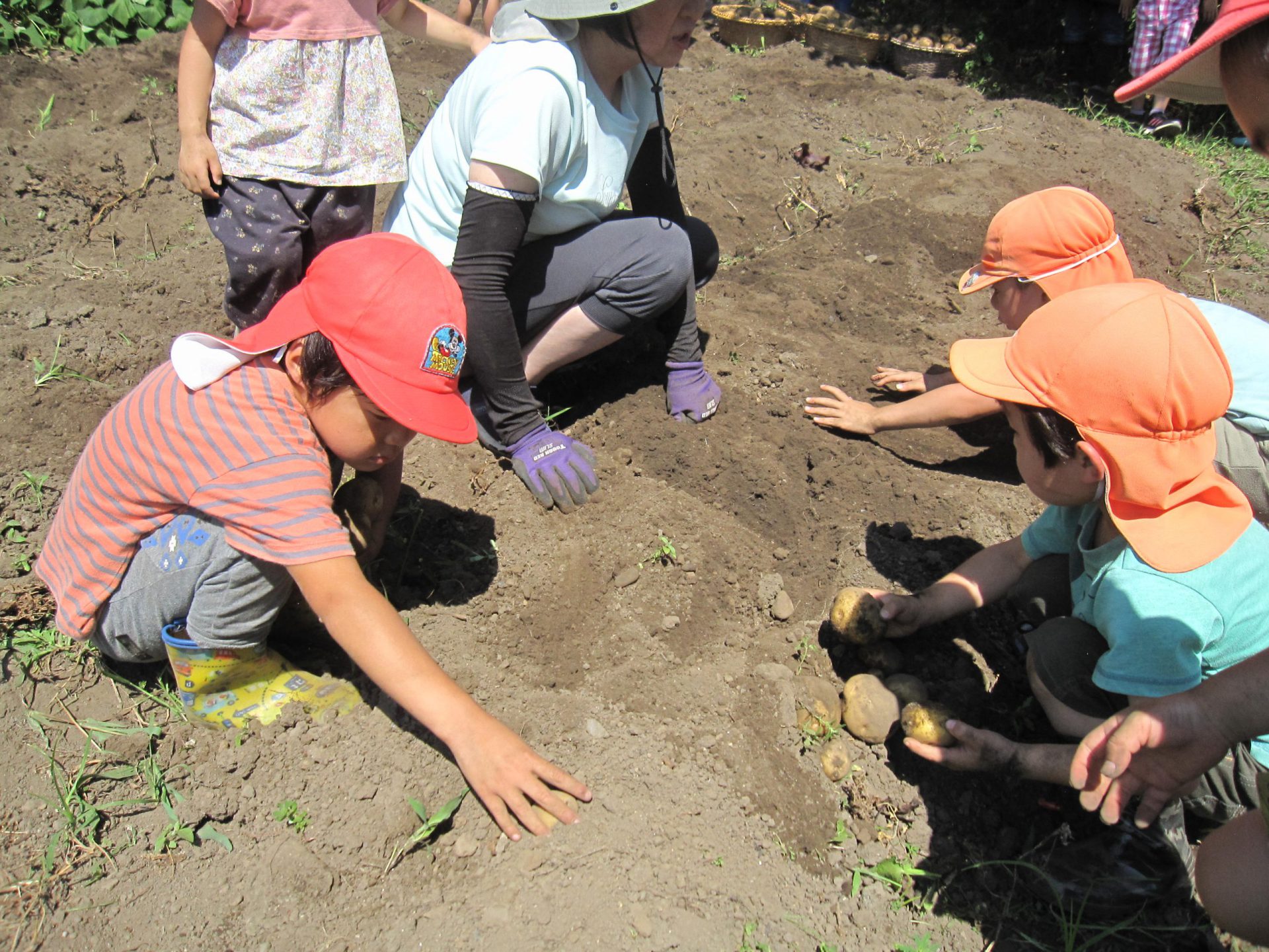 乾いた土を掘っていくとじゃがいもが顔を出し「あっ 出てきた!!」と、目を輝かせる子ども達。
