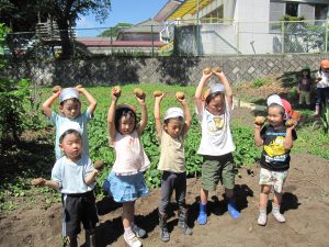 春に、ゆり組(5歳児)が種芋に土をかけ「大きくな~れ」と植え付けたじゃがいもは、どのくらい大きくなったでしょうか・・・