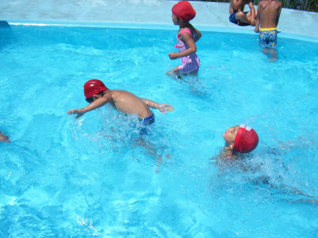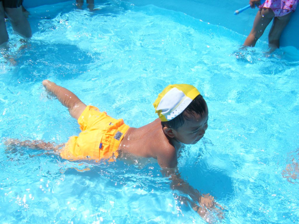 今年、大きいプールデビューをした年少さん。 広いプールを目の前に、「はやくはいりたいなぁ」「ドキドキするなぁ」「ちょっとこわいなぁ」…といろいろな気持ちを抱きながら順番を待っていました。