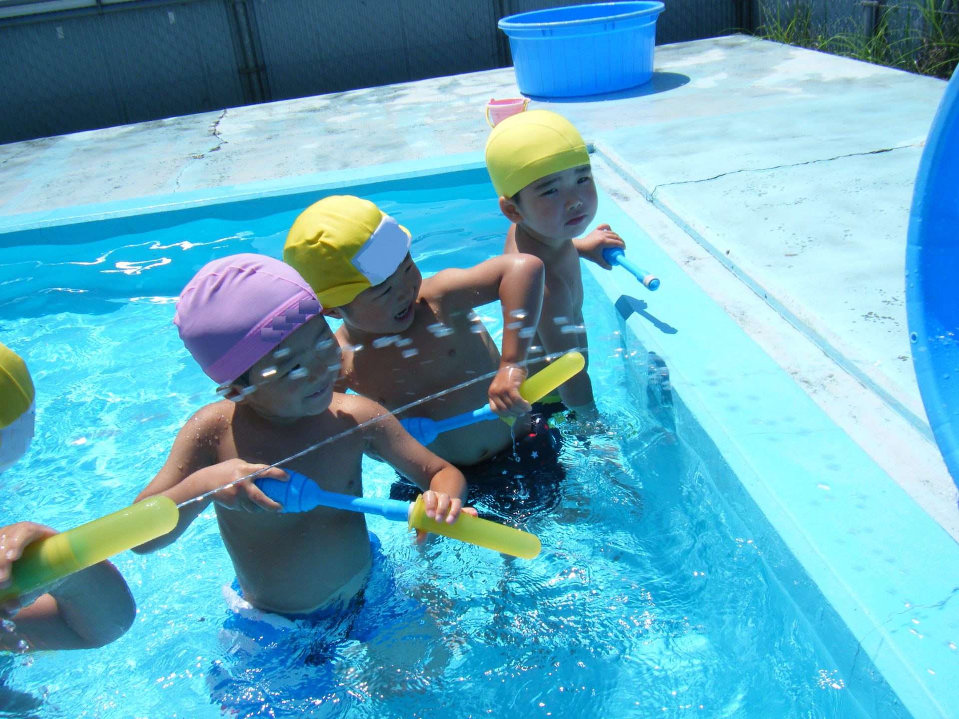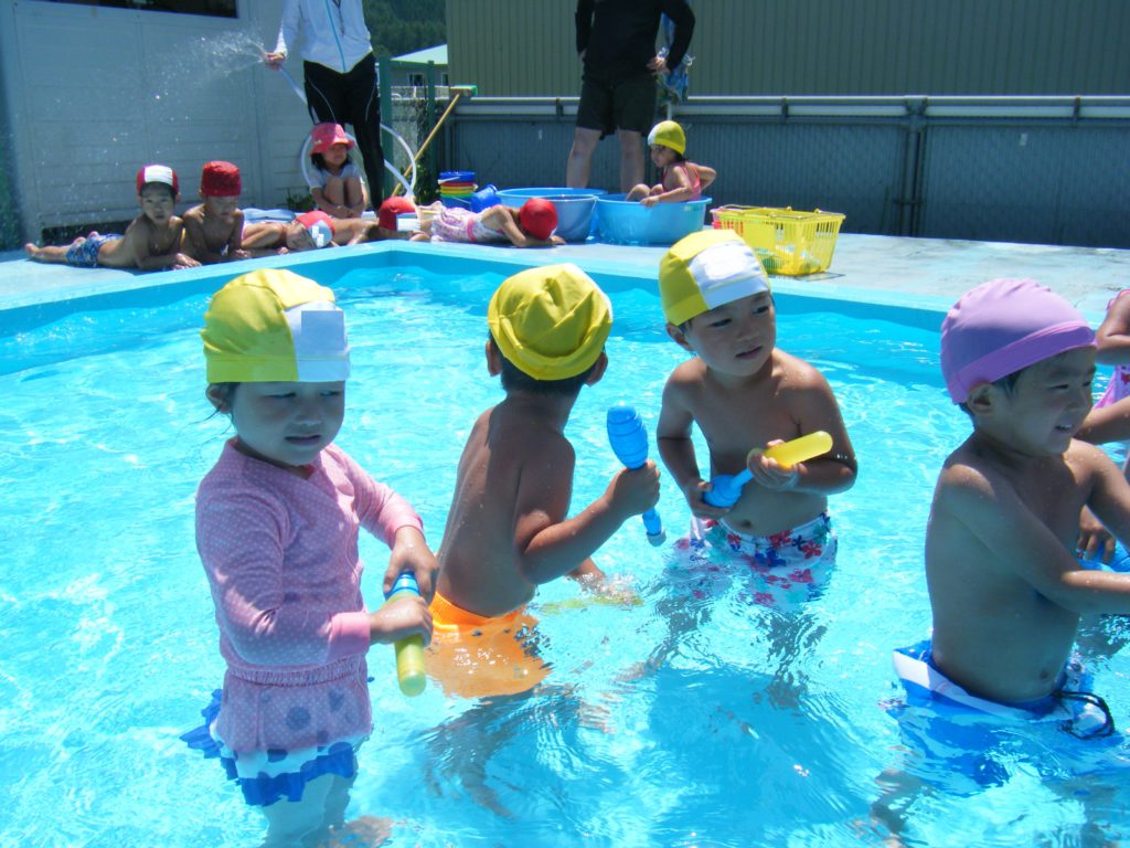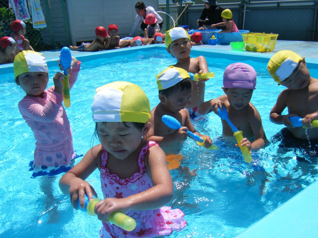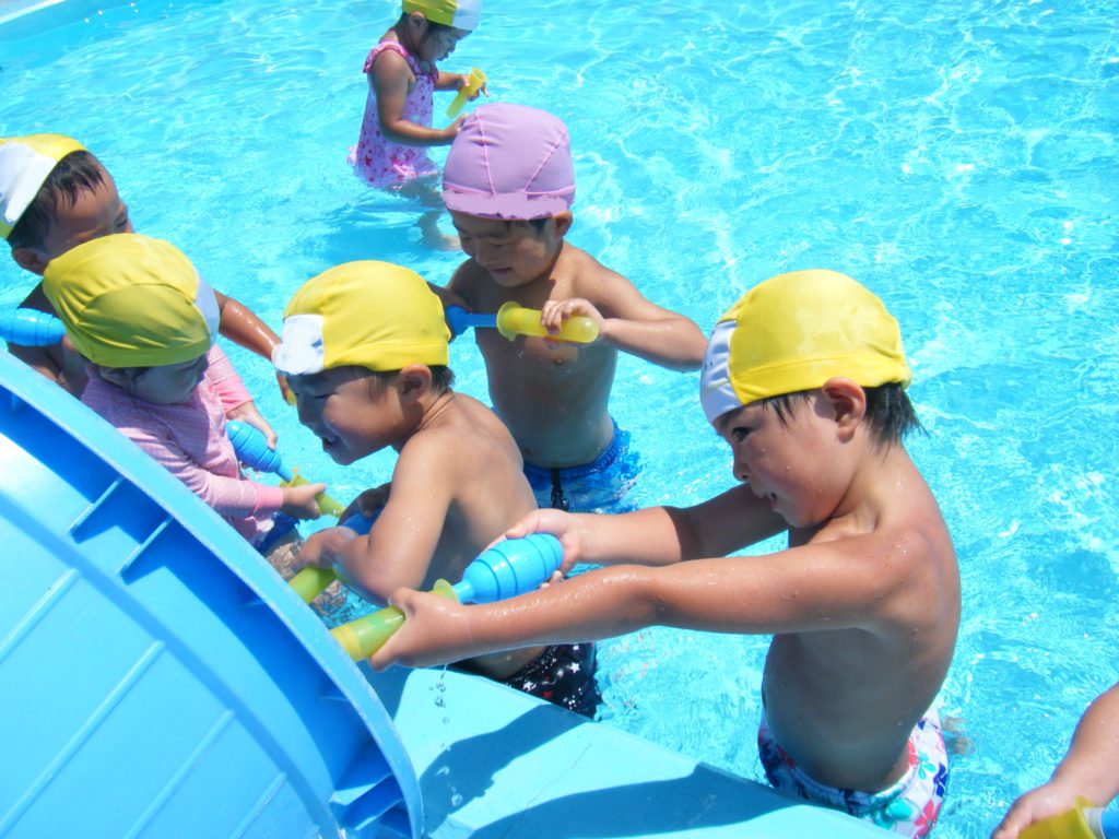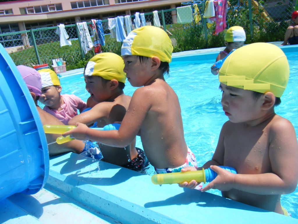「ワニさん歩きはこわいけど、水でっぽうだったら大丈夫!」と水でっぽうで遊んでいる時は顔に水がかかってもへっちゃらで思いっきり楽しんでいる子がいました。水遊びの中で夢中になって楽しんだり、好きな遊びを見つけてほしいなと思います。