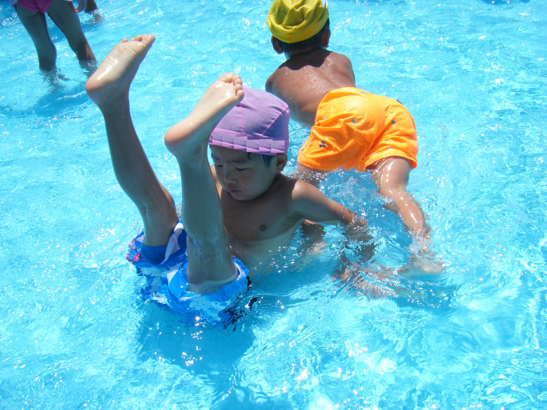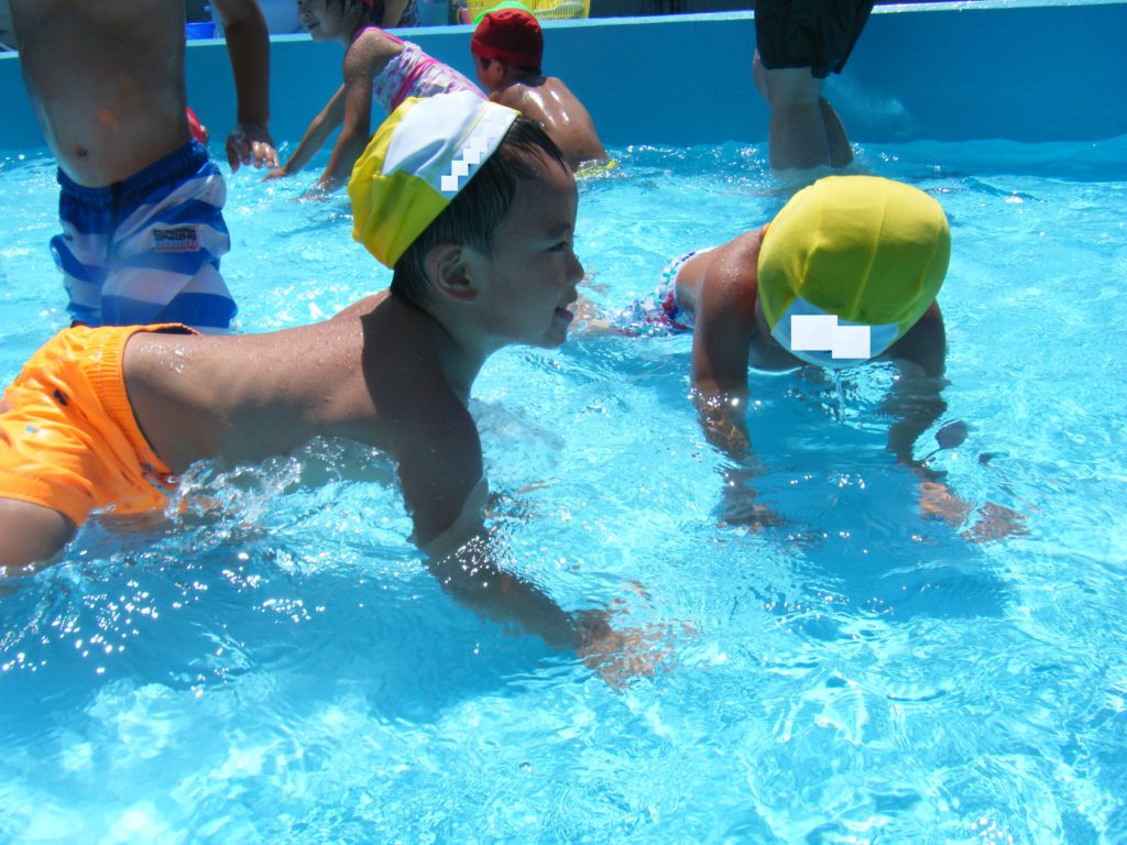 朝「今日はプール入れるかなぁ?」と子どもたちに声を掛けると、「プール入ろう!!」「やったー!^^」という子がいたり、「今日はちょっと入りたくないなぁ…」という子もいたり、、その日のコンディションによって反応はさまざま。一人ひとりの様子に合わせて無理なく楽しんでいきたいと思っています。